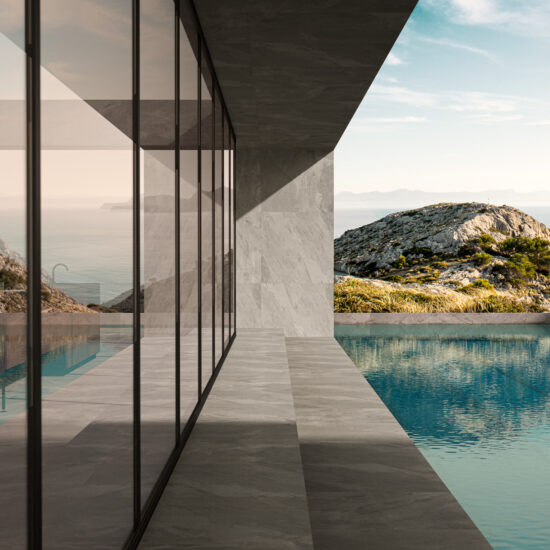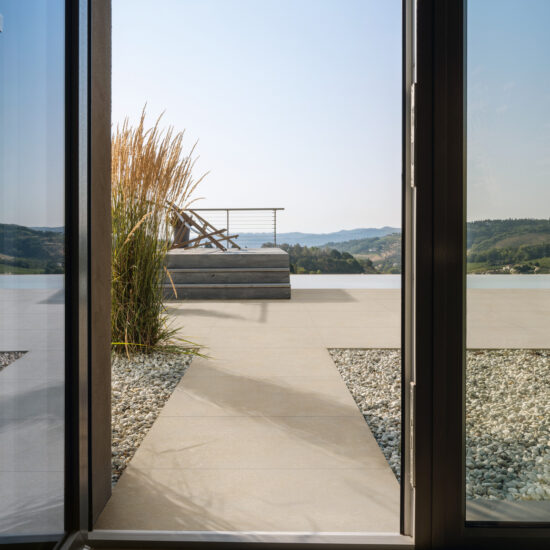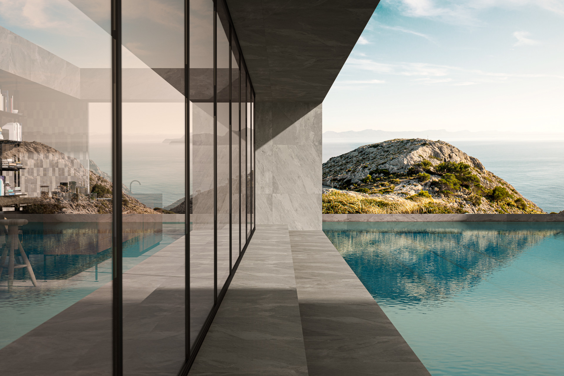 Les gris chauds, sable et taupes de la palette sont parfaits pour créer des espaces coordonnés entre l’intérieur et l’extérieur : à cet égard, nous conseillons le grès imitation pierre avec finitions antidérapantes, une solution particulièrement adaptée aux vérandas et aux bords de piscine, qui garantit à la fois style et sécurité.