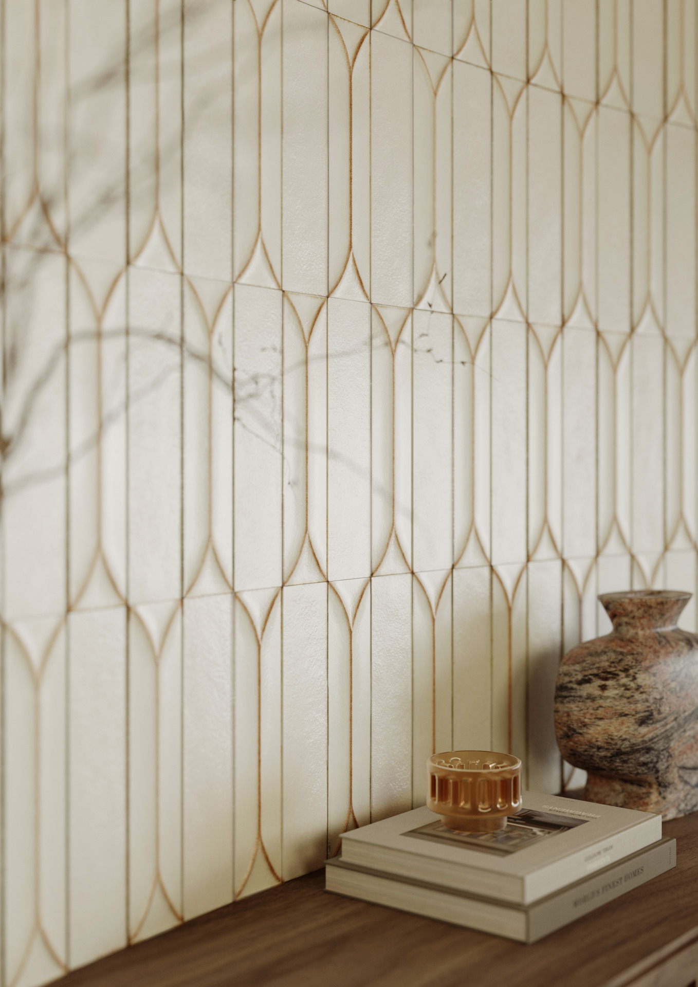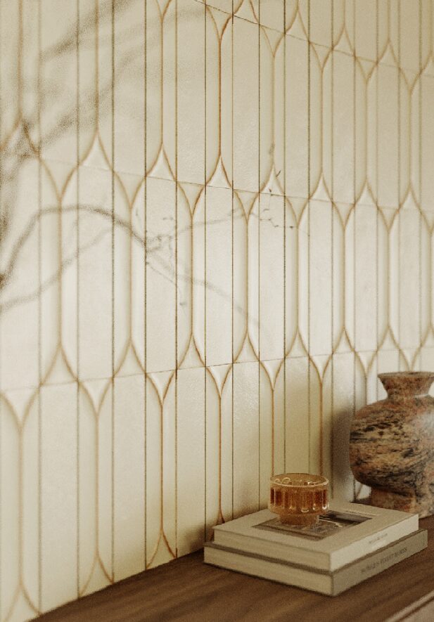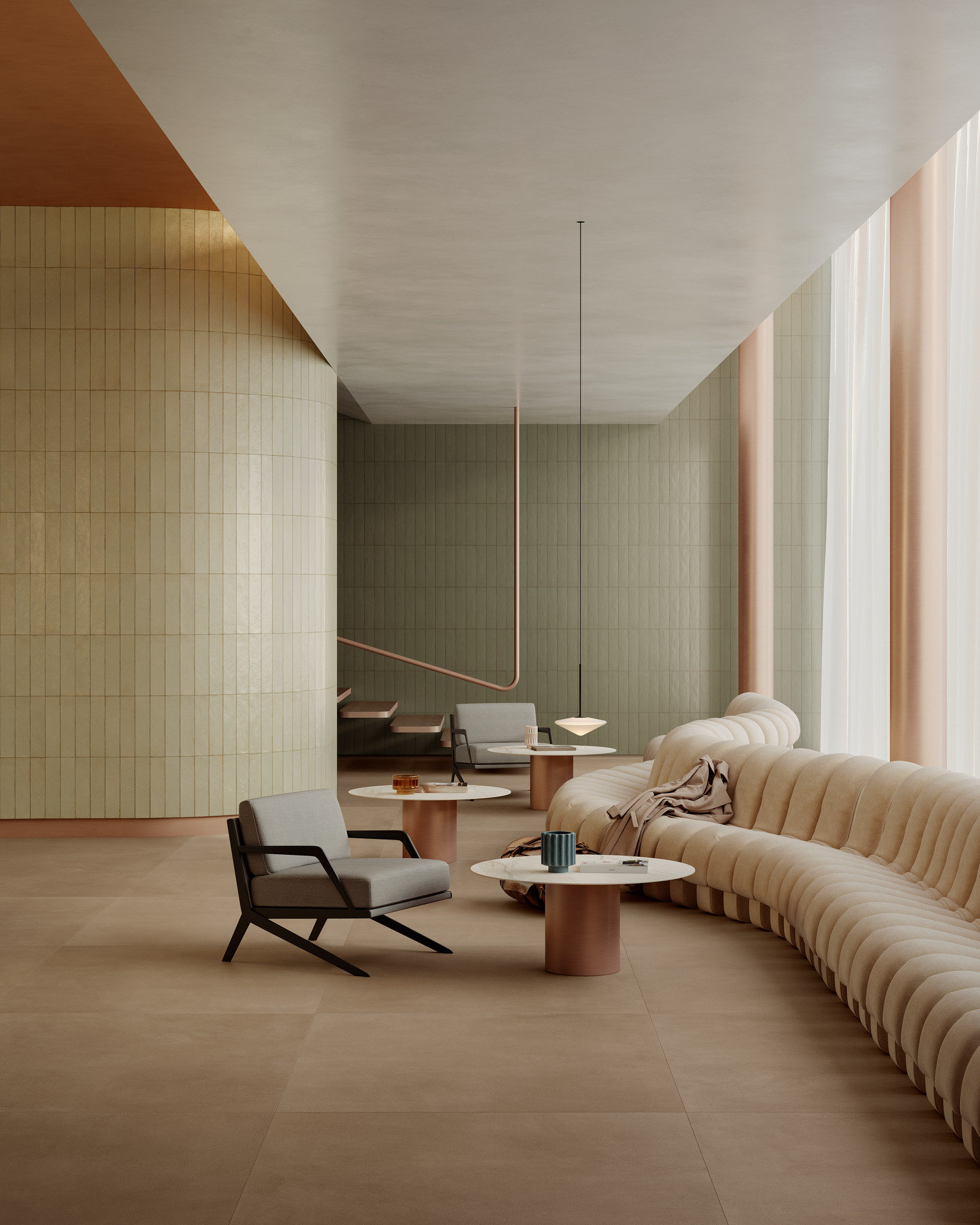 Le choix de volumes curvilignes découle de la valorisation de la collection de céramiques en émaux et terre rouge Crogiolo Terramater, dont le petit format permet de recouvrir des surfaces concaves/convexes. Les applications montrent comment les carreaux deviennent un élément de composition architecturale : des murs autoportants et des cloisons qui organisent l’espace, accentués par l’alternance de surface lisse et de décoration en losanges. L’image met également en évidence les caractéristiques de réflexion de la lumière de Terramater : dans le même mur courbé en arrière-plan, on peut voir le reflet plus net et marqué de l’éclairage artificiel provenant du faux plafond et la réfraction plus douce et lavée imprimée par la lumière naturelle.