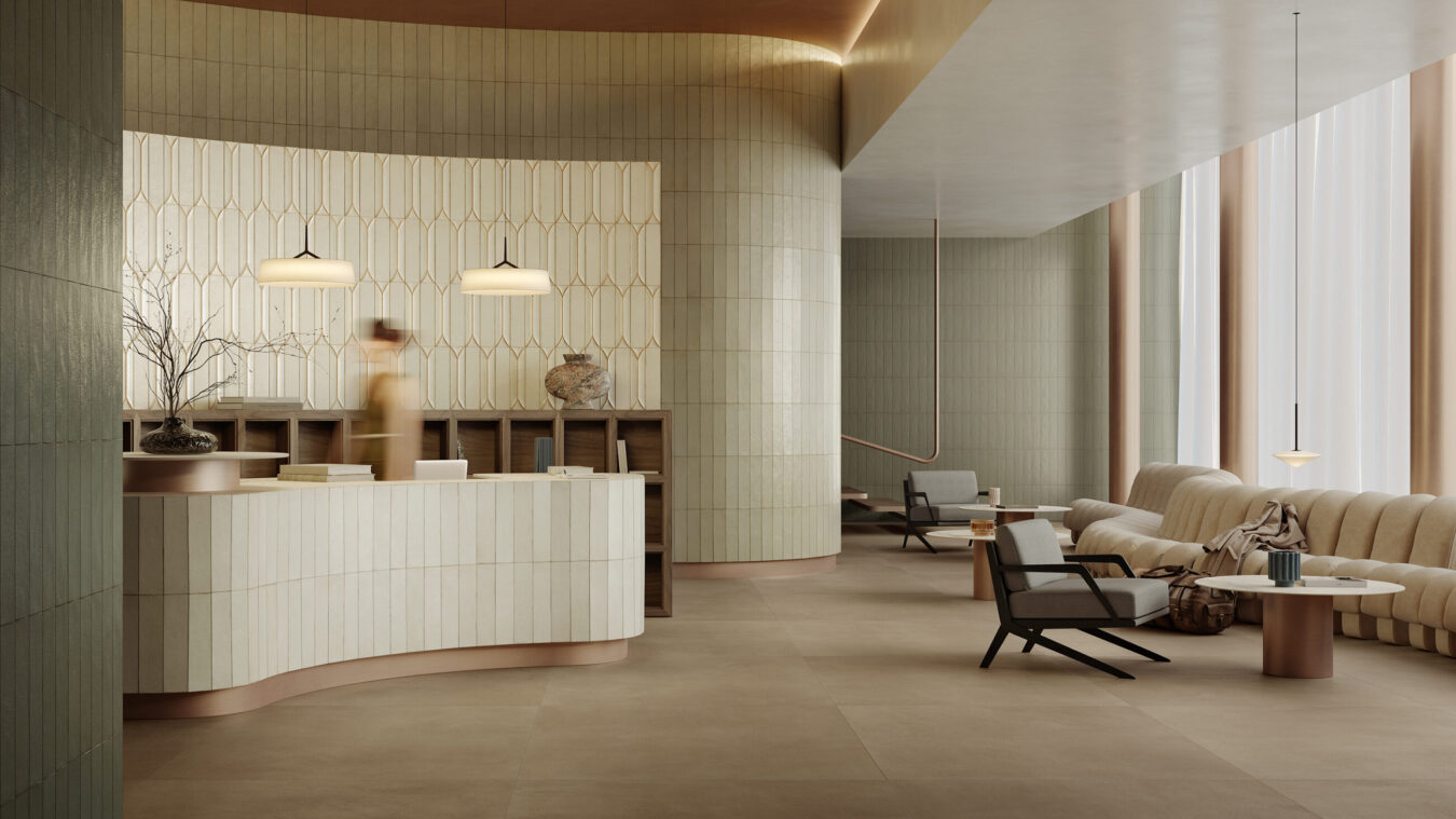 Le volume de la réception présente une double courbure qui valorise la pose des carreaux et une plinthe en métal, matériau qui se répète dans les colonnes, les bases des tables et au plafond. Le changement de matériaux – le métal plus réfléchissant et le bois plus chaud et poreux de la bibliothèque à l’arrière – souligne la capacité des collections Terramater et Slow, posées au sol, à dialoguer avec des finitions, textures et couleurs différentes.