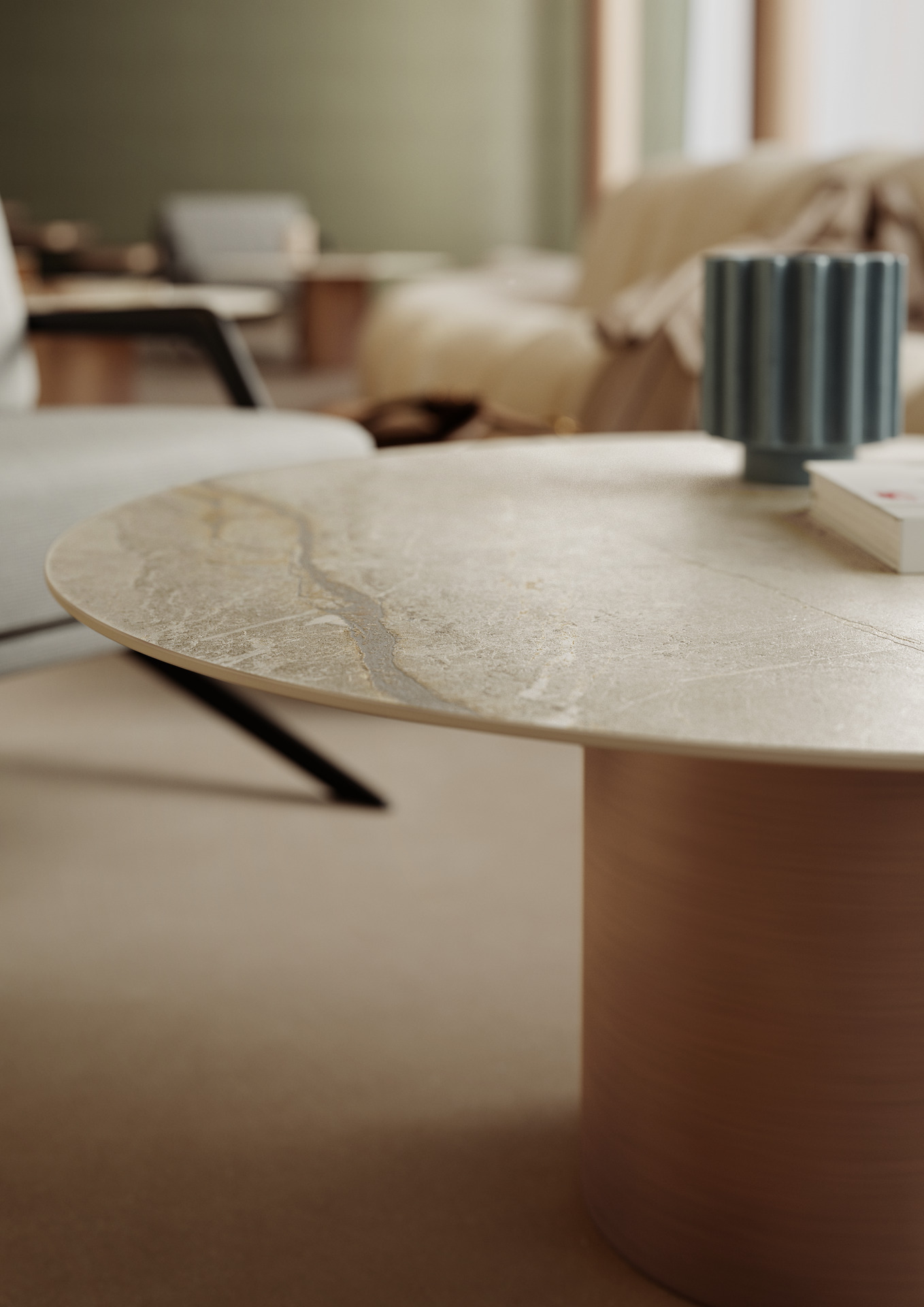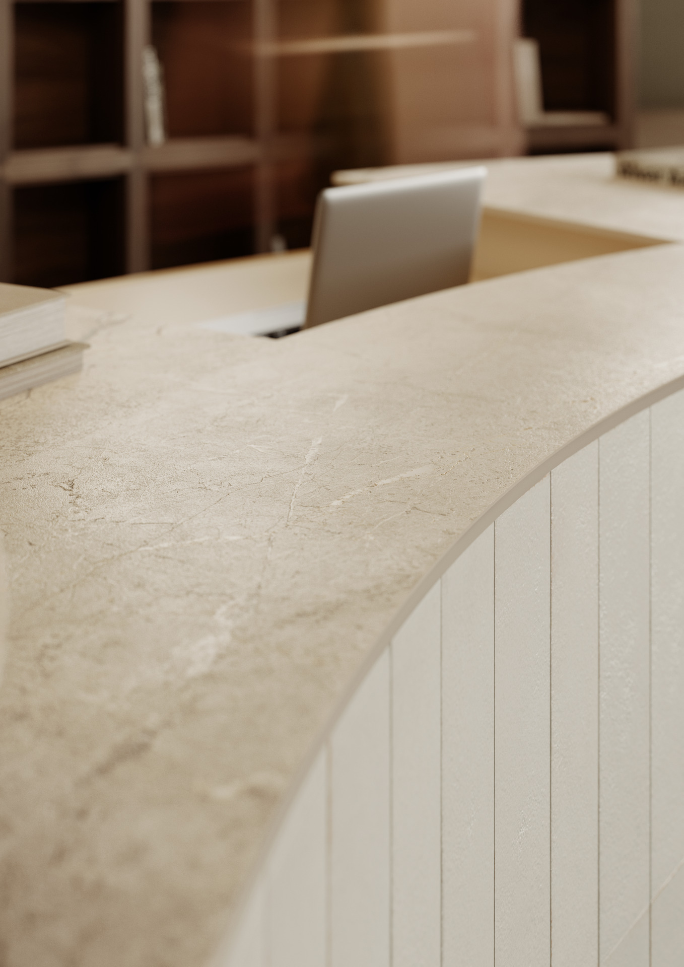 Le comptoir de la réception présente le top recouvert de dalles de la collection The Top Stone Look Silver Root avec un effet pierre naturelle. La même finition est utilisée sur les plateaux circulaires des tables, montrant la polyvalence du matériau céramique dans la création d’éléments de mobilier. La couleur choisie pour la dalle est la plus claire (White) pour s’accorder avec les tons neutres et chauds qui caractérisent à la fois l’espace et les meubles, tous accordés à la sensation d’accueil que l’environnement confère.