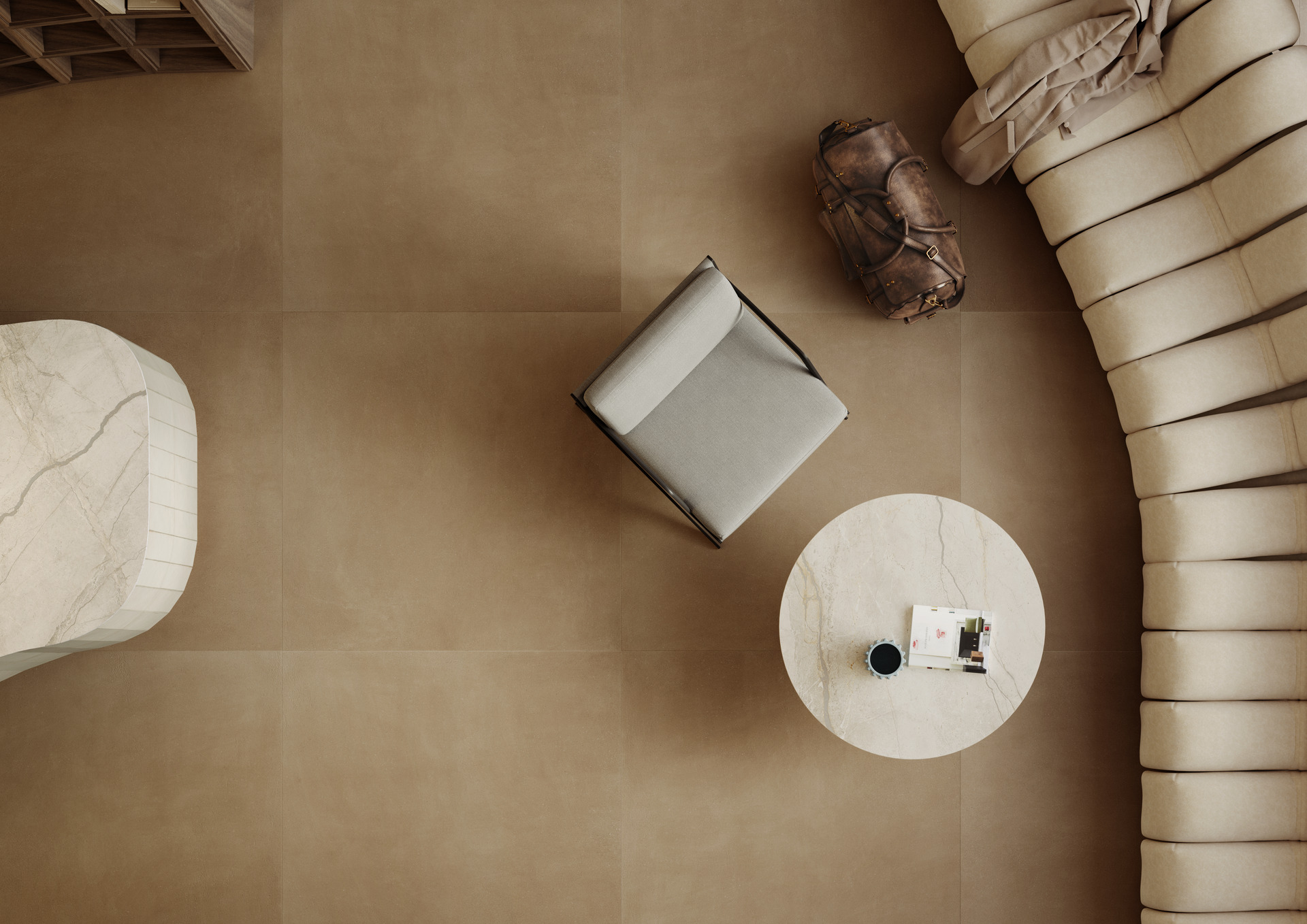 Enfin, la large perspective sur le hall qui caractérise l’ADV met en avant l’autre protagoniste de l’image : la collection Slow, dont les tons chauds rappellent la tradition de la terre cuite typique des pays méditerranéens, mais dont le grand format (120x120cm) rend le matériau contemporain.