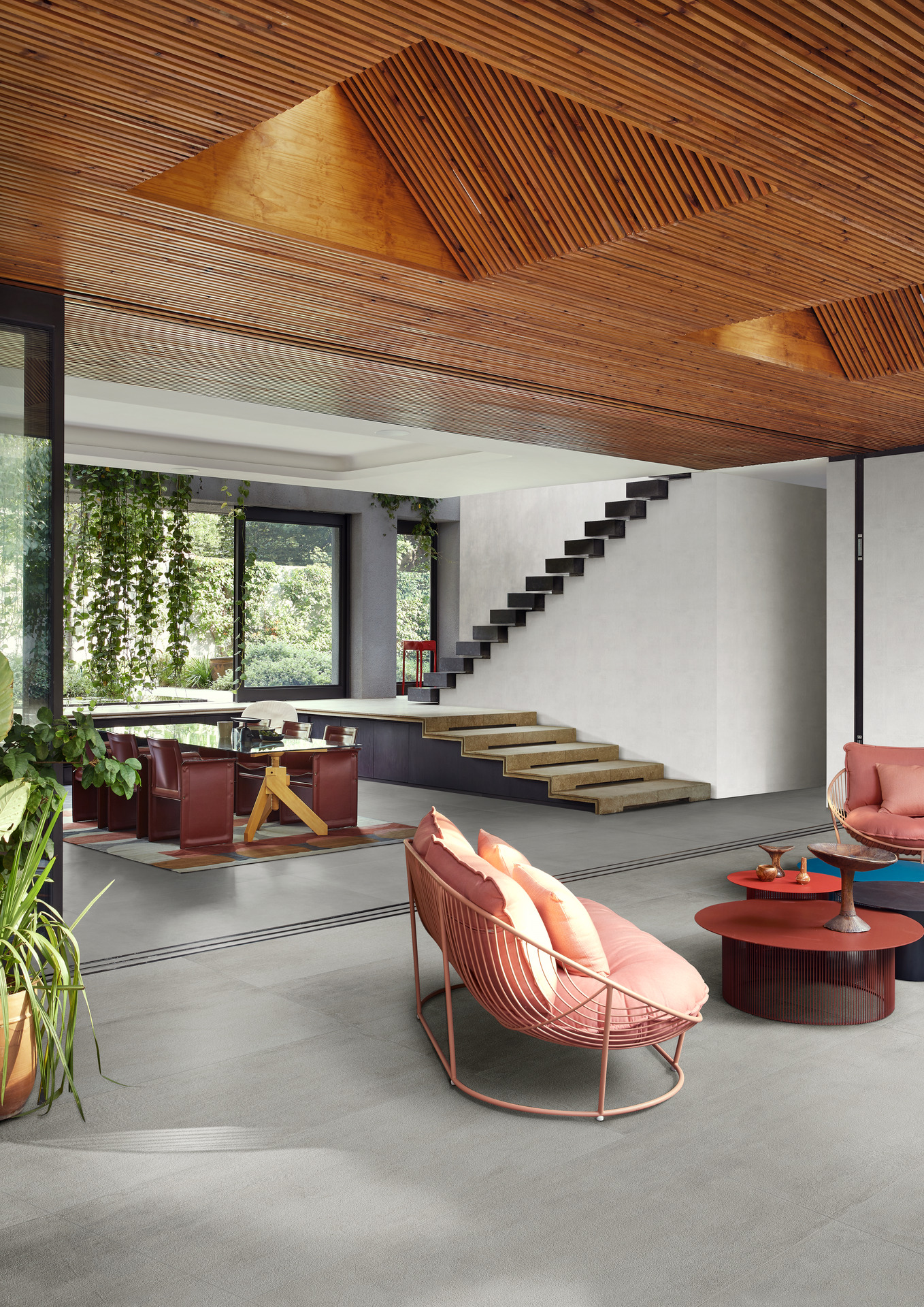 Autre tendance ayant le vent en poupe : le minimalisme chaud, qui associe des lignes épurées à des tons neutres et reposants. Pour obtenir cet effet, on choisira des sols clairs imitation pierre ou ciment comme ceux de la collection Mystone Berici ou Slow Cold, que l’on associera à des meubles en bois et des détails en tissu naturel.