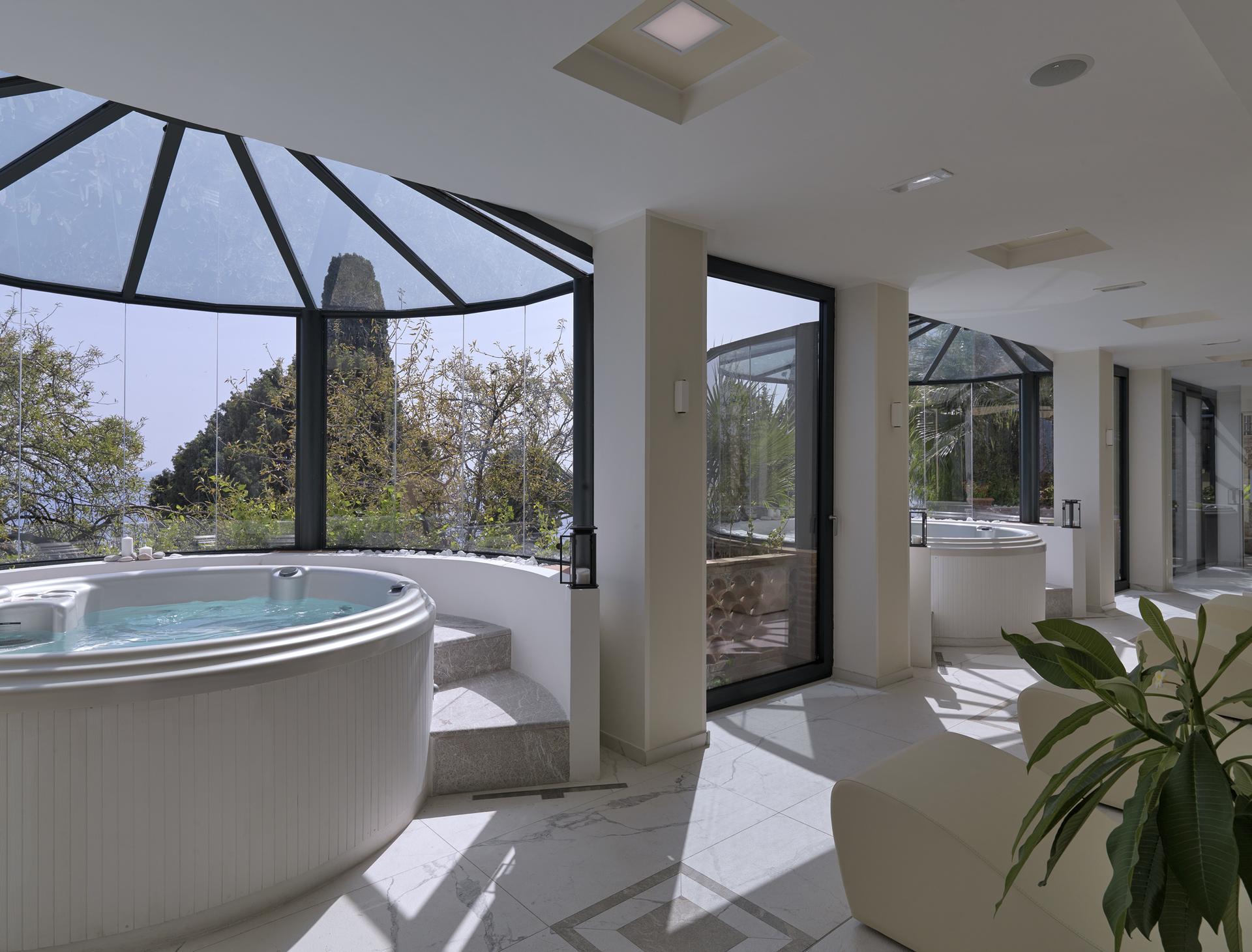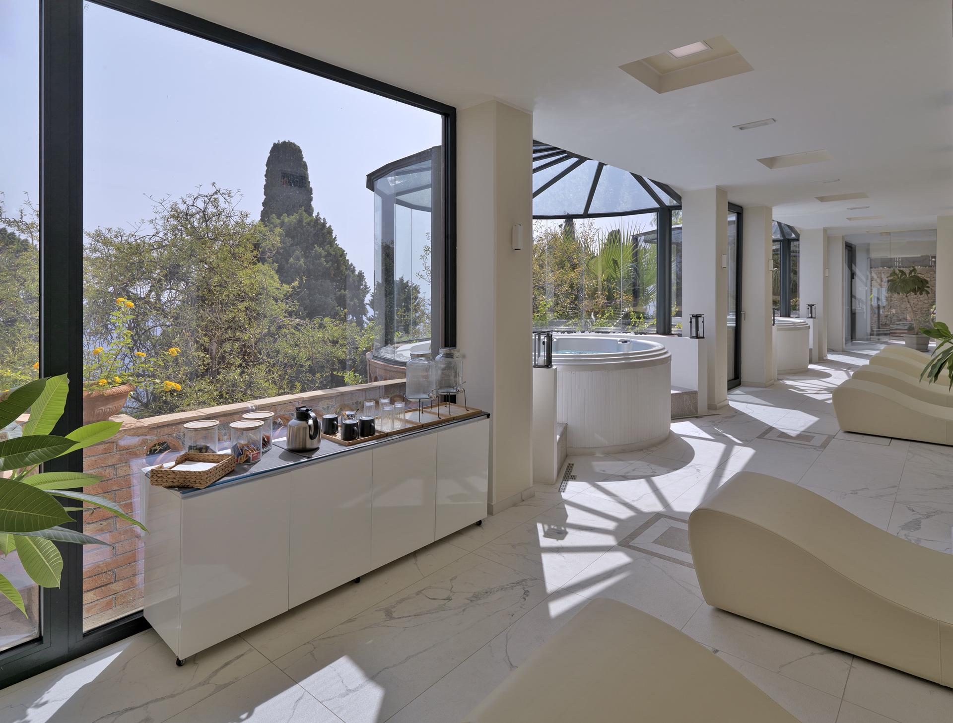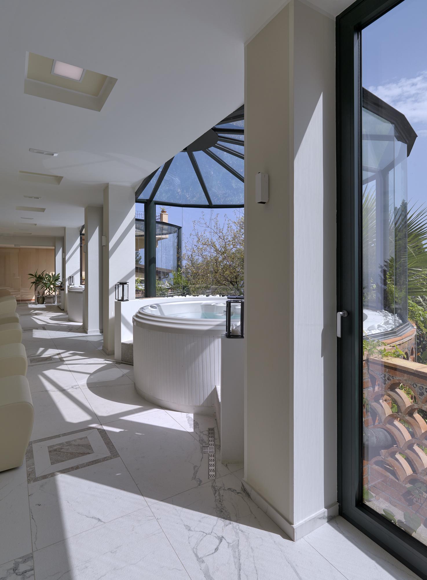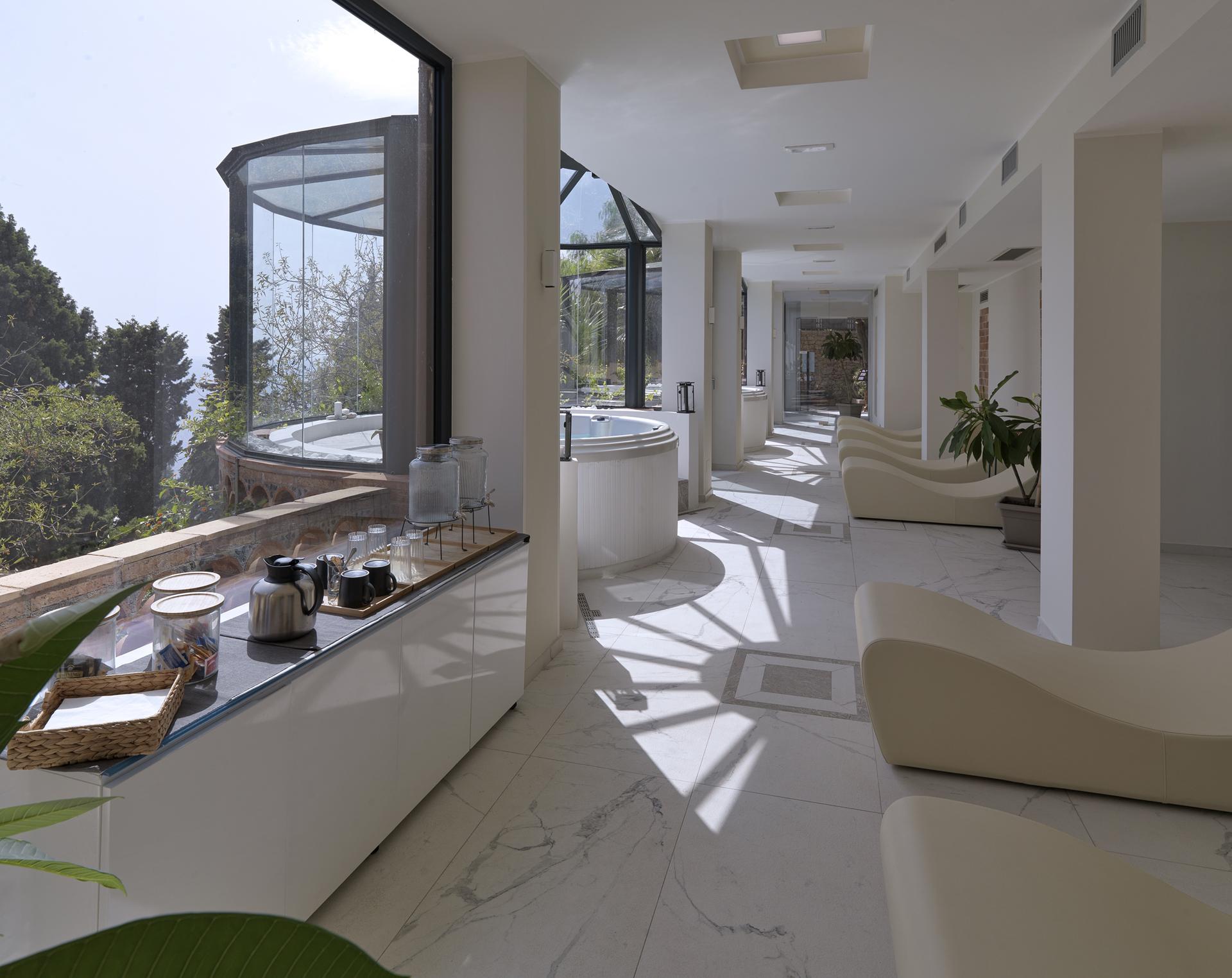À Taormine, le Grand Hotel San Pietro possède un spa avec vue sur un paysage splendide. Des revêtements de sol imitation marbre amplifiant la lumière, des murs rappelant les roches karstiques et des murs en briques de sel recréent un effet naturel propice à la relaxation.