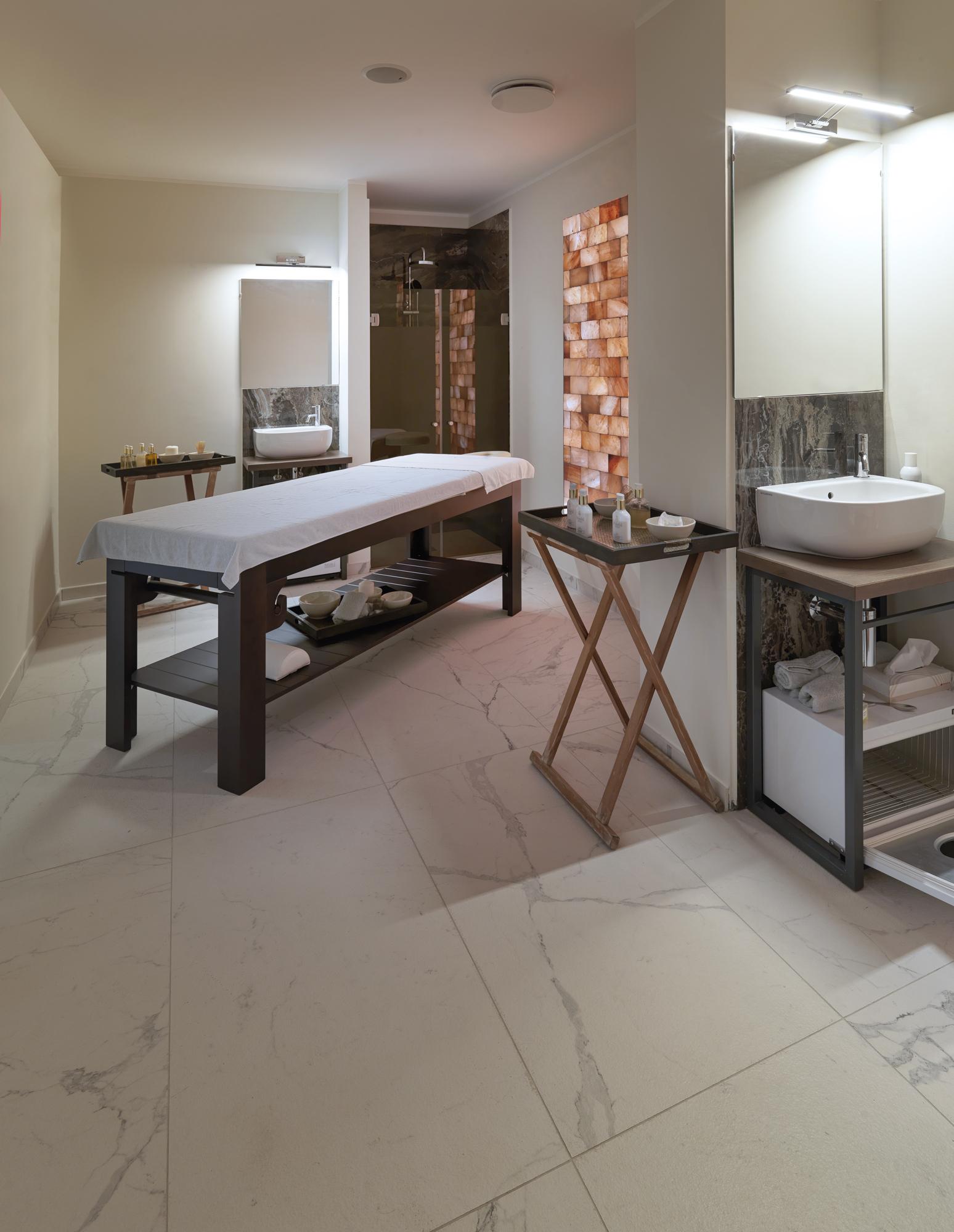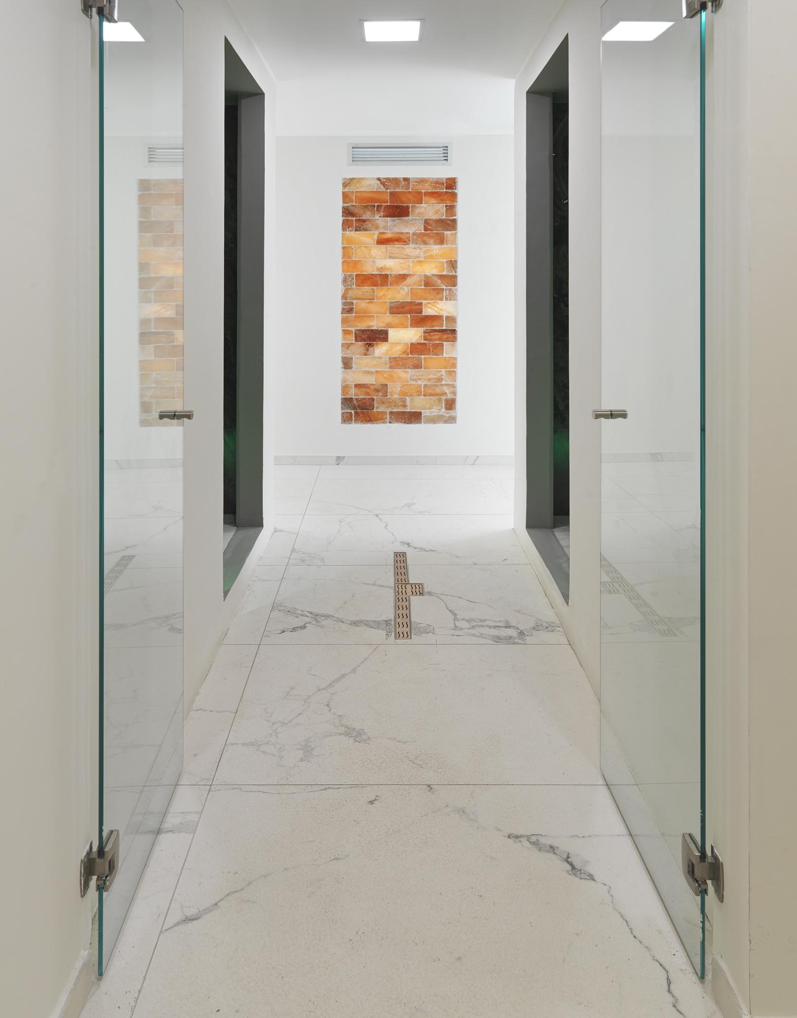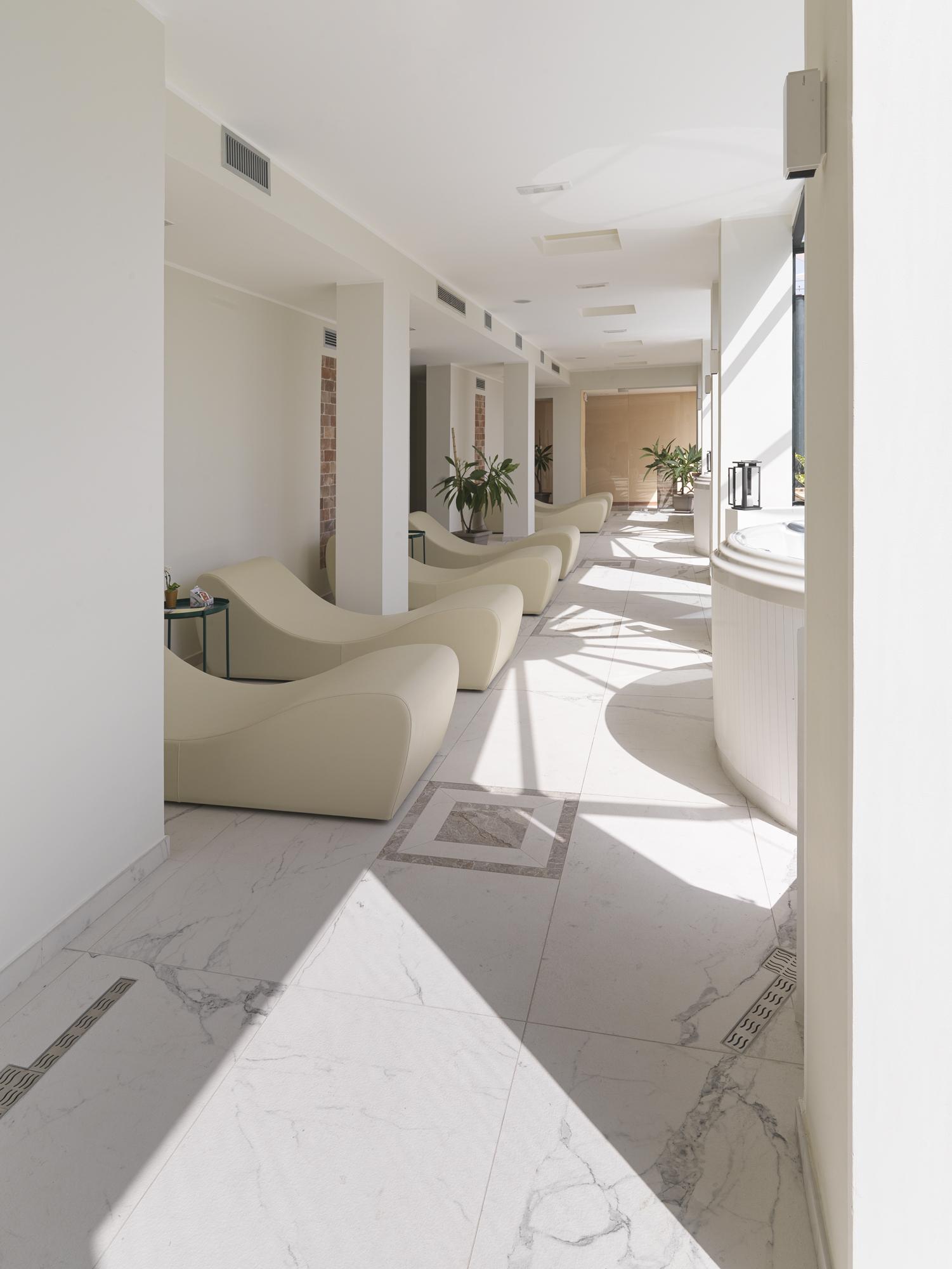 Pour donner rythme et effet matière à la rangée de lits bains de soleil, nous avons choisi d'utiliser des murs en briques de sel qui, translucides, font pénétrer la lumière aussi dans la partie arrière plus dissimulée : les salles de massage. Ces salles, même si elles sont isolées, donnent sur l'autre face des murs de sel, contribuant ainsi à créer une ambiance plus salubre, plus belle et plus relaxante. À l'arrière se trouvent également les vestiaires et les toilettes.