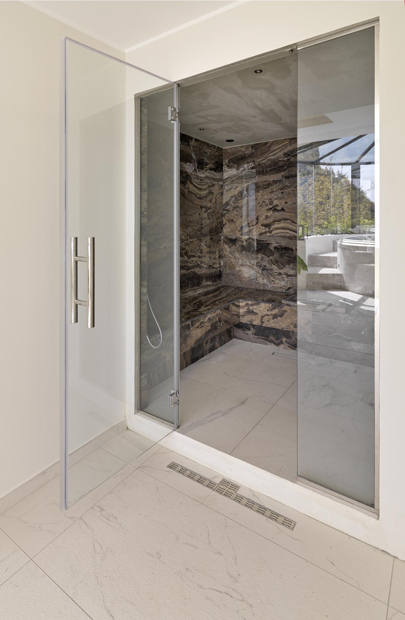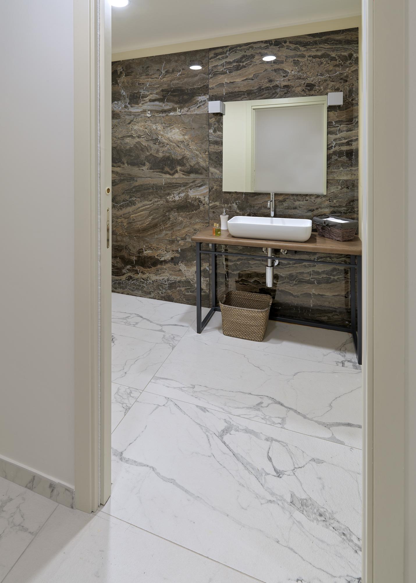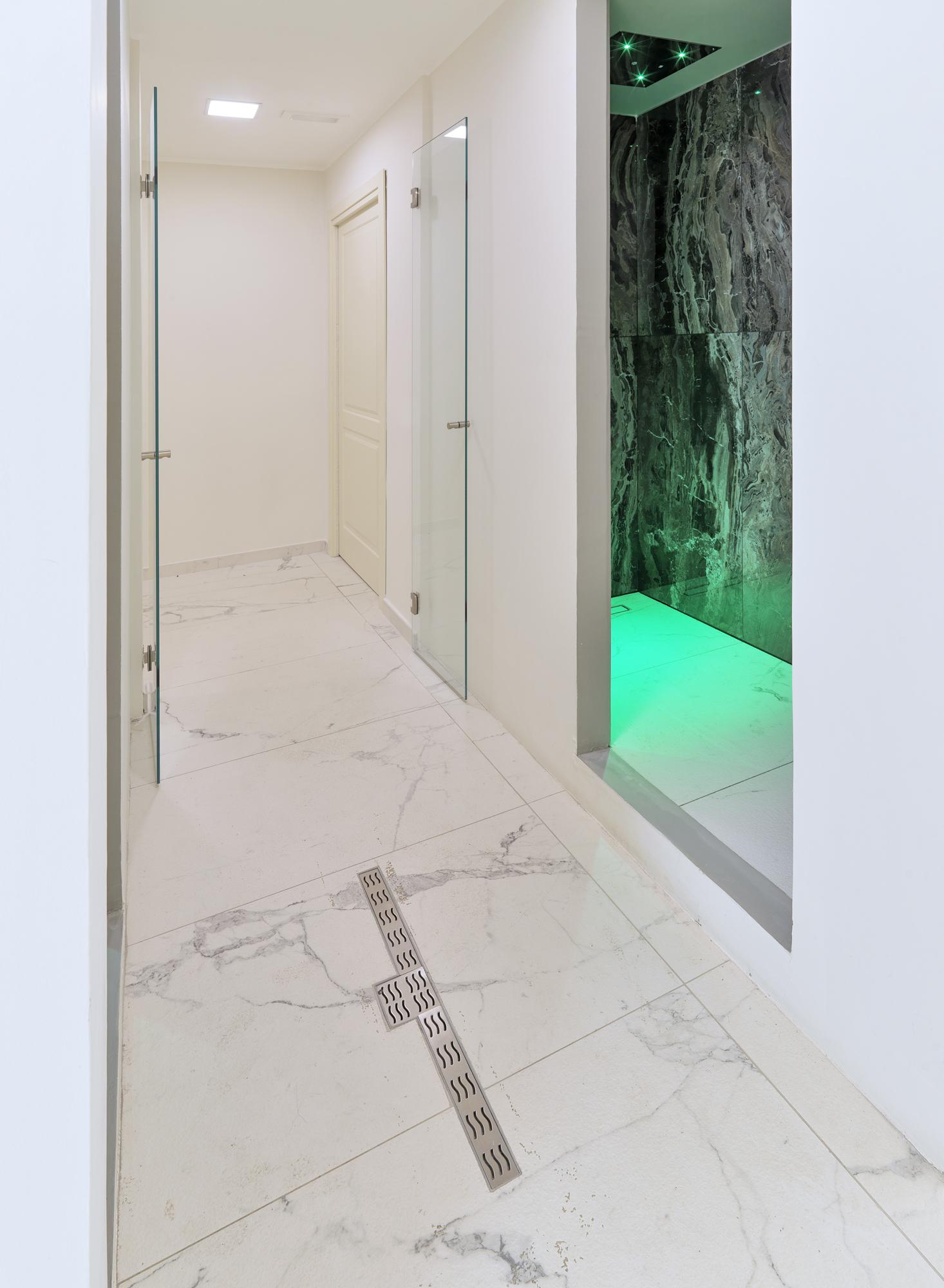 Nous avons opté pour Allmarble Frappuccino lux e Allmarble Saint Laurent lux (60×120 cm) pour habiller les murs dans les toilettes, le bain turc et la douche émotionnelle.