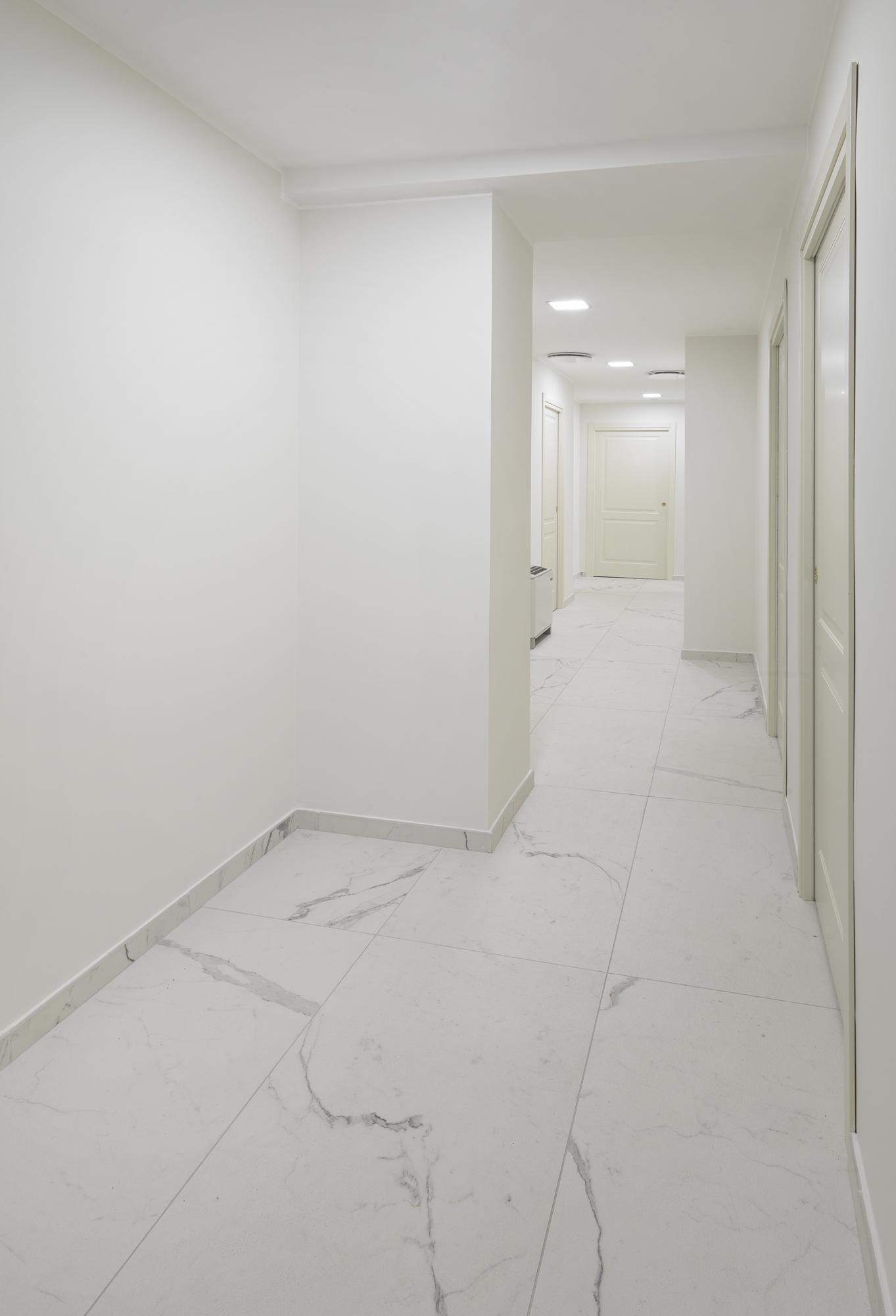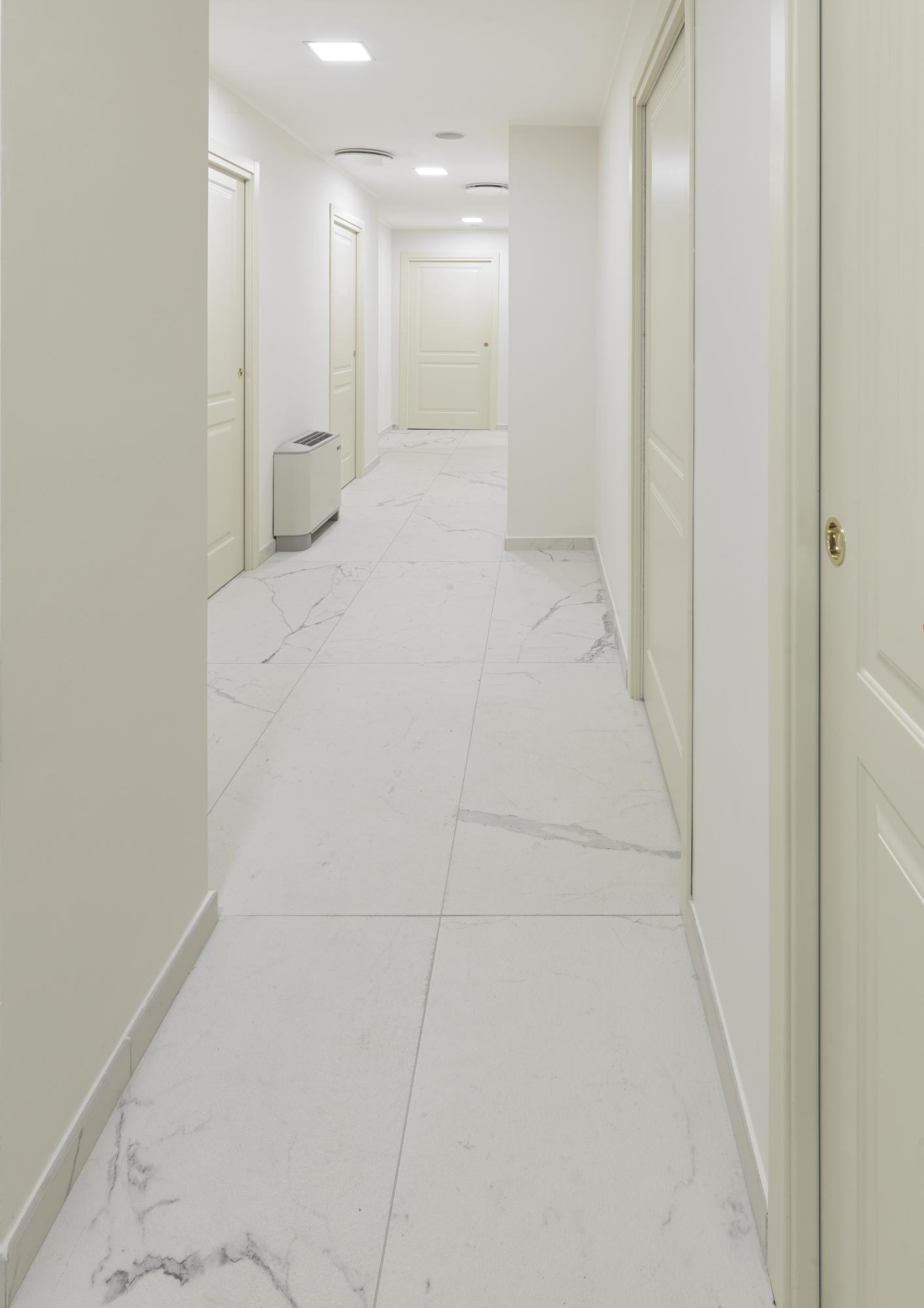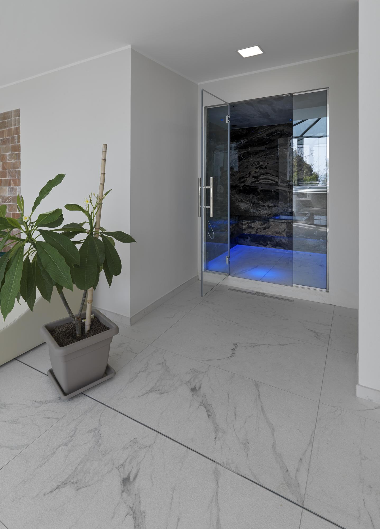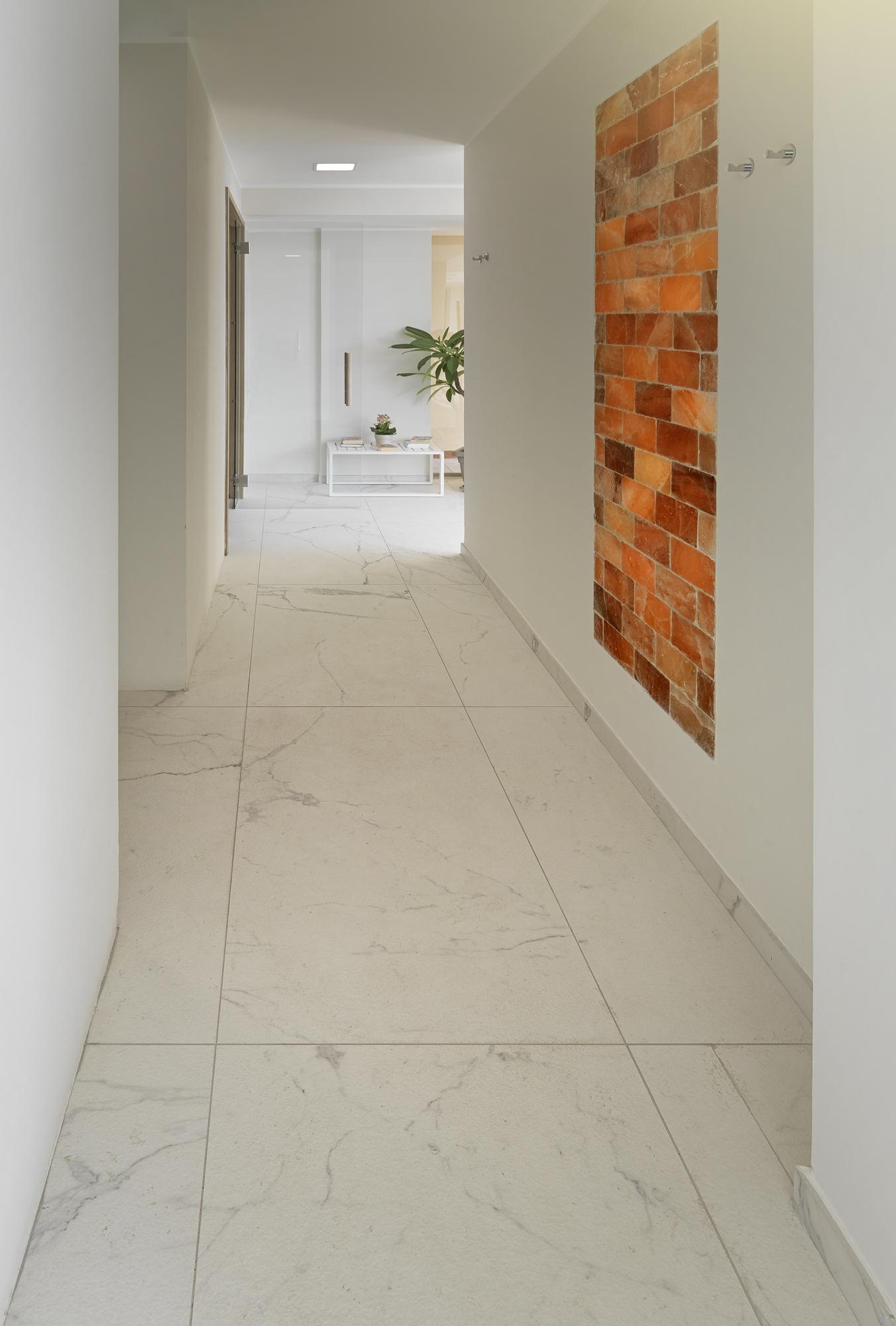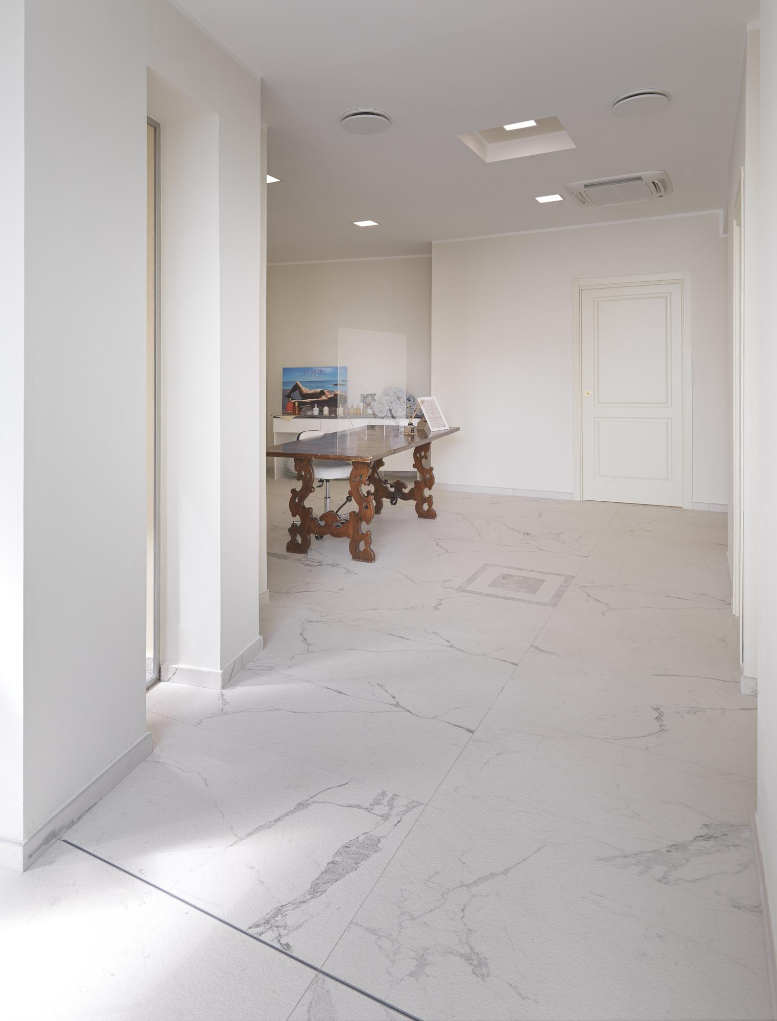 La déco presque total white. Les dalles en grès cérame Allmarble Statuario structuré de Marazzi, en format 60×120 cm, réfléchissent la lumière naturelle qui pénètre généreusement par les grandes fenêtres. Pour donner de la cadence dans la zone donnant sur le paysage, nous avons composé des panneaux décoratifs avec deux finitions différentes d'Allmarble Lasa, lux et satinée, découpés et posés au format 60×120 cm. « Les grandes dalles m'ont permis de créer une ambiance élégante, tout en conservant les propriétés mécaniques et hygiéniques nécessaires pour ce genre d'application. De plus, la pose au sol de la version Allmarble structurée a garanti l'antiglissance et l'effet naturel que je voulais. »