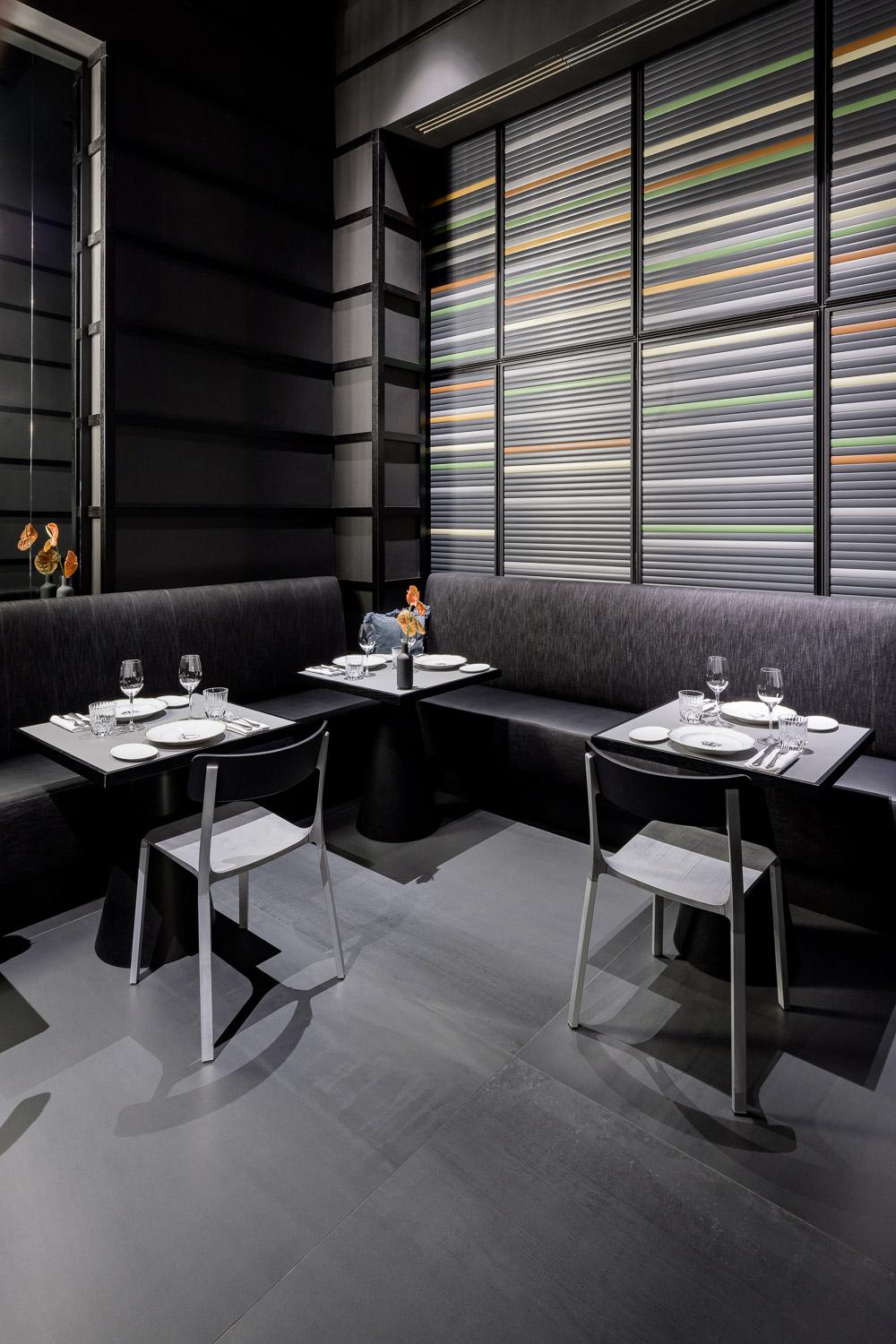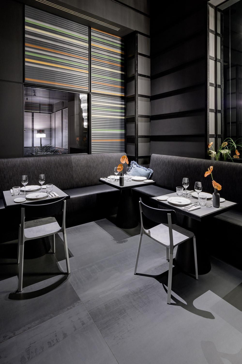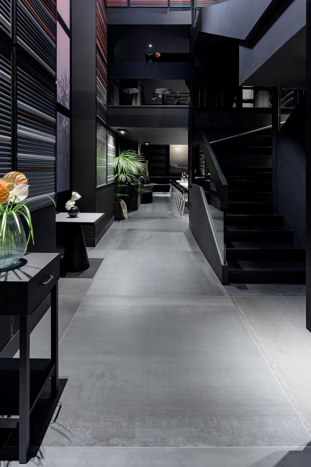 L'enveloppe souligne la dimension surréelle des espaces. La boiserie en Fenix présente des stries graphiques colorées et des peintures de paysages brumeux, œuvres (aérosol sur toile) du célèbre graffeur Eron « en harmonie chromatique totale avec le revêtement modulaire qui habille toute l'architecture ». Un revêtement qui, sur le sol, confère à l'espace une charge sensorielle supplémentaire, grâce à ses reflets métalliques dynamiques, en parfaite harmonie avec les détails bruts du mobilier. Il s'agit d'un grès cérame extra-large à fine épaisseur (6 mm) de la collection Grande Metal Look. Marazzi a fourni pour le projet un grand format personnalisé de 160×160 cm, obtenu en découpant des dalles de 160×320 cm, confirmant ainsi la capacité d'épauler sur mesure toutes les exigences du designer. Dans ce cas, il s’agit d’un impératif technique, des carreaux de sol hautes performances à entretien réduit et sans solution de continuité, mais aussi et surtout expressif. Le charme minéral de la variante chromatique Iron Dark répond, avec une grande cohérence linguistique, à la volonté de donner à l’espace un caractère fort, matérique et urban-chic.