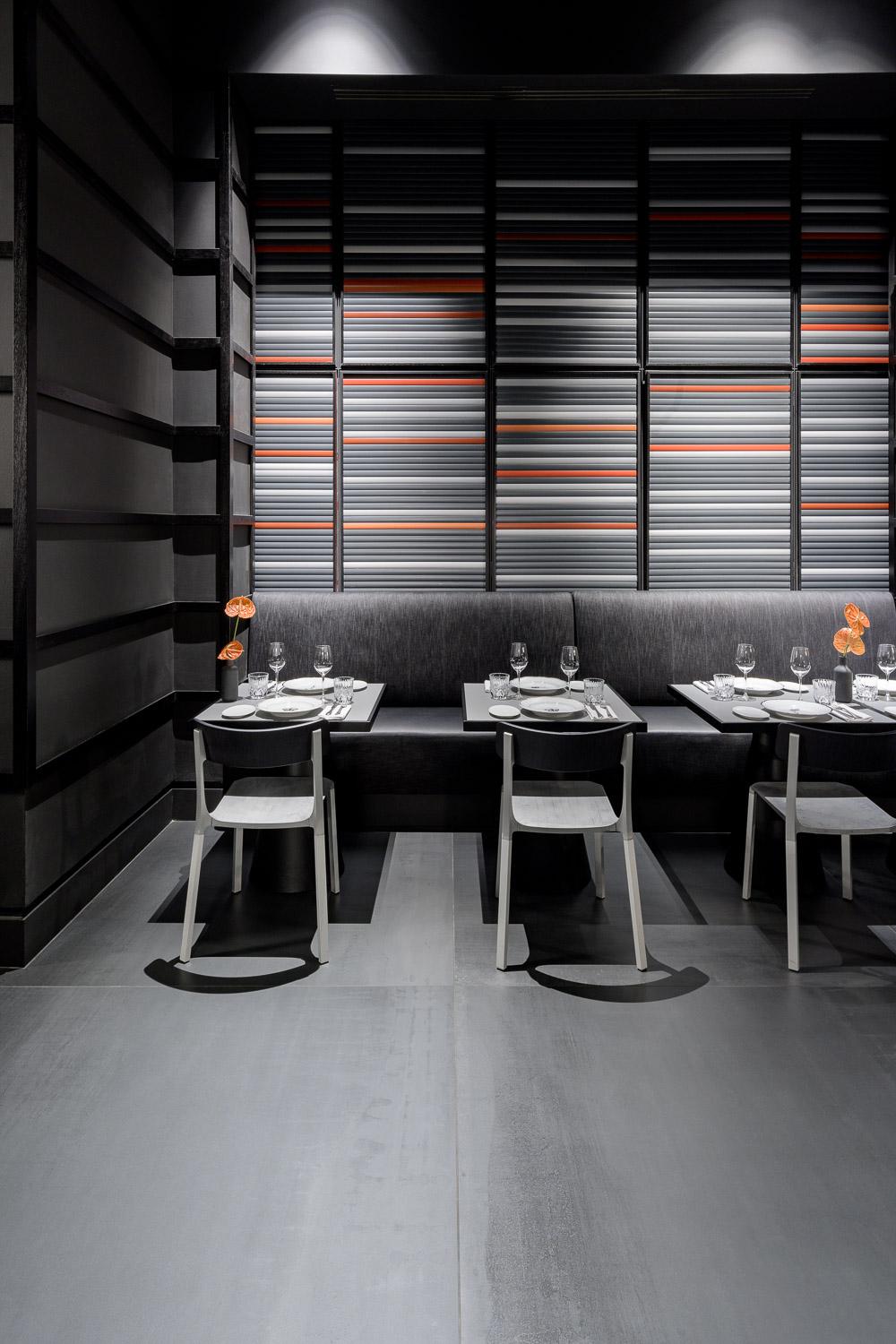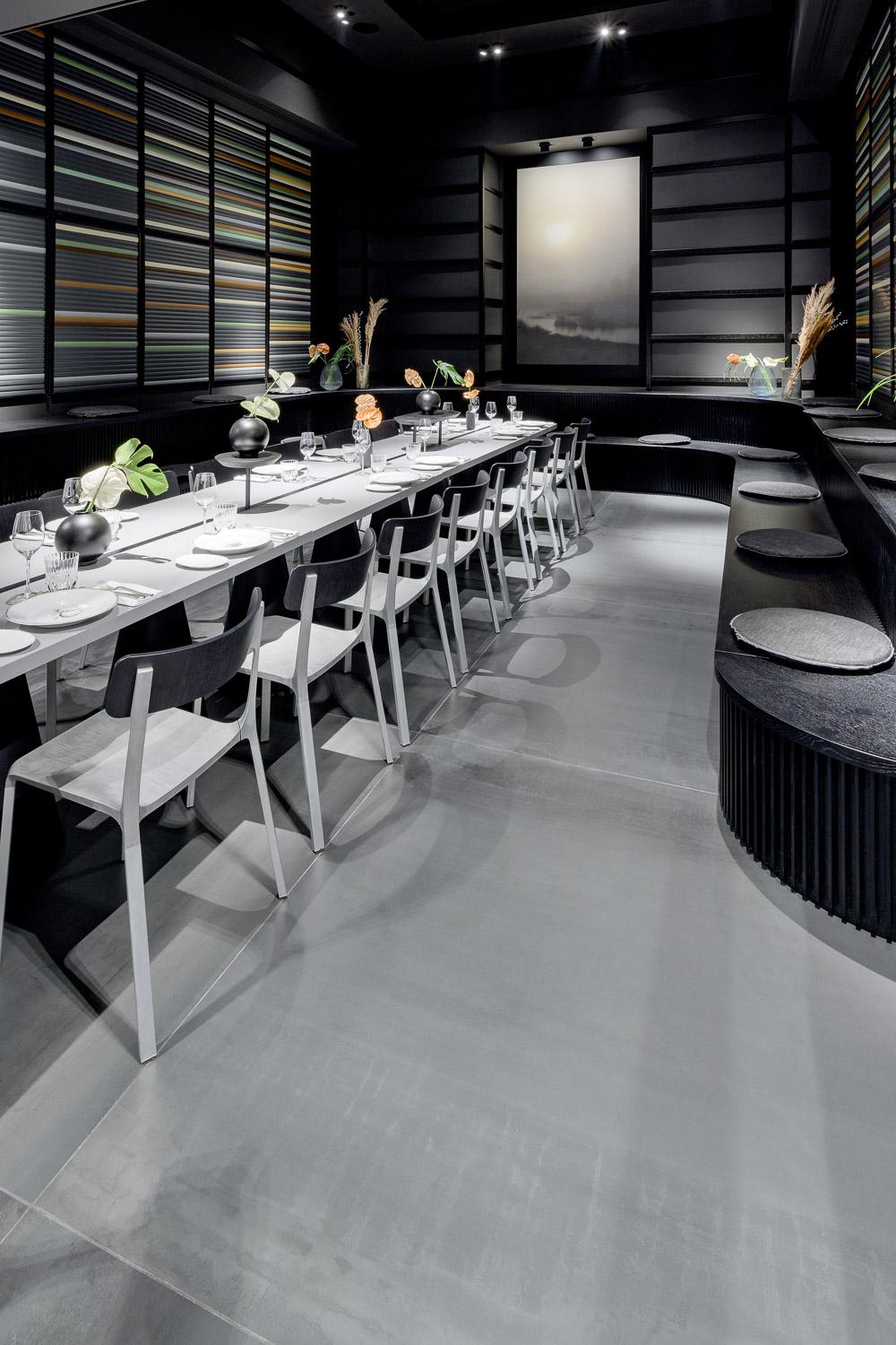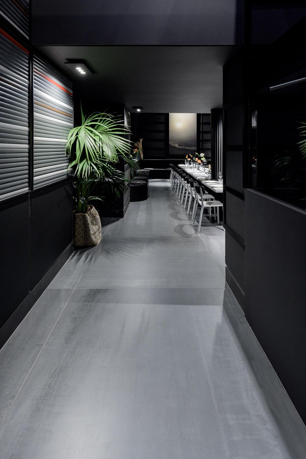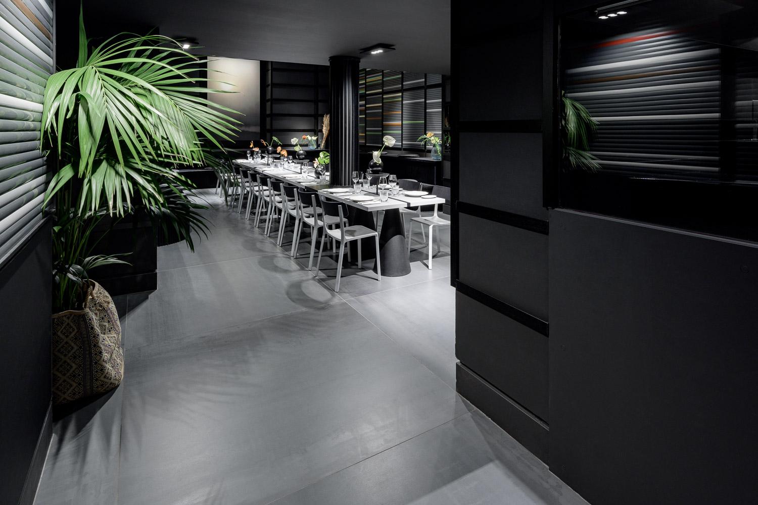 L'enveloppe souligne la dimension surréelle des espaces. La boiserie en Fenix présente des stries graphiques colorées et des peintures de paysages brumeux, œuvres (aérosol sur toile) du célèbre graffeur Eron « en harmonie chromatique totale avec le revêtement modulaire qui habille toute l'architecture ». Un revêtement qui, sur le sol, confère à l'espace une charge sensorielle supplémentaire, grâce à ses reflets métalliques dynamiques, en parfaite harmonie avec les détails bruts du mobilier. Il s'agit d'un grès cérame extra-large à fine épaisseur (6 mm) de la collection Grande Metal Look. Marazzi a fourni pour le projet un grand format personnalisé de 160×160 cm, obtenu en découpant des dalles de 160×320 cm, confirmant ainsi la capacité d'épauler sur mesure toutes les exigences du designer. Dans ce cas, il s’agit d’un impératif technique, des carreaux de sol hautes performances à entretien réduit et sans solution de continuité, mais aussi et surtout expressif. Le charme minéral de la variante chromatique Iron Dark répond, avec une grande cohérence linguistique, à la volonté de donner à l’espace un caractère fort, matérique et urban-chic.