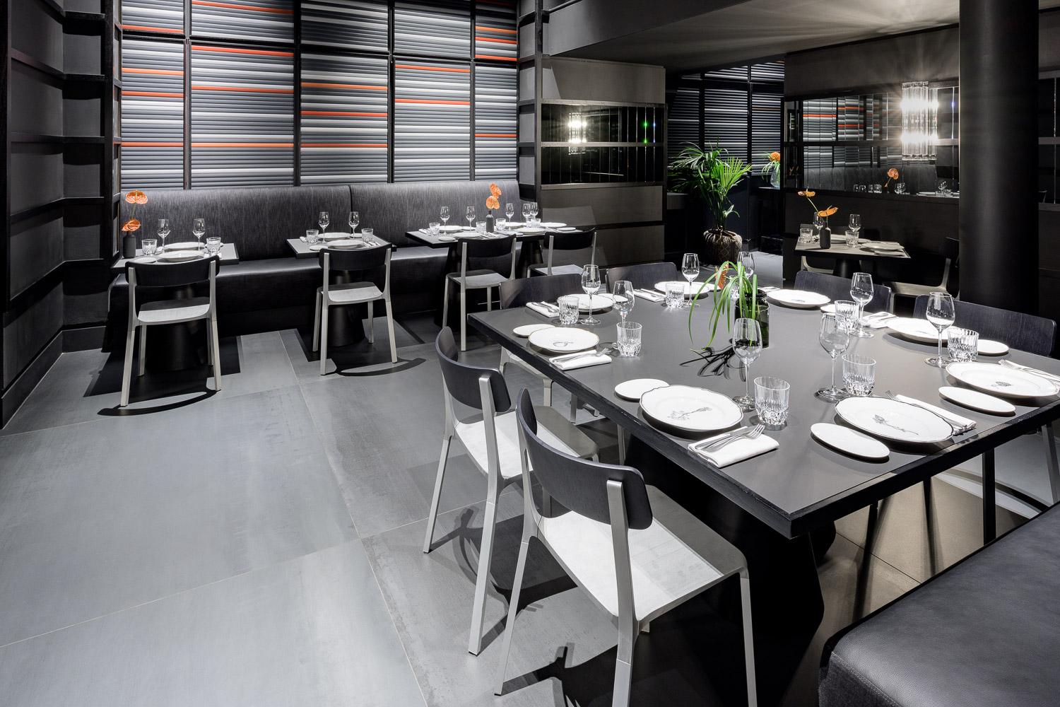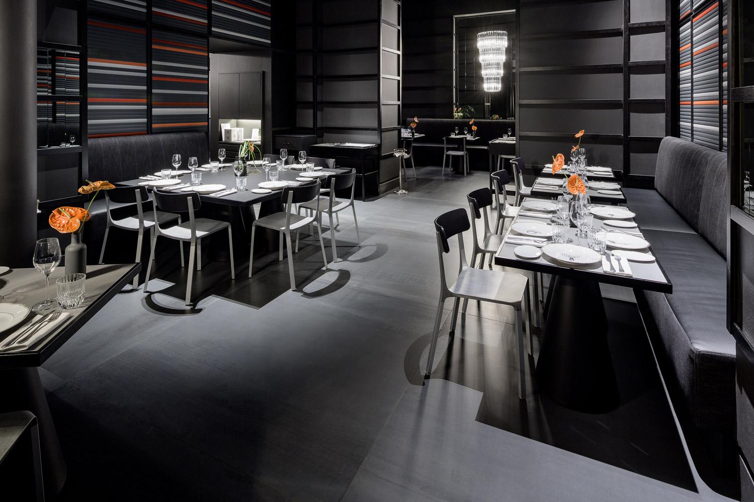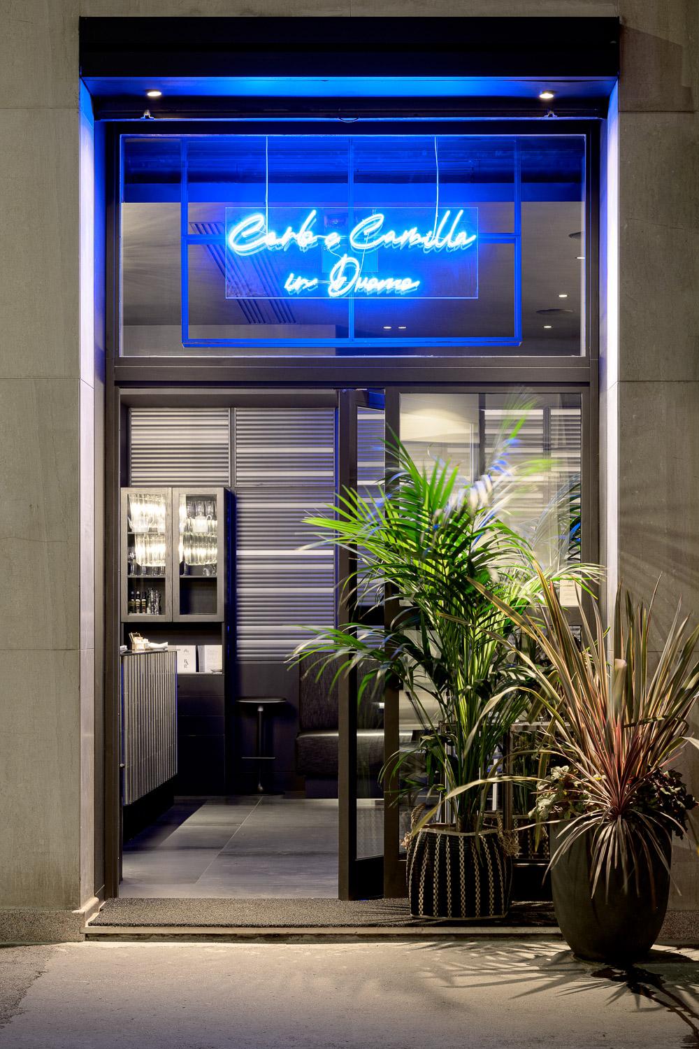 La nature anticonformiste de l'endroit s'exprime dès la zone bar de l'entrée, sur la rue, avec le comptoir en acier effet étain surmonté d'un lustre sculptural Venini, des canapés revêtus de jeans délavés noirs, des chaises en aluminium brut. À partir de là, un escalier mène au niveau – 2, articulé en différents espaces. La salle conçue comme un amphithéâtre se distingue, où les clients peuvent savourer de manière informelle des cocktails et des plats easy-gourmet assis sur les deux marches en chêne noir de la tribune. Au centre, la scène est dominée par la longue table commune, caractéristique stylistique et conceptuelle typique du format Carlo e Camilla, qui vise à partager l'expérience culinaire et spatiale.