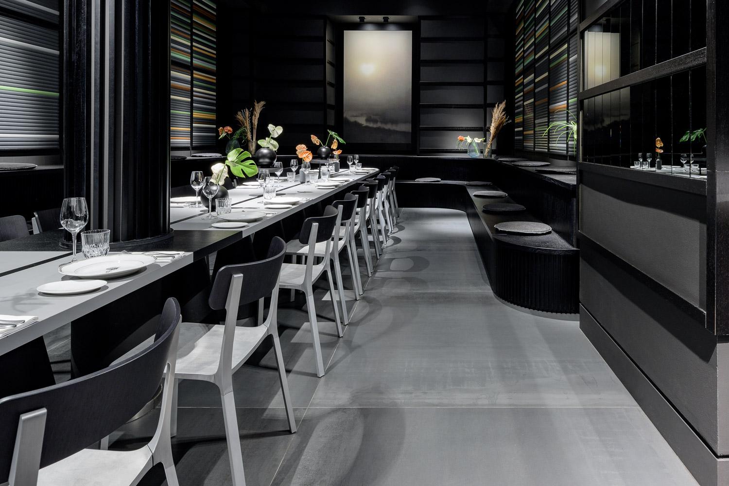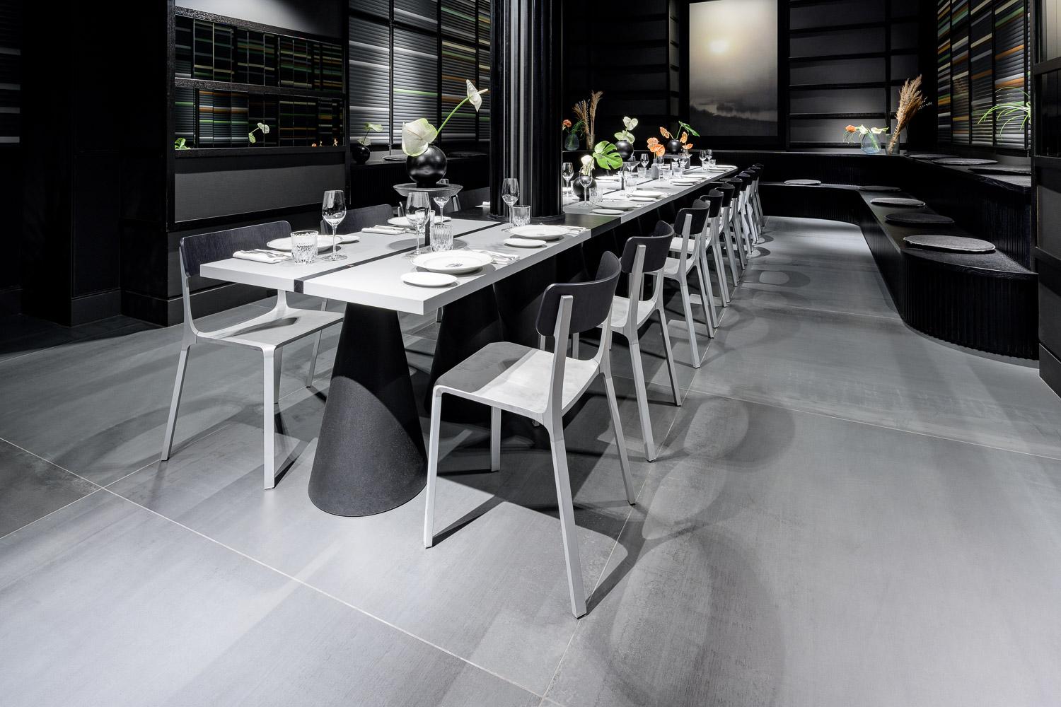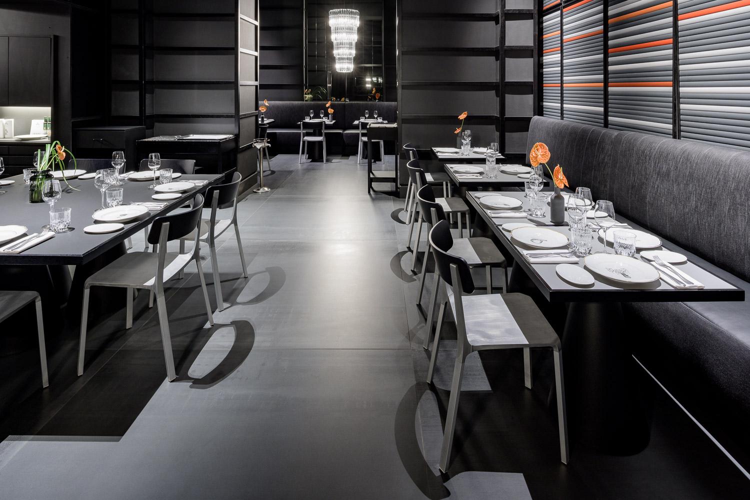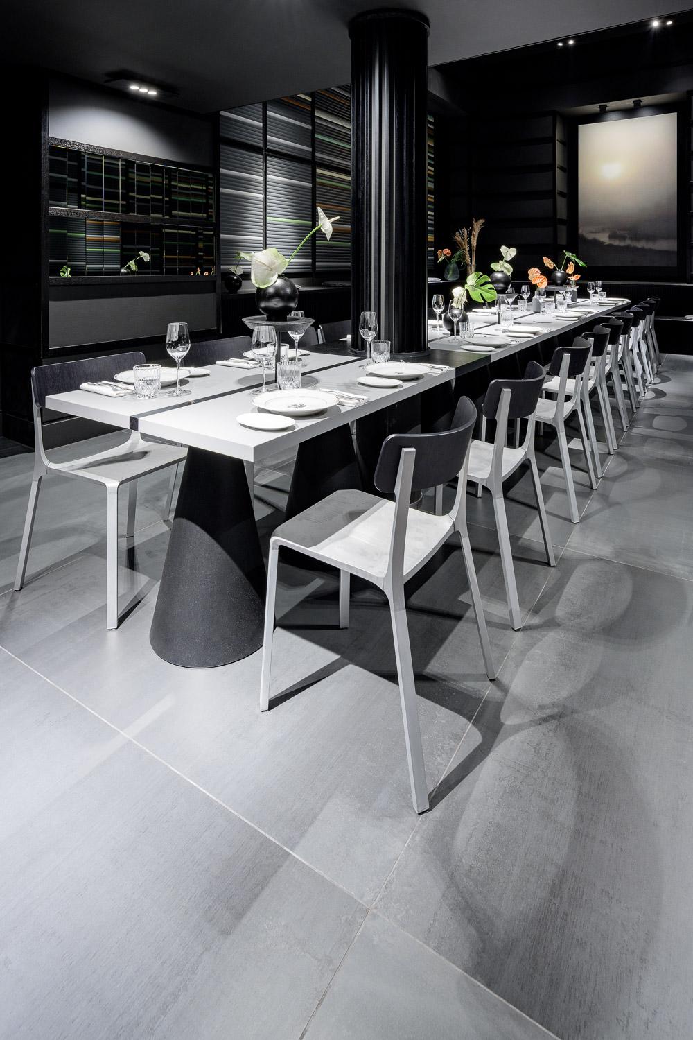 La nature anticonformiste de l'endroit s'exprime dès la zone bar de l'entrée, sur la rue, avec le comptoir en acier effet étain surmonté d'un lustre sculptural Venini, des canapés revêtus de jeans délavés noirs, des chaises en aluminium brut. À partir de là, un escalier mène au niveau – 2, articulé en différents espaces. La salle conçue comme un amphithéâtre se distingue, où les clients peuvent savourer de manière informelle des cocktails et des plats easy-gourmet assis sur les deux marches en chêne noir de la tribune. Au centre, la scène est dominée par la longue table commune, caractéristique stylistique et conceptuelle typique du format Carlo e Camilla, qui vise à partager l'expérience culinaire et spatiale.