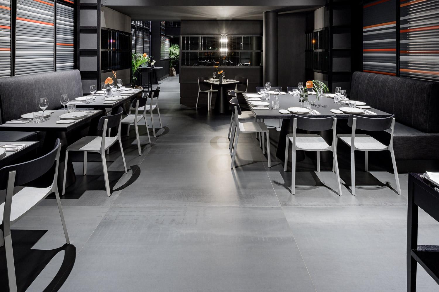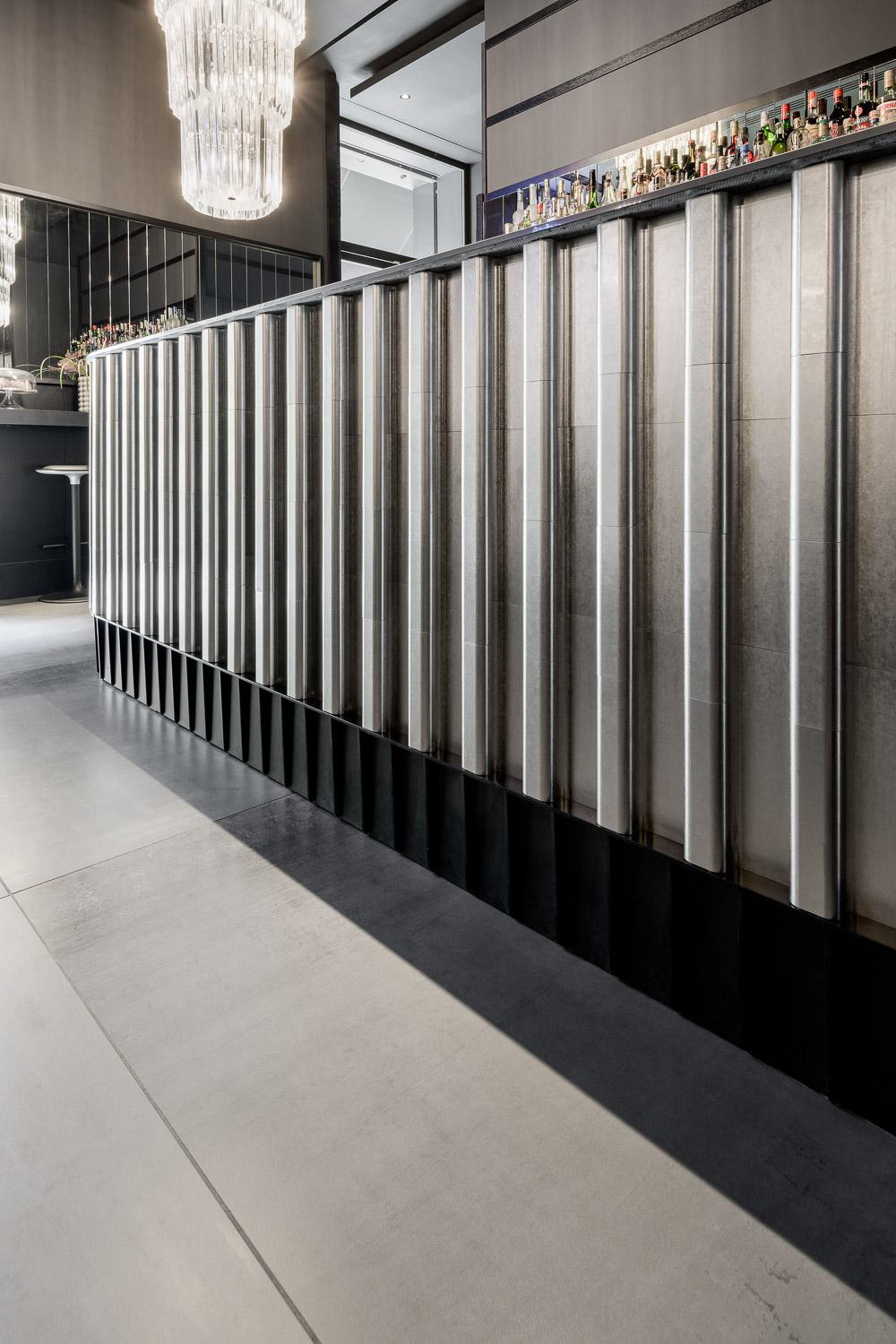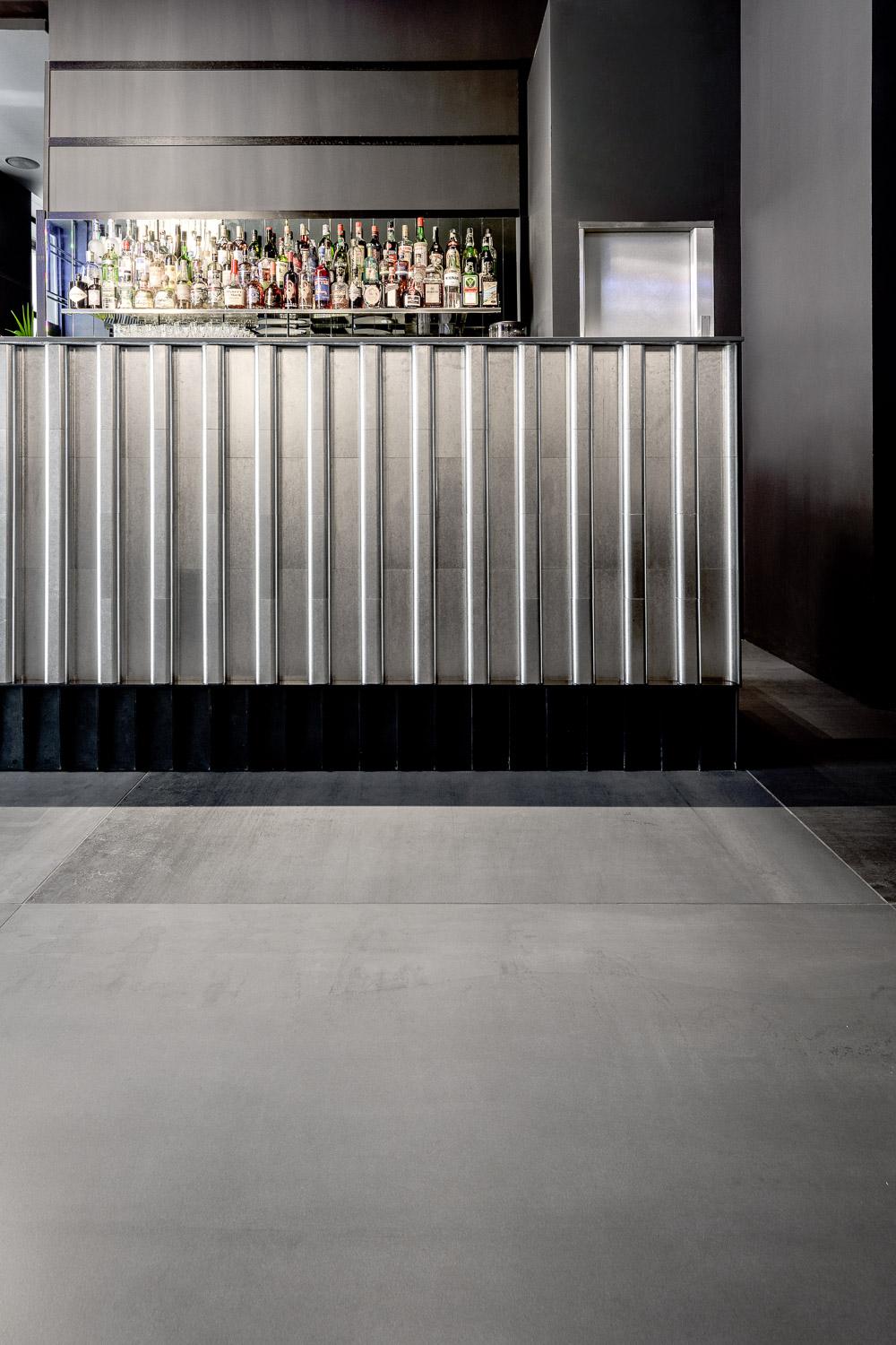Un bistrot souterrain, où la décoration d'intérieurs de Gio Tirotto joue entre les nuances dark et les reflets chatoyants du grès cérame Grande Metal Look