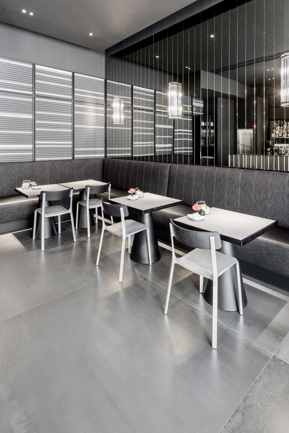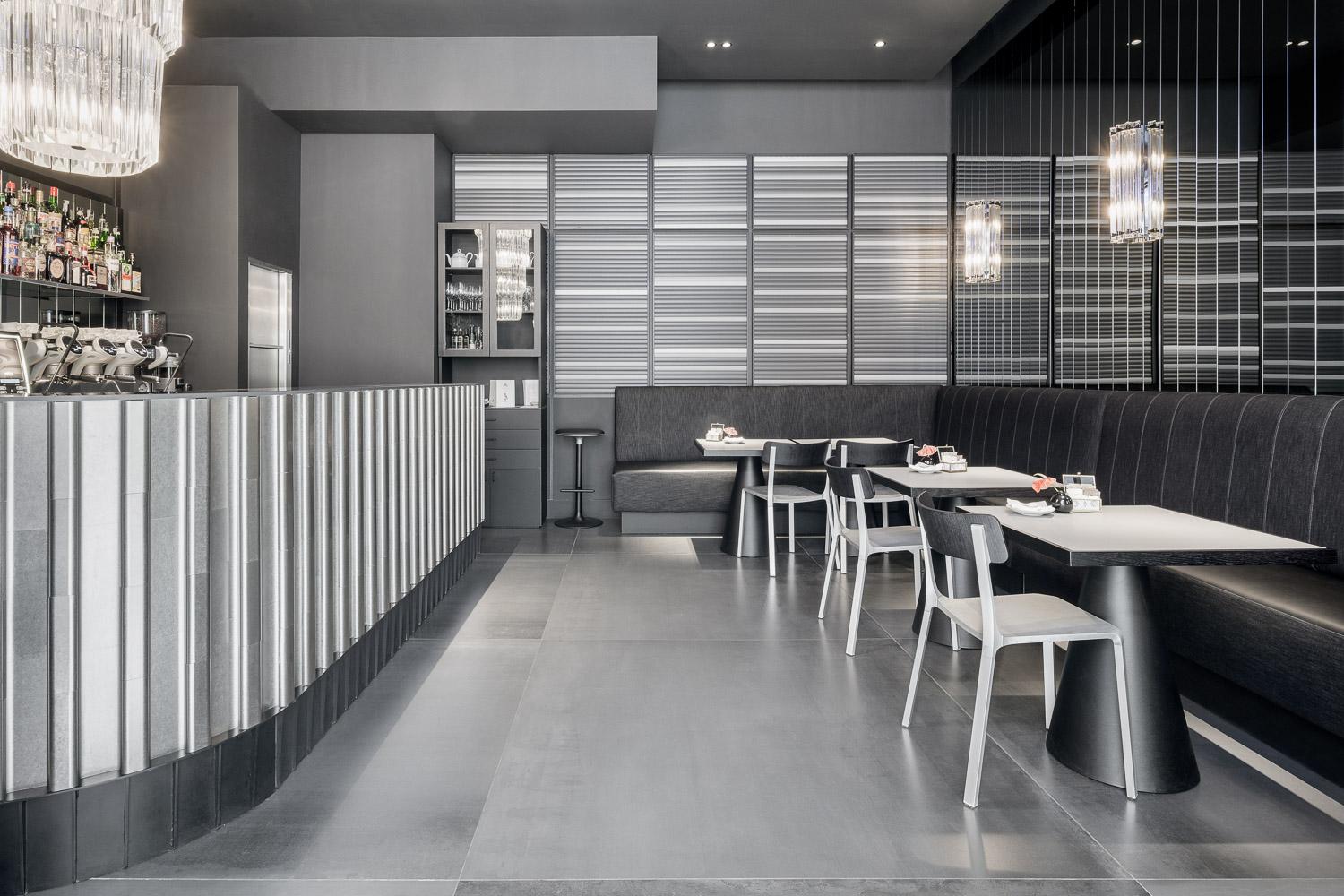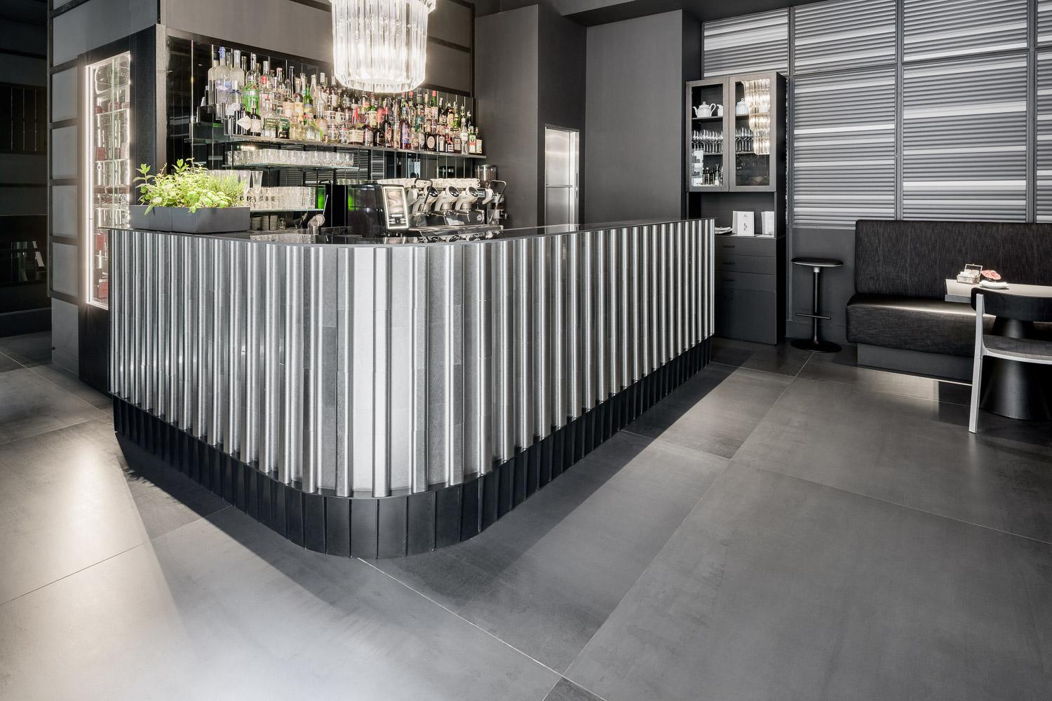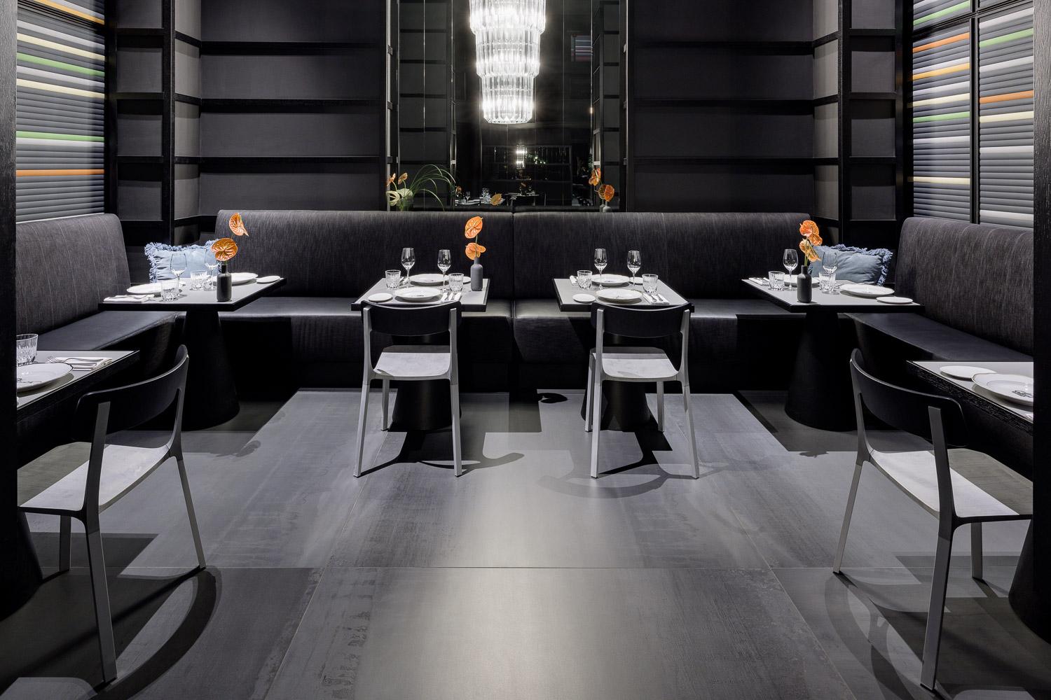 Un bistrot souterrain, où la décoration d'intérieurs de Gio Tirotto joue entre les nuances dark et les reflets chatoyants du grès cérame Grande Metal Look