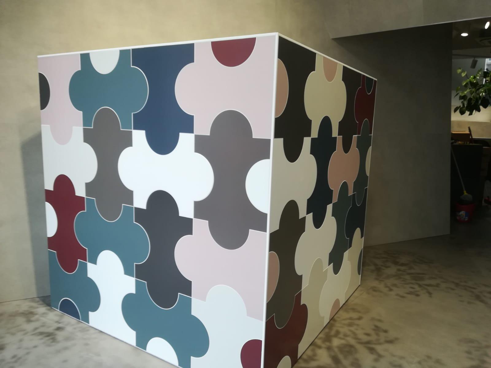 La composition à base des nouveaux grès compte, à ses côtés, un grand volume cubique qui rappelle le casse-tête de Rubik, réalisé quant à lui avec le revêtement mural de fine épaisseur Eclettica dans un mélange sophistiqué de couleurs d'où se détachent, par contraste, sur les différents modules quatre fois courbe, toutes les couleurs de la collection.