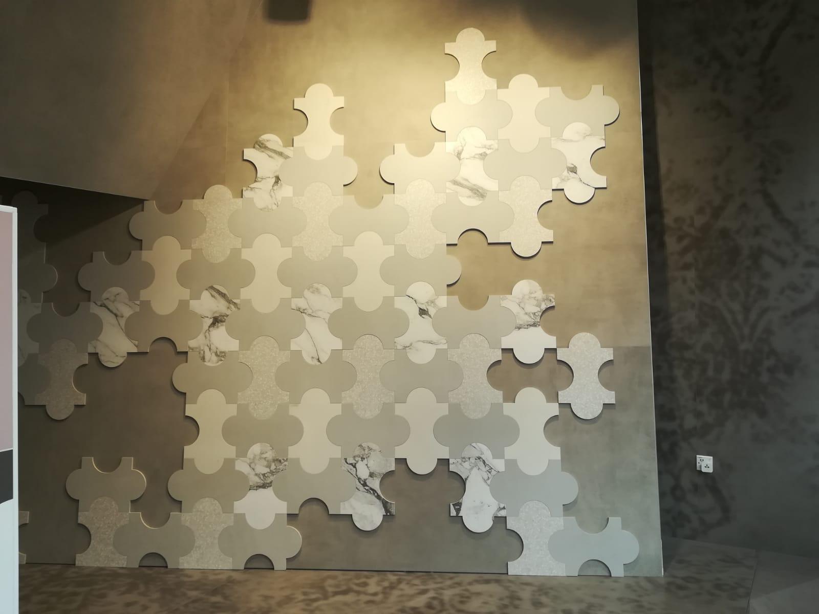 Les nouvelles collections en céramique et grès se prêtent à traduire la forme légendaire de Triennale dans une optique ironique : un « puzzle » recouvrant et modulant l'espace, une scénographie présentant des assonances de langage avec des jeux et casse-tête indémodables, interprétant les nouveautés de la marque par des compositions à effets de matières qui exaltent la texture et les tonalités neutres des nouveaux grès, ainsi que la surface tactile et l'élégance chromatique des revêtements.