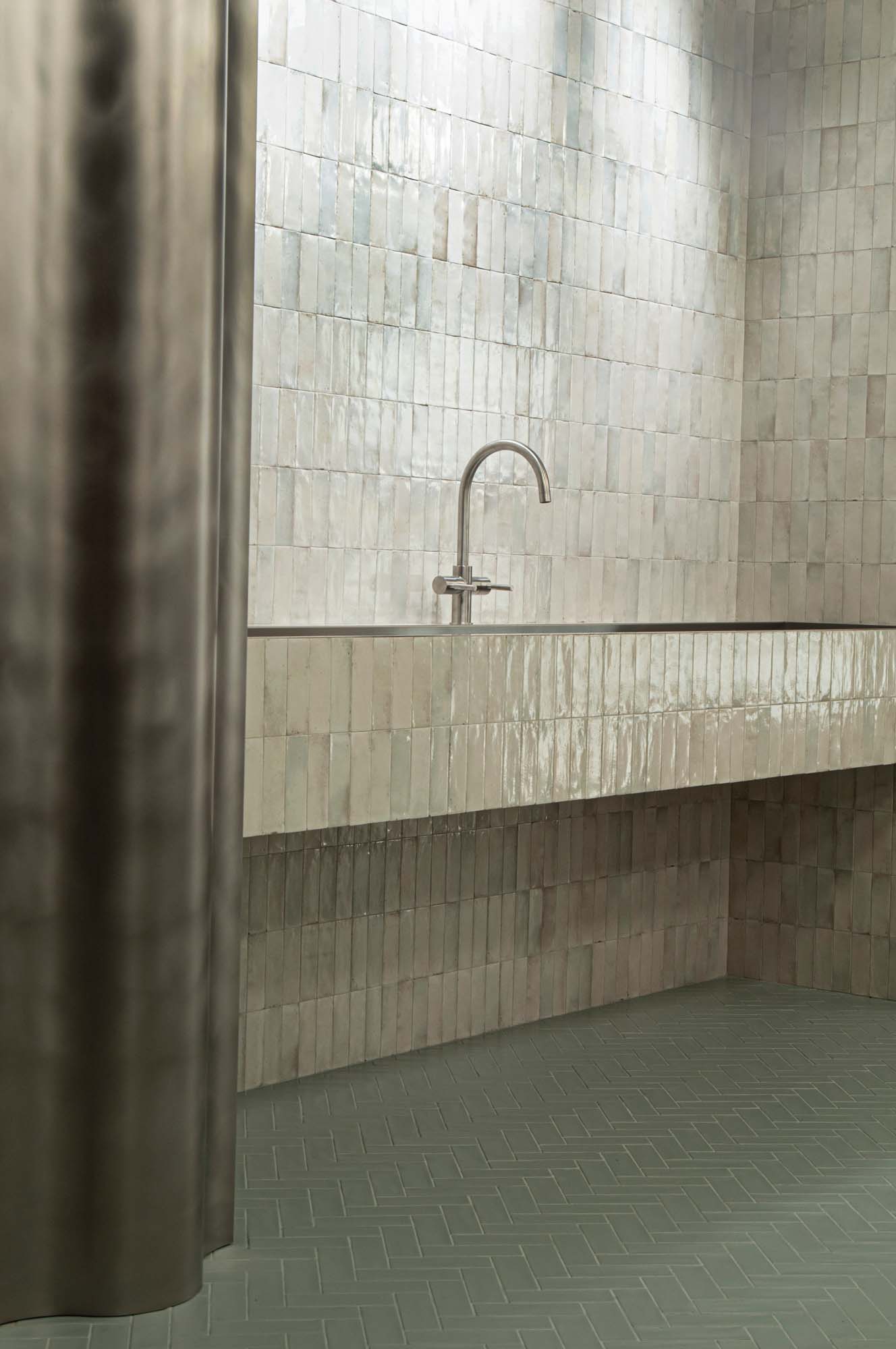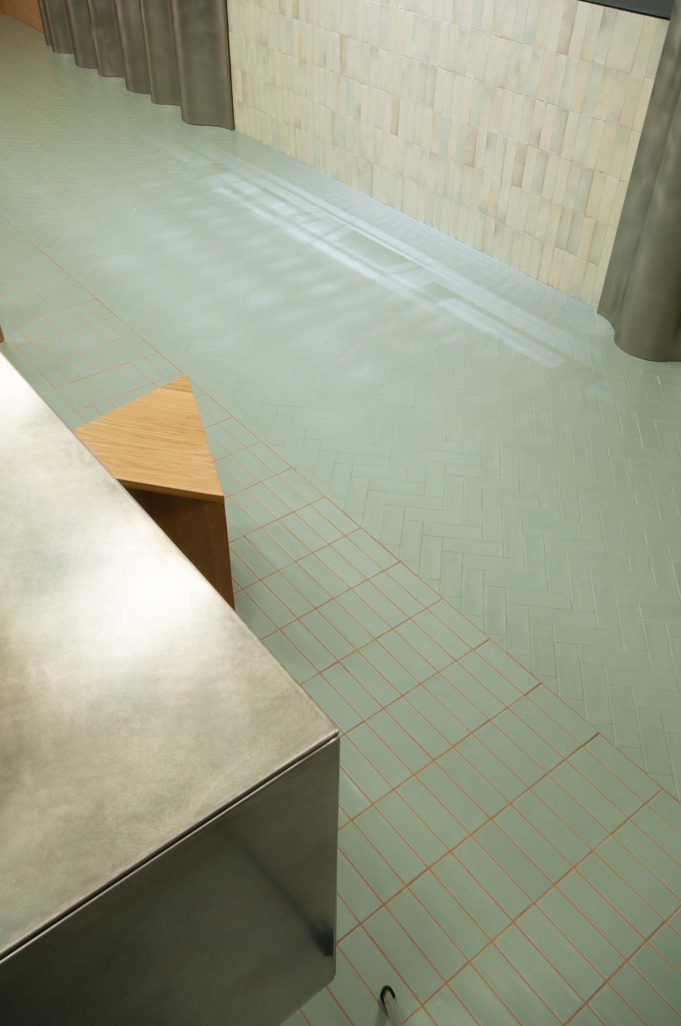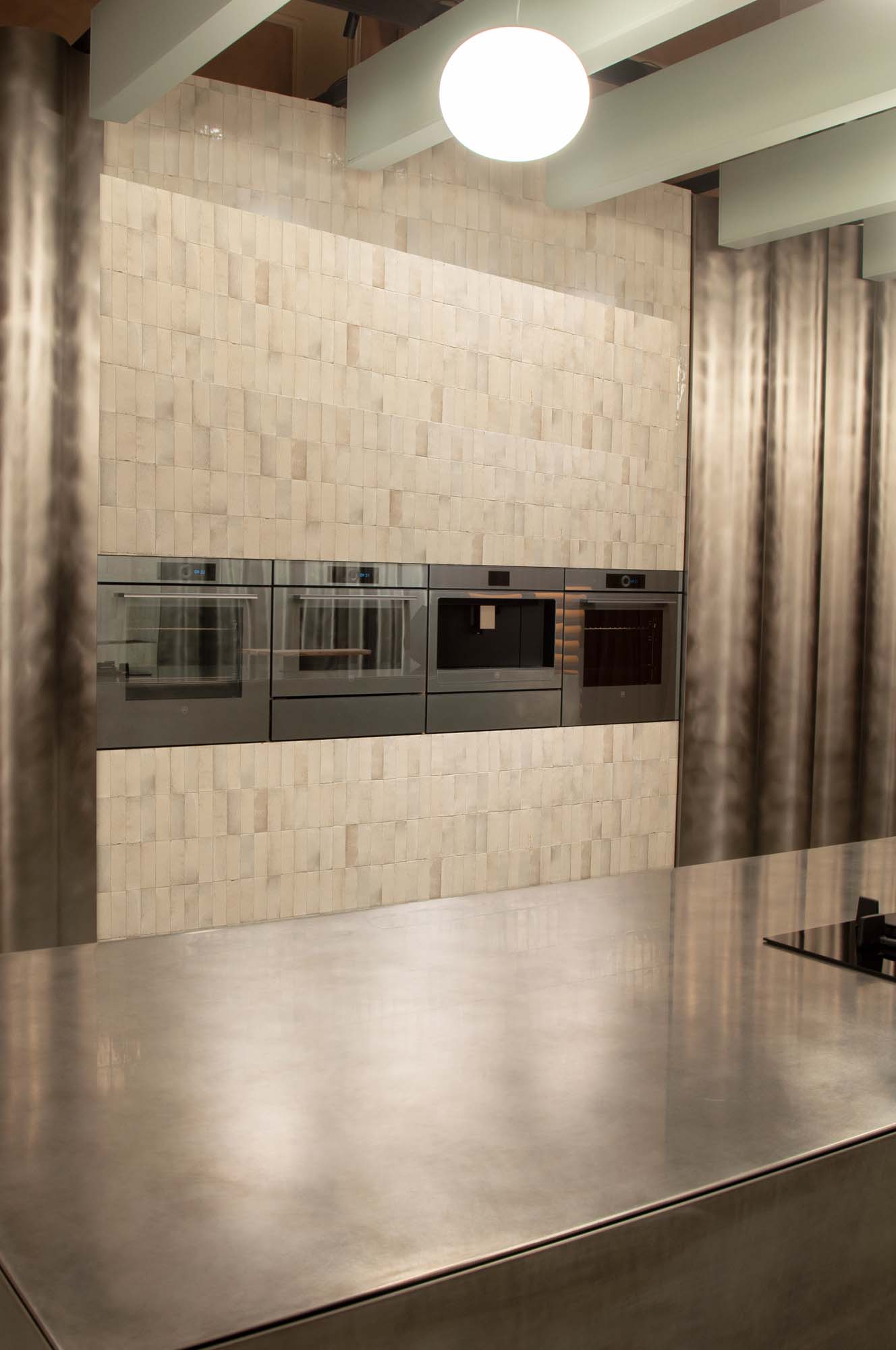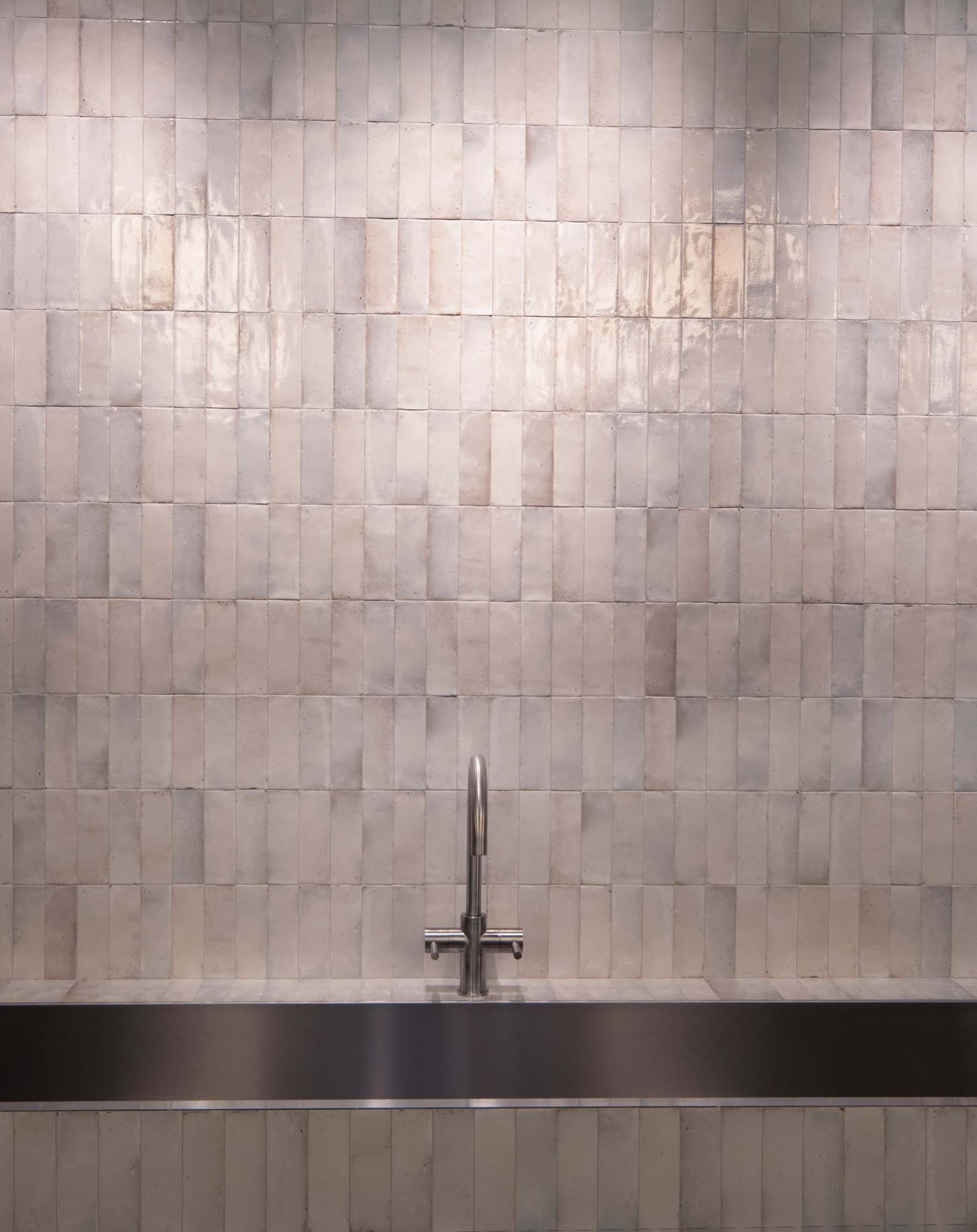 Les carreaux de petit format, dont l’esthétique chaleureuse rappelle le fait main, contrastent avec les lignes géométriques nettes et l’atmosphère plus minimaliste de l’îlot central. Cet effet est par ailleurs mis en valeur par la pose au sol des carreaux de la collection Confetto, positionnés à la fois en bâtons rompus et en ligne droite, créant ainsi un tapis central aux joints contrastés. Parmi les 12 couleurs proposées, Elisa Ossino a choisi la couleur Azzurro, rappelant les tons froids de l’acier qui, dans le grès cérame de Confetto, deviennent une surface semi-mate et douce au toucher. Pour les revêtements muraux, du sol au plafond, le choix s’est porté sur la collection Crogiolo Rice couleur Natural : de petits carreaux rectangulaires à la finition brillante et des surfaces délibérément irrégulières qui encadrent les appareils encastrés, soulignant le fait main. C’est ce même concept qui sous-tend le revêtement du grand évier en acier de l’îlot, où l’on retrouve les Crogiolo Rice. Comme l’a souligné Elisa Ossino, les contrastes et la coprésence de divers matériaux déterminent ainsi des surfaces inédites sur des géométries sculpturales.