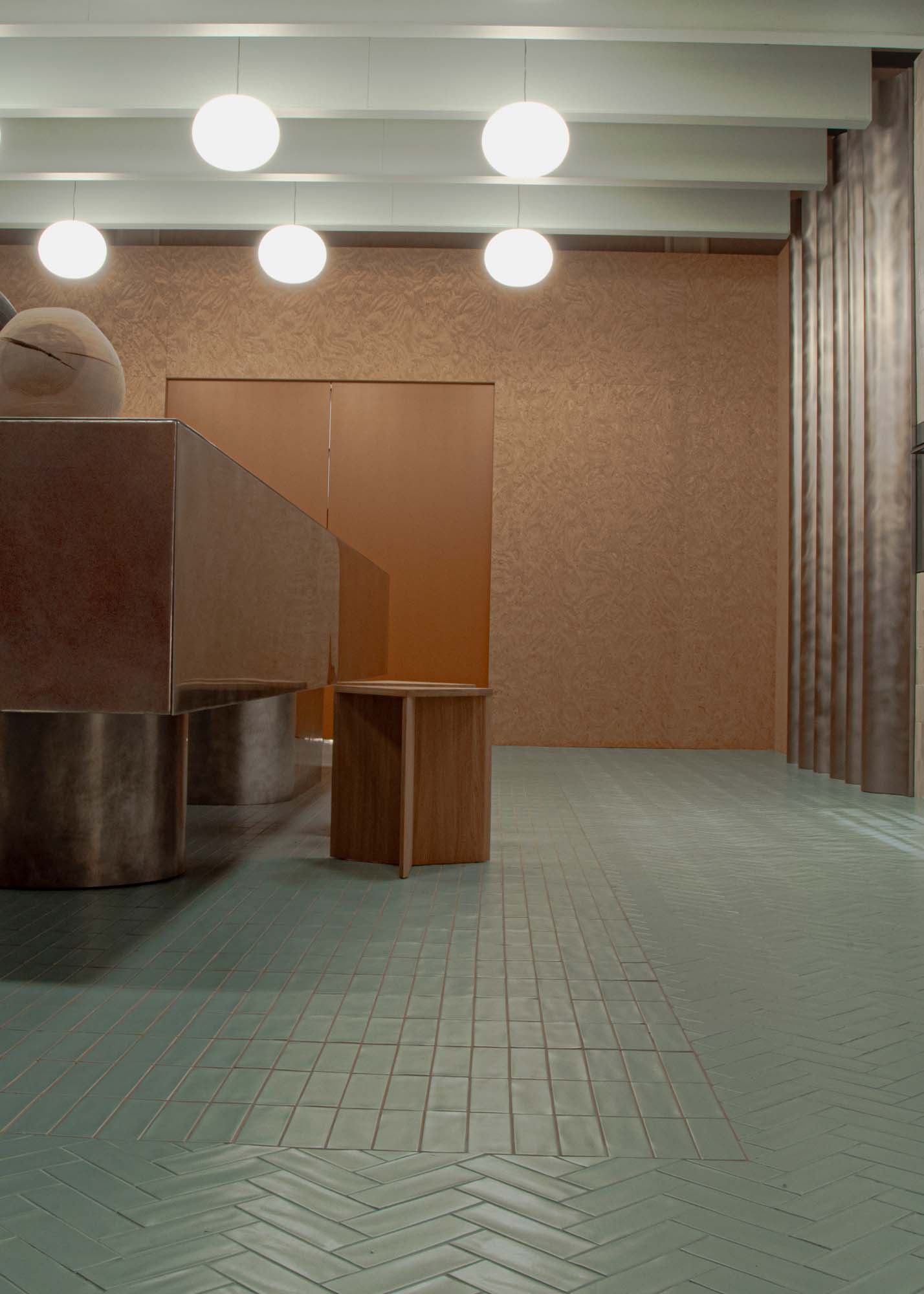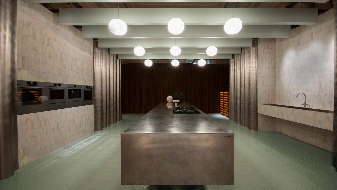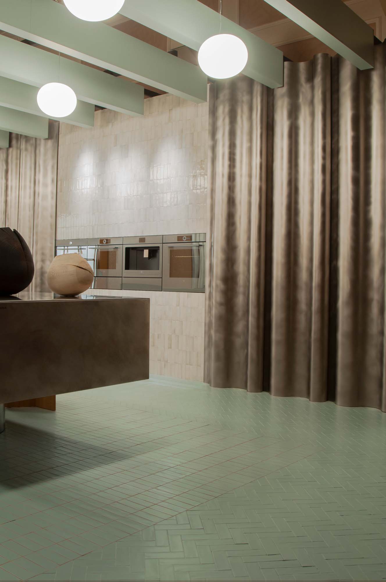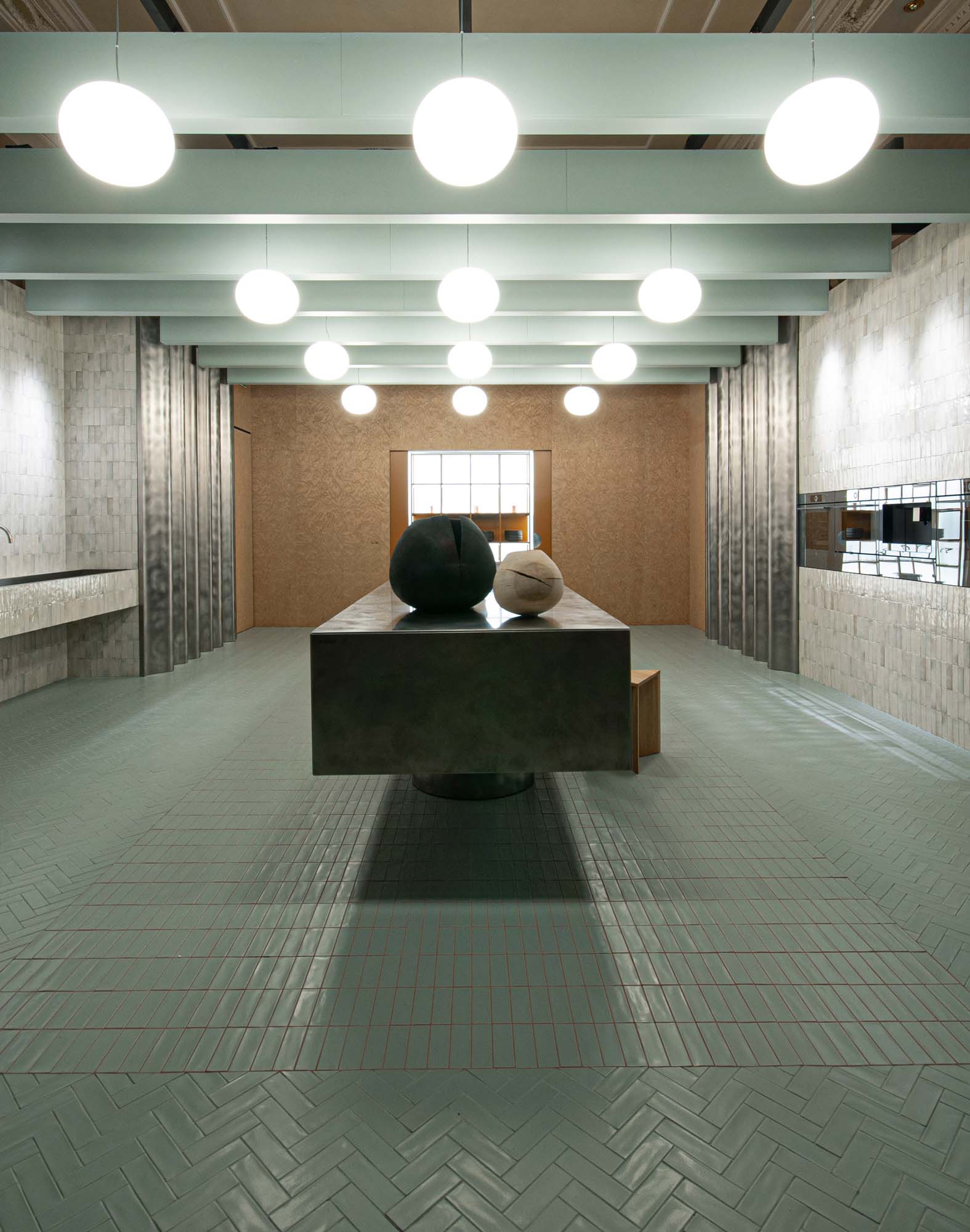 Les carreaux de petit format, dont l’esthétique chaleureuse rappelle le fait main, contrastent avec les lignes géométriques nettes et l’atmosphère plus minimaliste de l’îlot central. Cet effet est par ailleurs mis en valeur par la pose au sol des carreaux de la collection Confetto, positionnés à la fois en bâtons rompus et en ligne droite, créant ainsi un tapis central aux joints contrastés. Parmi les 12 couleurs proposées, Elisa Ossino a choisi la couleur Azzurro, rappelant les tons froids de l’acier qui, dans le grès cérame de Confetto, deviennent une surface semi-mate et douce au toucher. Pour les revêtements muraux, du sol au plafond, le choix s’est porté sur la collection Crogiolo Rice couleur Natural : de petits carreaux rectangulaires à la finition brillante et des surfaces délibérément irrégulières qui encadrent les appareils encastrés, soulignant le fait main. C’est ce même concept qui sous-tend le revêtement du grand évier en acier de l’îlot, où l’on retrouve les Crogiolo Rice. Comme l’a souligné Elisa Ossino, les contrastes et la coprésence de divers matériaux déterminent ainsi des surfaces inédites sur des géométries sculpturales.