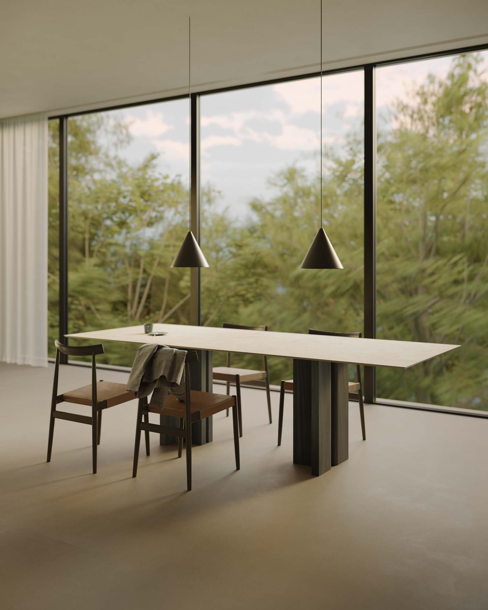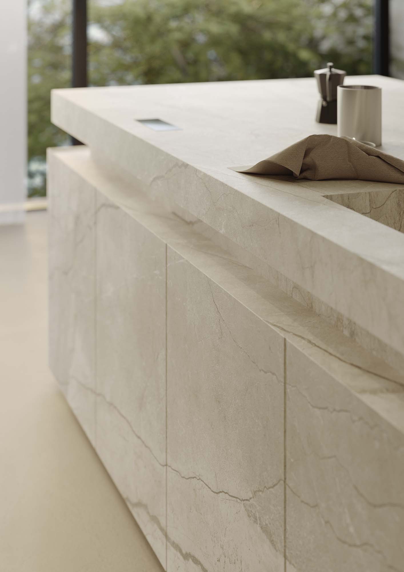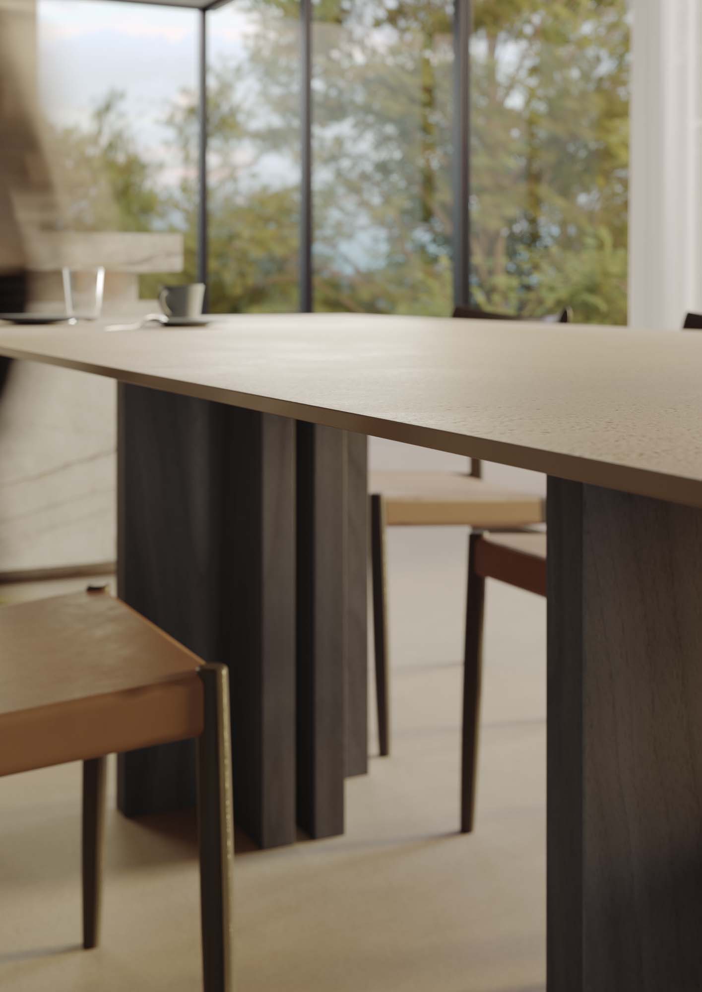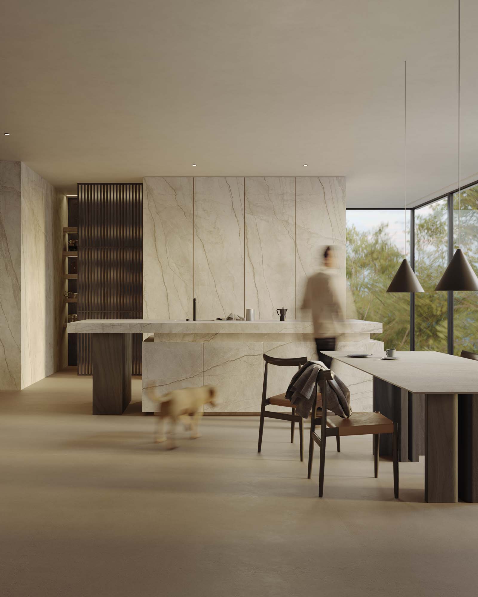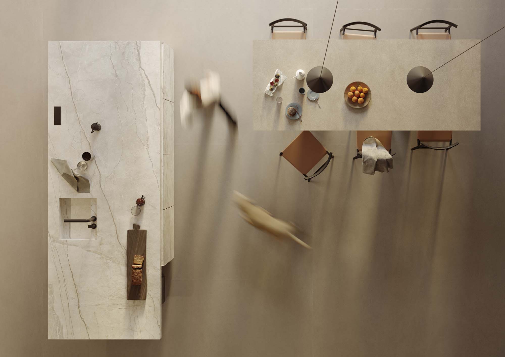« Les fenêtres en bandeau donnant sur la nature et la pièce vaste et lumineuse nous ont inspiré une idée d’action plutôt qu’un simple espace fonctionnel : un petit-déjeuner matinal dans une atmosphère nordique au sein d’un espace ouvert, moins méditerranéen. » Des détails et objets évoquent des moments de la journée, comme le petit-déjeuner, ainsi que les fonctions de chacune des zones ; par exemple, on perçoit un léger désordre dans le garde-manger, tandis que la platine vinyle posée sur l’étagère contribue à fusionner les espaces living et cuisine. La composition architecturale met en valeur la collection effet terre cuite Slow proposée dans la nouvelle version en grand format 12 mm couleur Calce, posée au sol et sur le plateau de la grande table, associée à la sensation minérale de la Silver Root dans sa nouvelle version plus claire, posée sur la cuisine, sur le mur arrière et sur l’étagère.