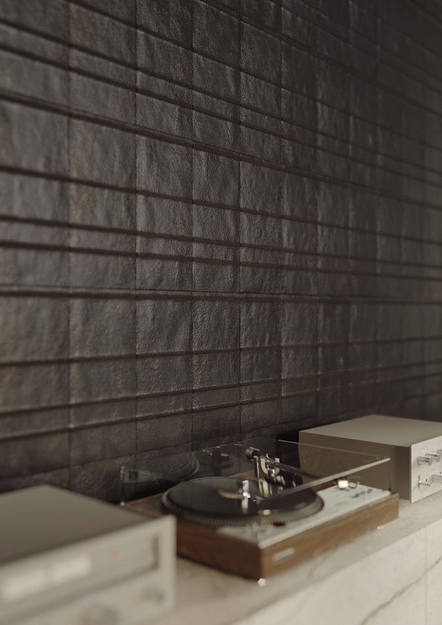 La cuisine en îlot, avec un espace de service que l’on aperçoit derrière la porte coulissante, s’intègre dans une zona living, créant un environnement élégant et fonctionnel. « C’est une solution très demandée », poursuit Il Magma, « car aujourd’hui la cuisine fait partie d’un espace de vie unique, dialoguant avec le reste de l’environnement grâce à l’usage judicieux des matériaux. » La plaque en céramique contribue à créer une transition fluide entre les deux zones, sans rupture. En ce qui concerne les couleurs, nous avons choisi des tonalités naturelles mais contrastées. Sur le côté gauche, le mur est entièrement revêtu de la collection en petit format Crogiolo Terramater à la finition Carbon : une couleur sombre avec une touche chaude qui interagit avec la lumière naturelle et fait ressortir la teinte claire de Racine d’argent, dont les veines profondes évoquent les nuances brûlées de Terramater. » Le petit format dialogue avec le grand, créant un beau jeu de contrastes. La céramique n’est plus seulement un revêtement, elle devient un élément décoratif évoquant les origines mêmes de la céramique.