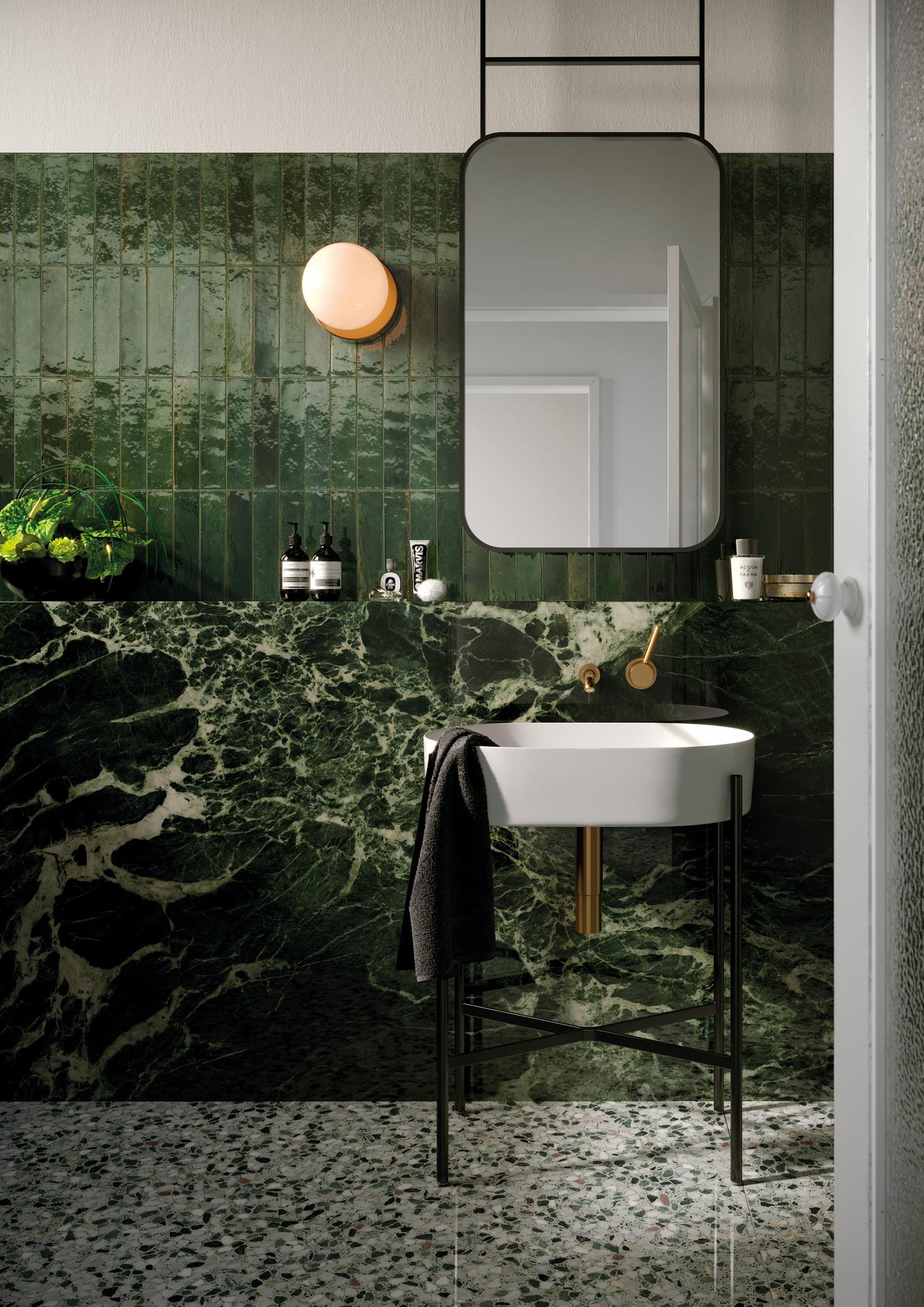 Au sein de la vaste offre de Grande Marble Look, cette nouvelle ligne de marbres colorés s'inscrit délibérément dans la voie décorative : la part belle est faite aux textures nobles et rares dans les environnements les plus variés, s'accordant avec les nombreuses gammes du catalogue. La matière se fait l'alliée de l'hyperdécorativisme, dont elle révèle la dimension résolument couture, souvent surprenante.