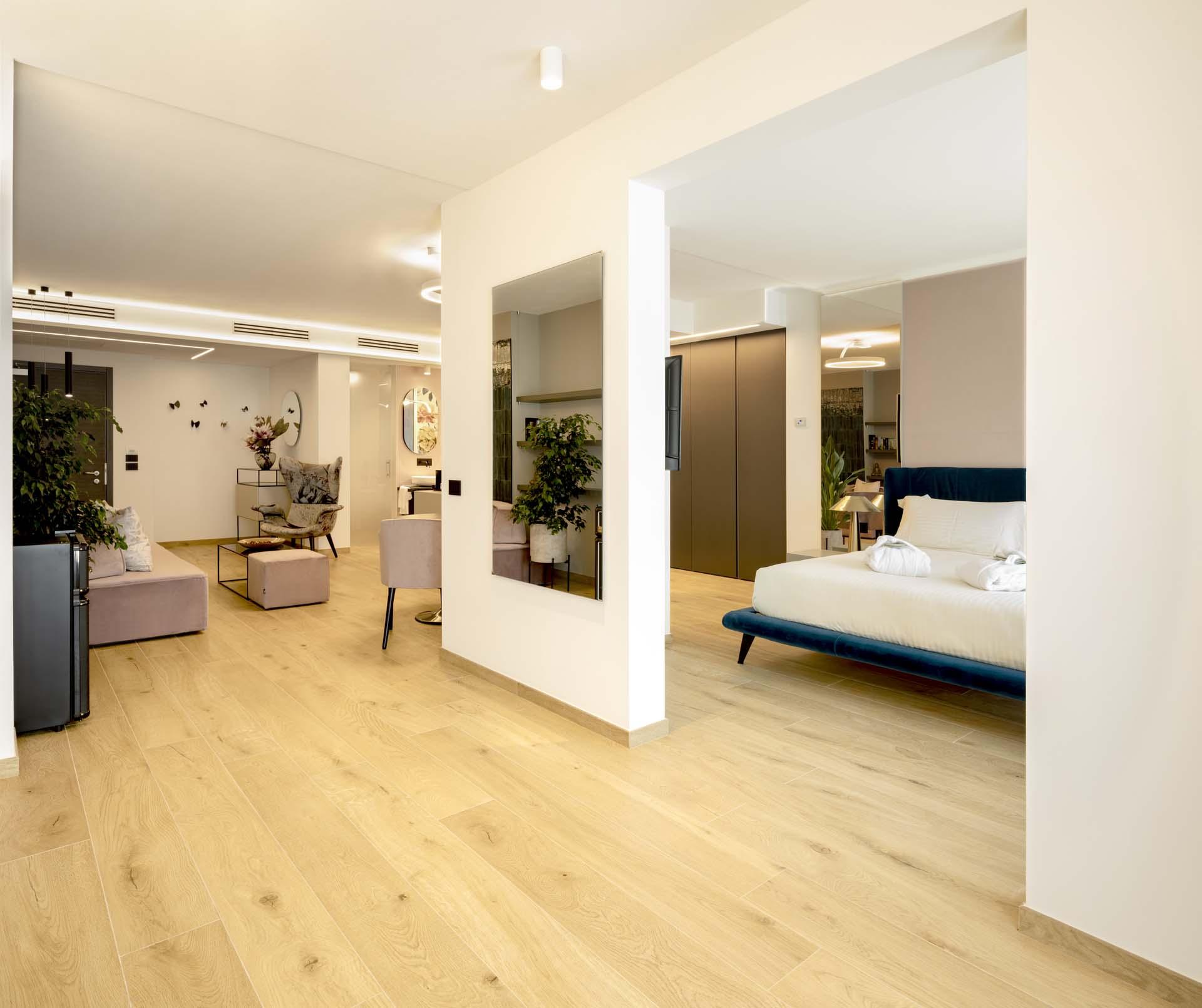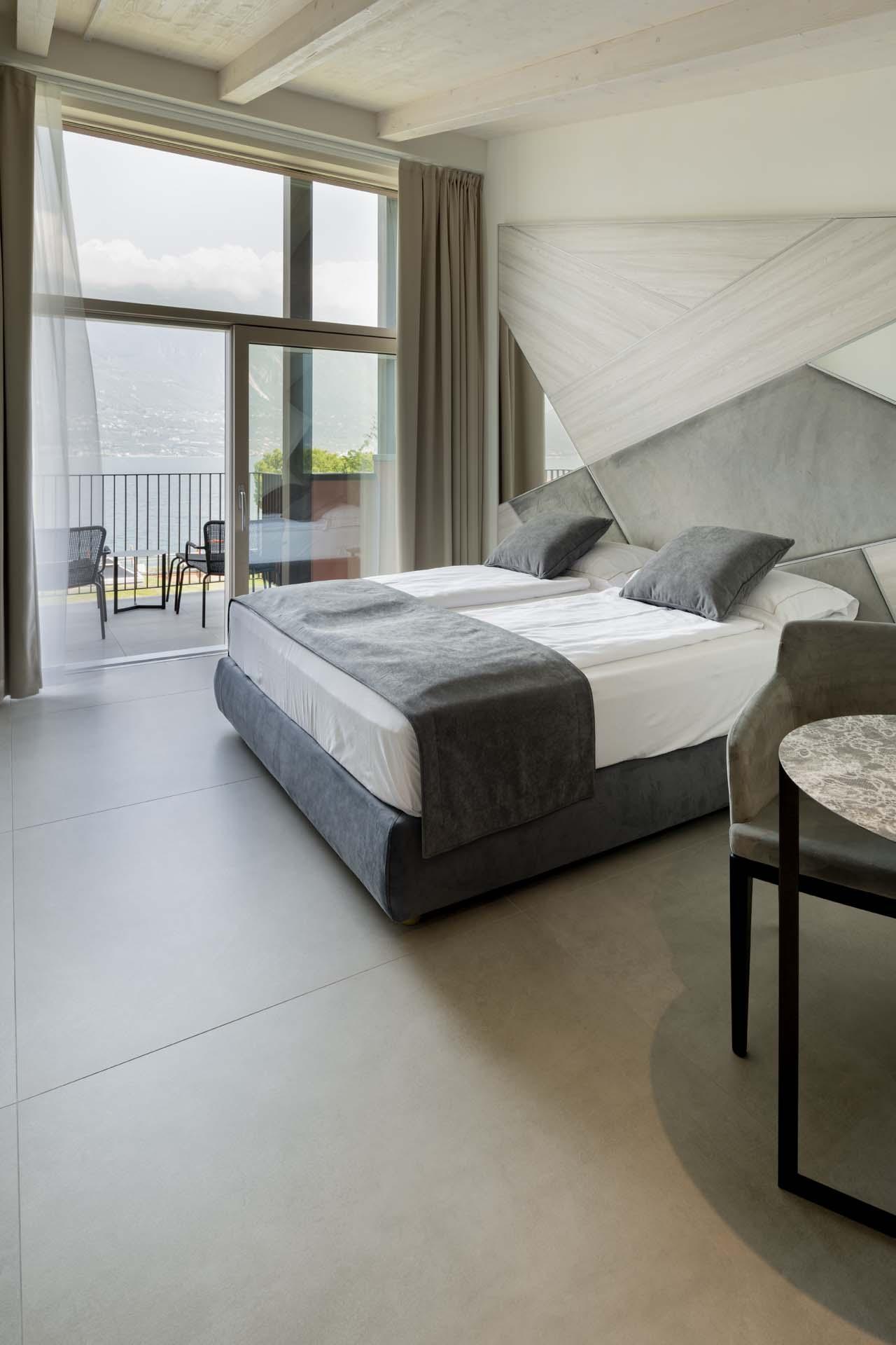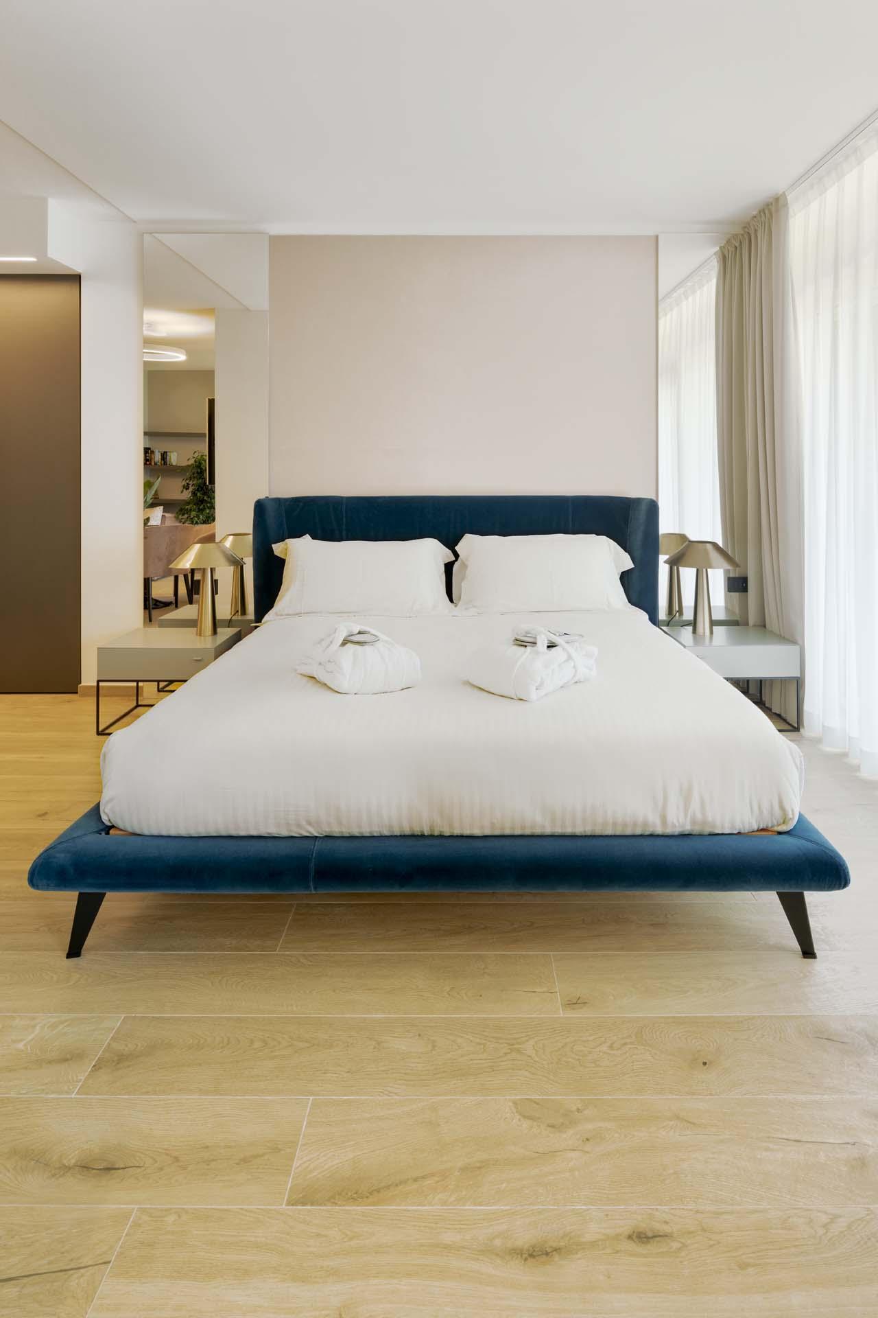 Dans la master suite, le sol fait montre de la collection Marazzi inspirée des chênes naturels Vero (22×180 cm), et dans les suites, place aux textures délicates et irrégulières de Grande Concrete Look (120×120 cm).