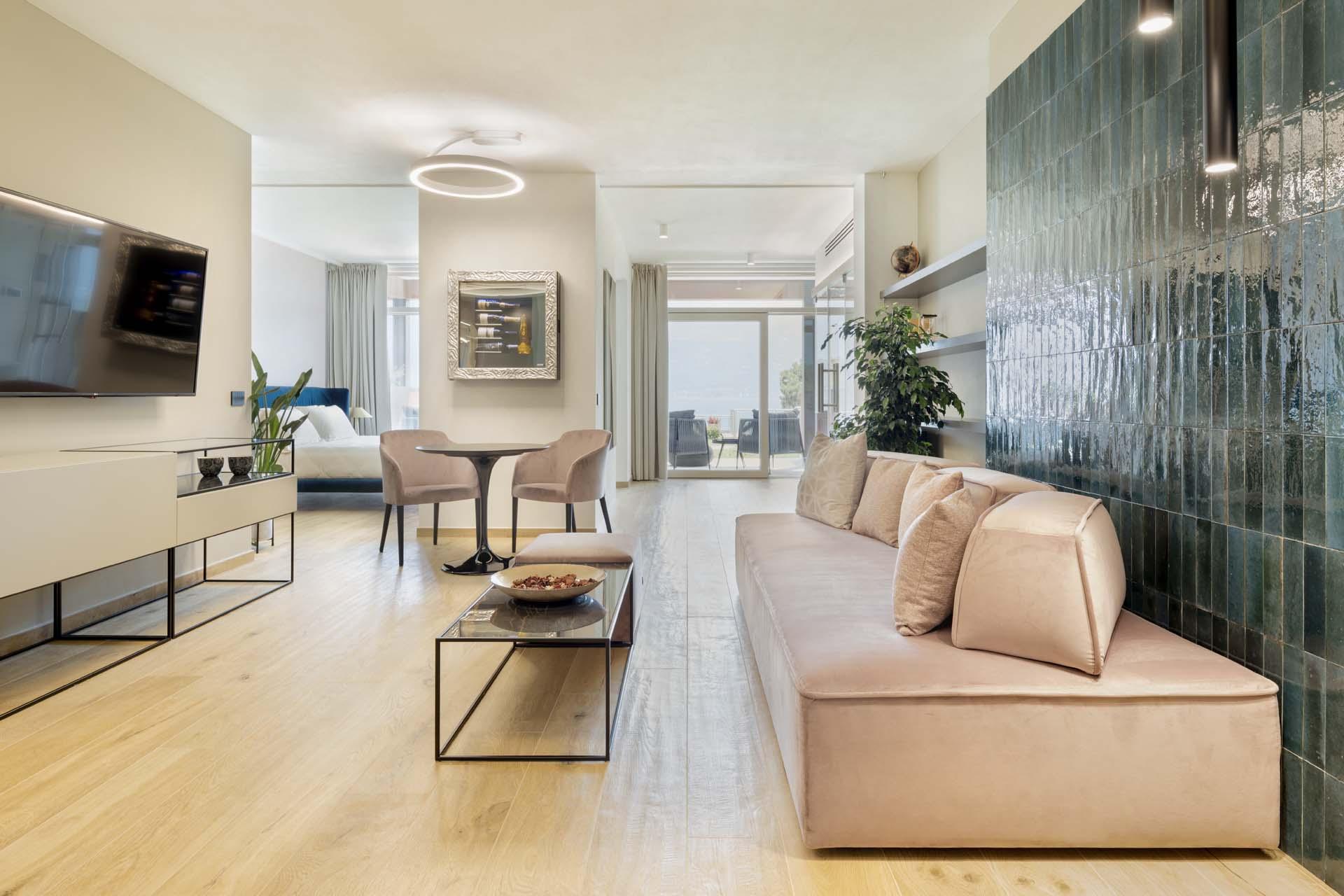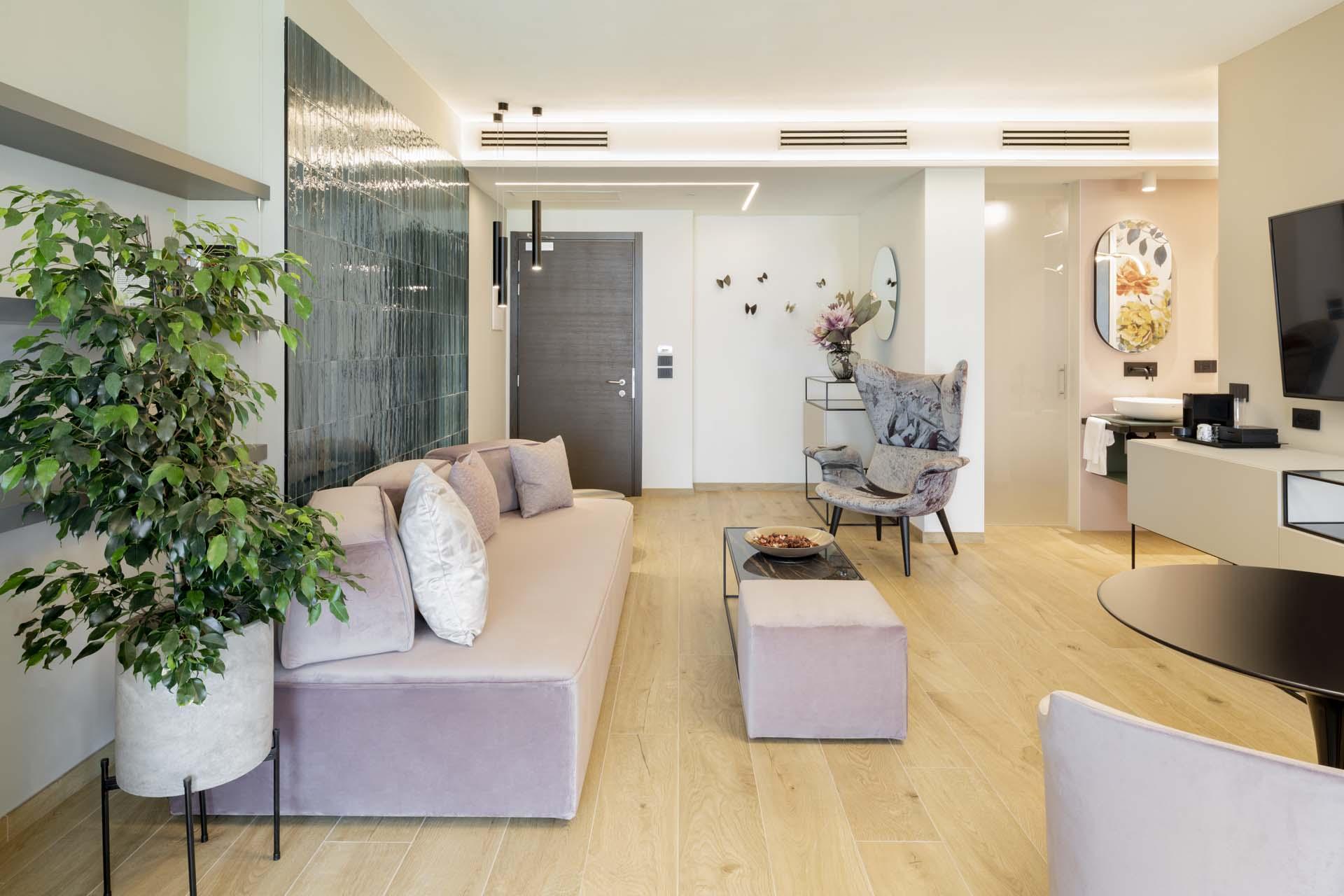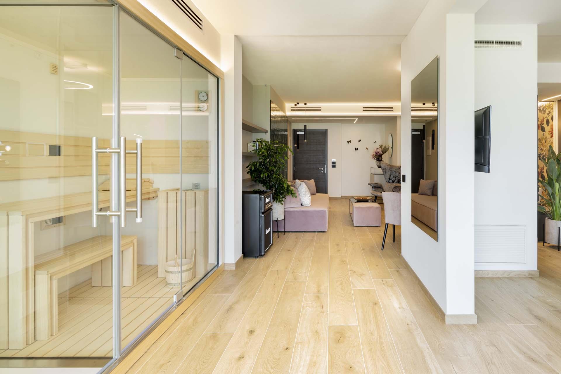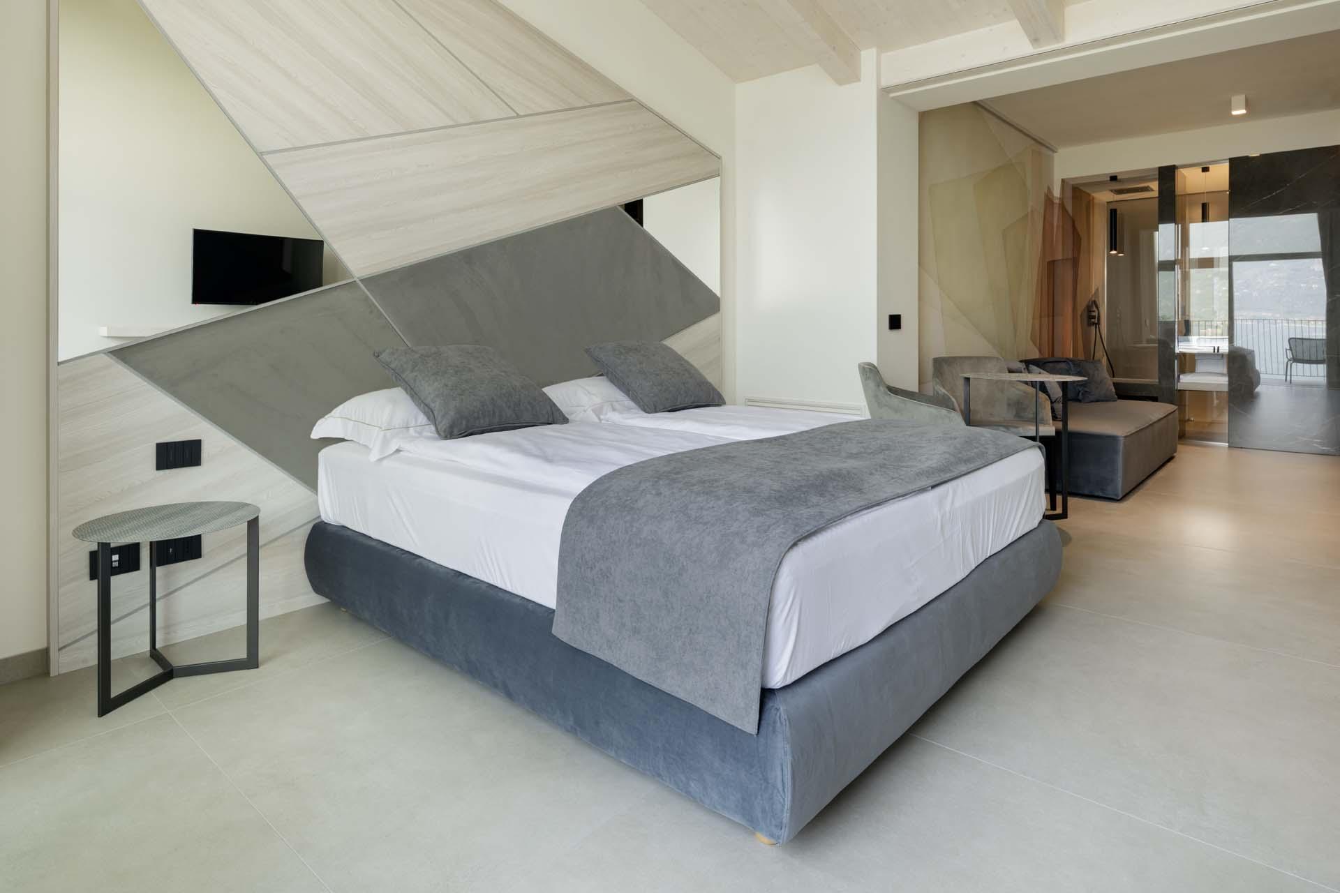 Dans la master suite, le sol fait montre de la collection Marazzi inspirée des chênes naturels Vero (22×180 cm), et dans les suites, place aux textures délicates et irrégulières de Grande Concrete Look (120×120 cm).