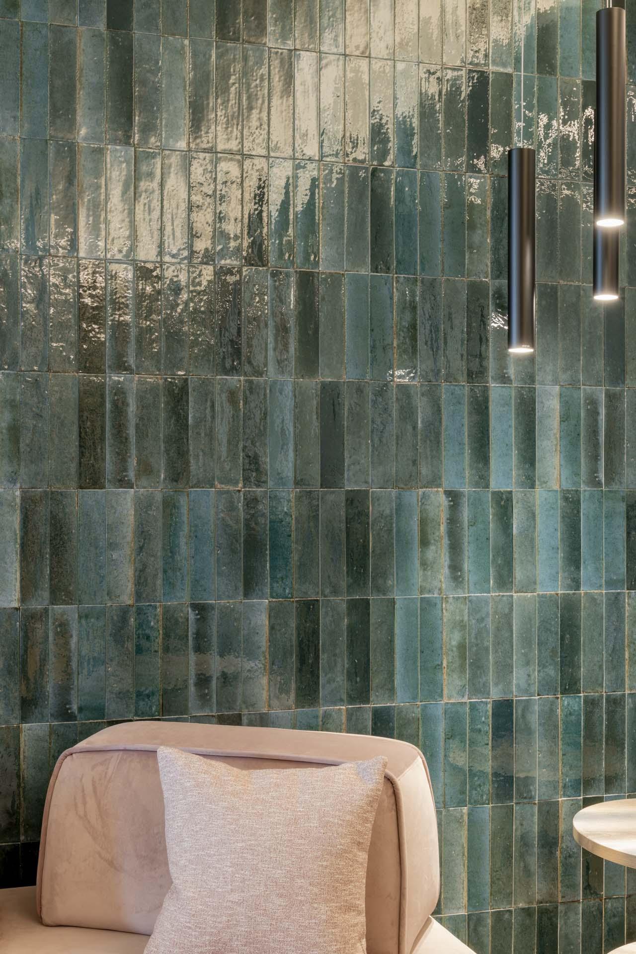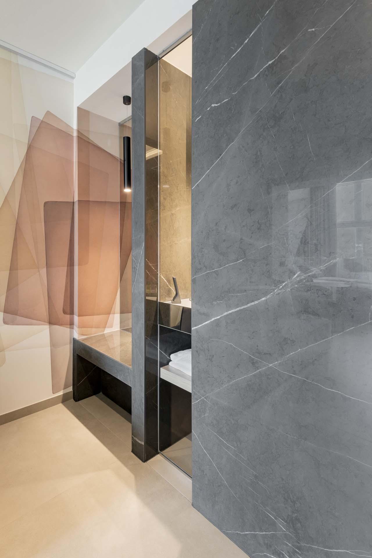 Les murs adoptent la céramique : dalles extra larges, de fine épaisseur, en grès cérame de la collection Grande Marble Look (finitions Imperiale et Saint Laurent, 120×240 cm – appliquées aussi pour revêtir les supports en continuité visuelle avec les murs), dalles de la collection Alchimia (60×180 cm) avec texture inspirée des micro-bétons. Les formats plus petits de Lume de la collection Crogiolo (6×24 cm) y apparaissent aussi pour créer des surfaces hyper brillantes qui font vibrer l’atmosphère.