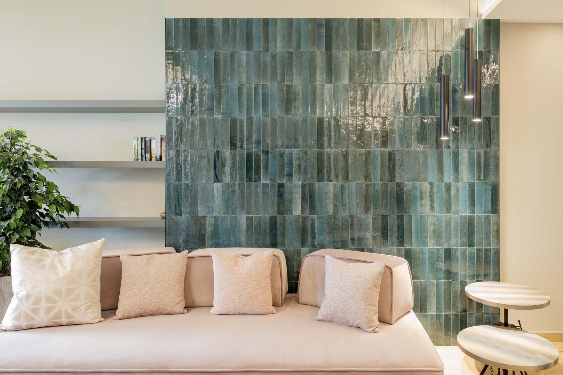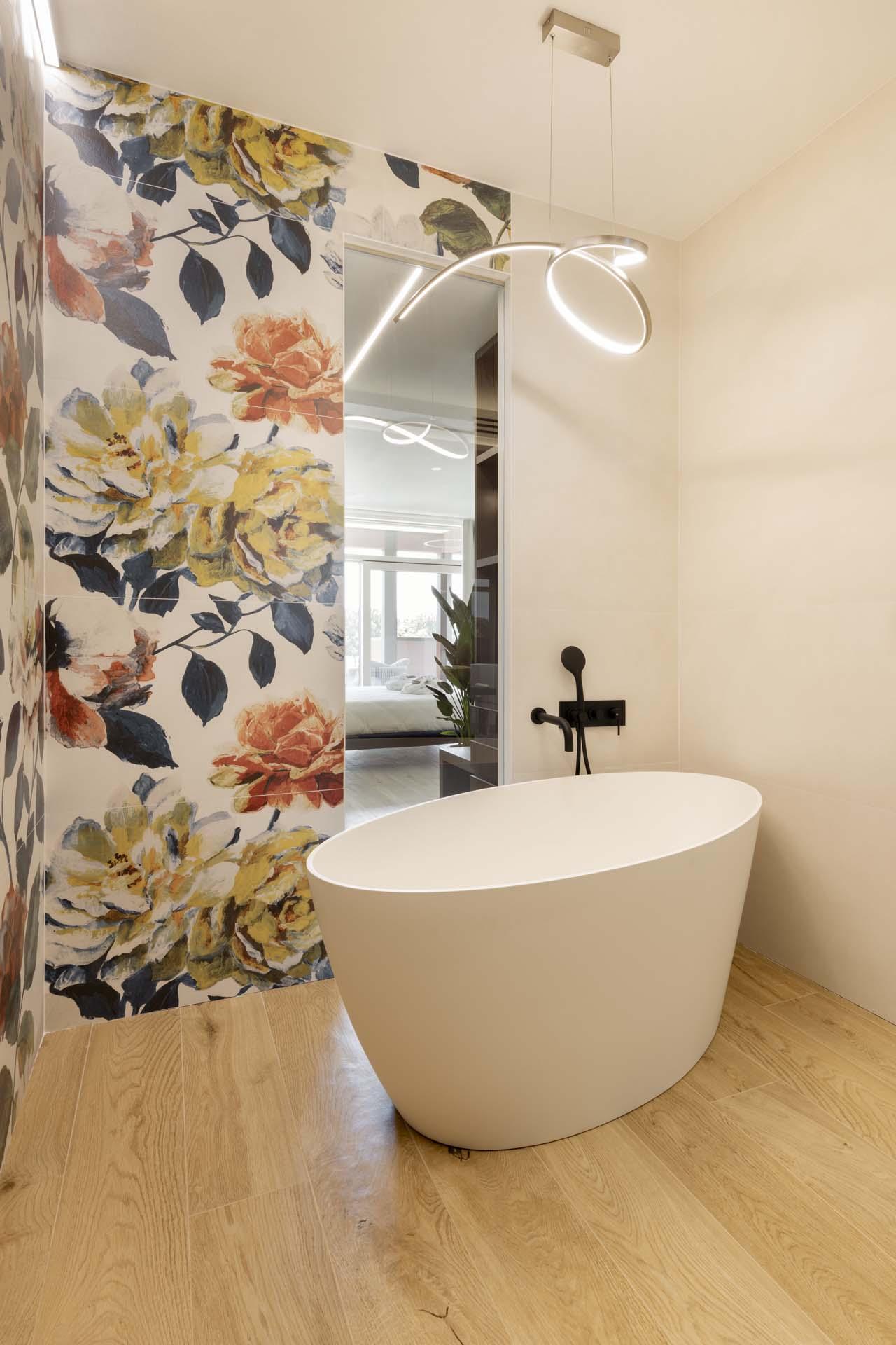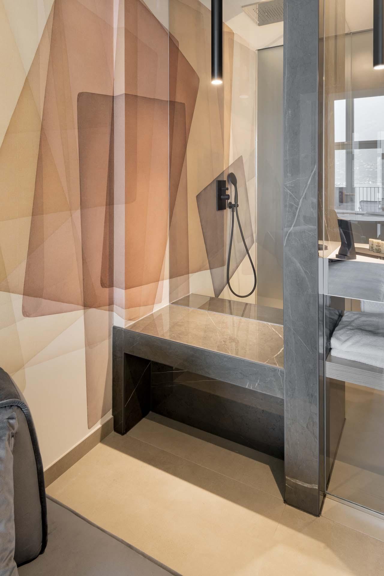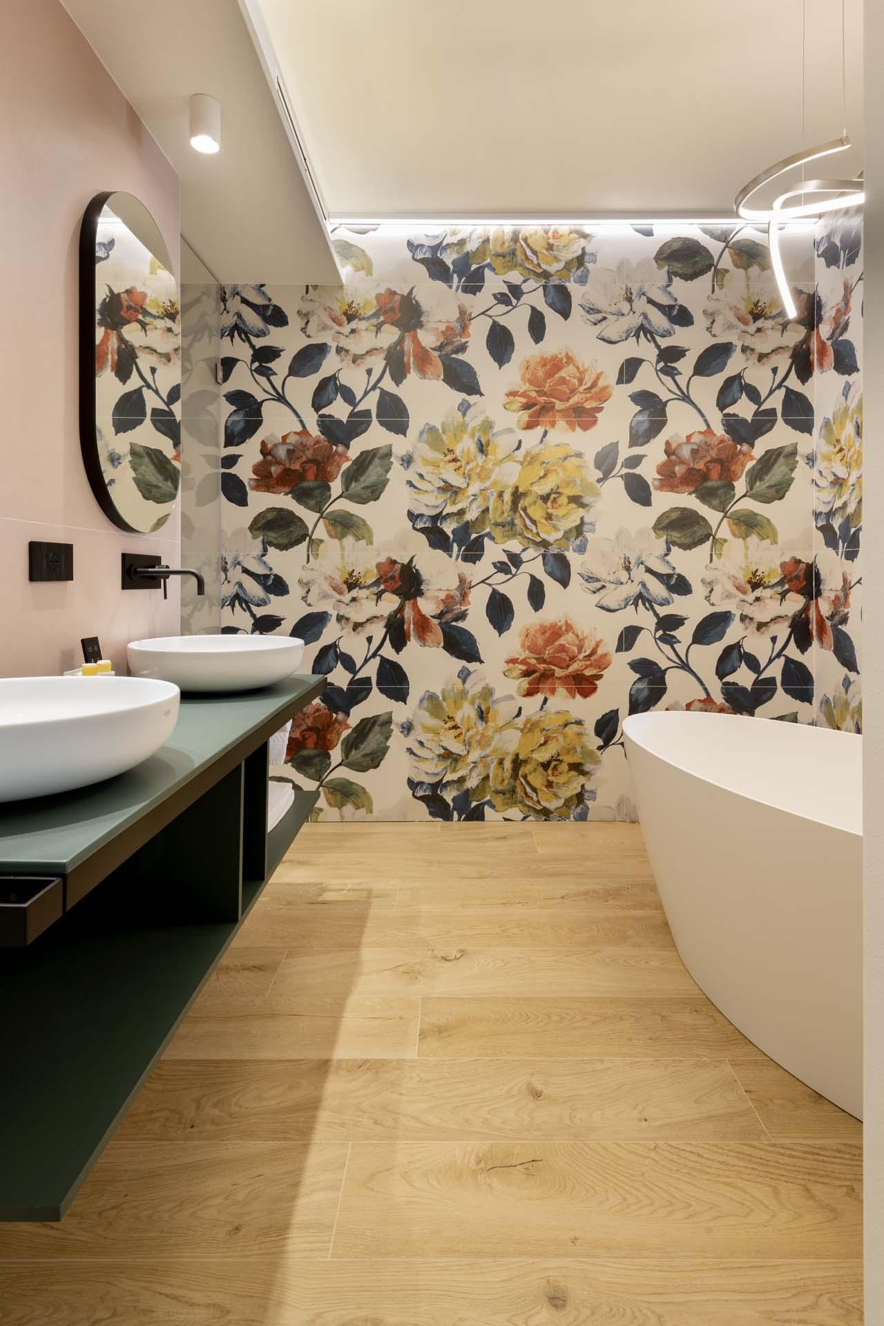 Avec une surface de près de 70 m2 organisée par des fines cloisons qui laissent entrevoir les différents espaces, la master suite affiche les fleurs hyper colorées du décor Gipsy de la collection Alchimia Marazzi. Les suites, quant à elles, se dotent de papiers peints à motifs géométriques dans les douches et dans la zone de relaxation.