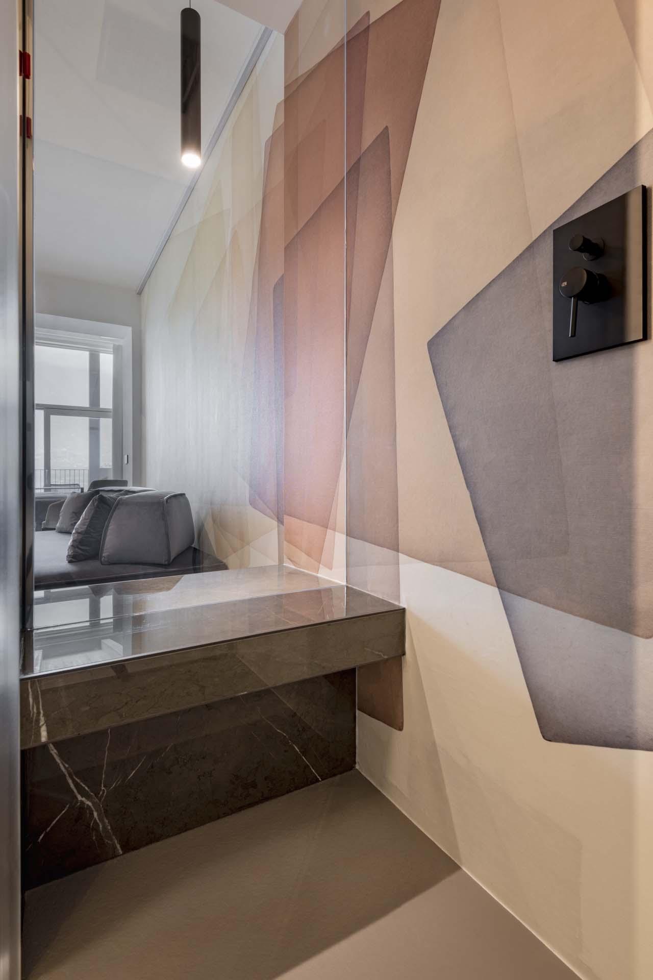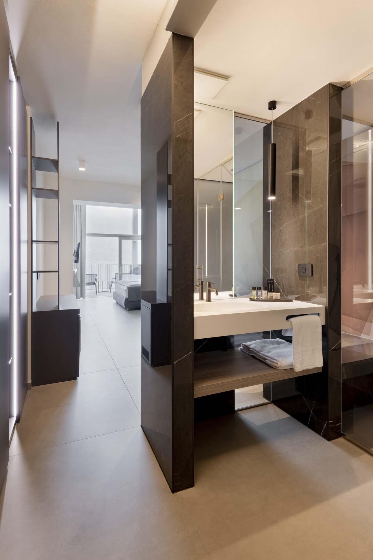 « Le projet », affirment les designers de 41 Interior & Design, « nous a plu depuis le début, puisqu’il nous permettait de tracer une ligne conceptuelle univoque, basée sur la recherche de matériaux, de couleurs et d’effets lumineux. » L’intervention respecte et évoque le contexte du lac, en tirant profit de cette relation spéciale entre l’eau et la lumière.