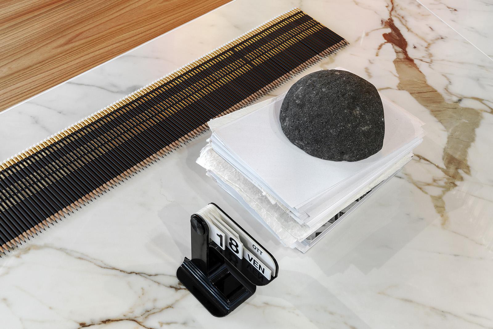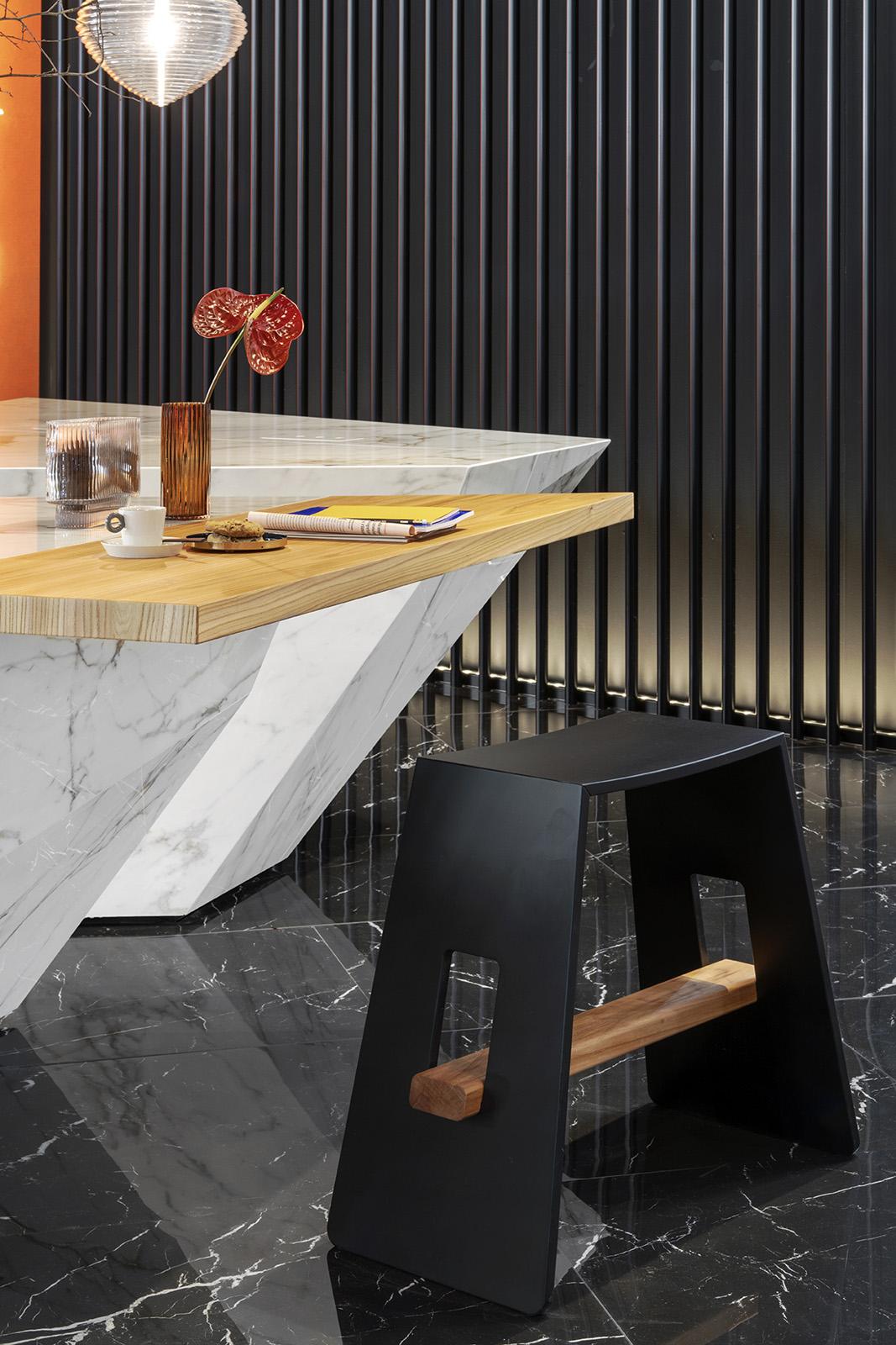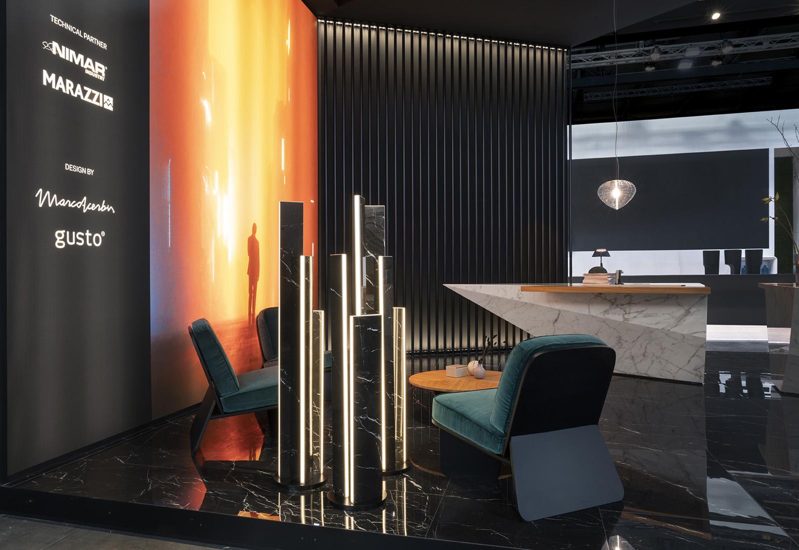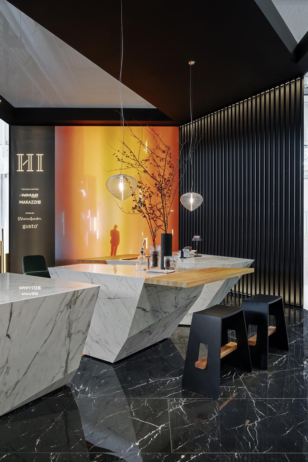Un desk de taille généreuse, de style extrêmement sculptural et trônant au beau milieu du stand, a supprimé l'idée du « devant derrière », typique du lieu consacré à l'accueil, pour se concentrer sur « le centre, sur tout ce qui est autour ». Une table plurifonctionnelle permettait aussi d'organiser un espace bar et dégustation. Toutes les surfaces s'habillaient de dalles en grès cérame Marazzi, dans les finitions Allmarble Elegant Black et Grande Marble Look Golden White. L'effet marbre secondait la cohérence esthétique et spatiale du projet en donnant lieu à d'innombrables solutions personnalisées.