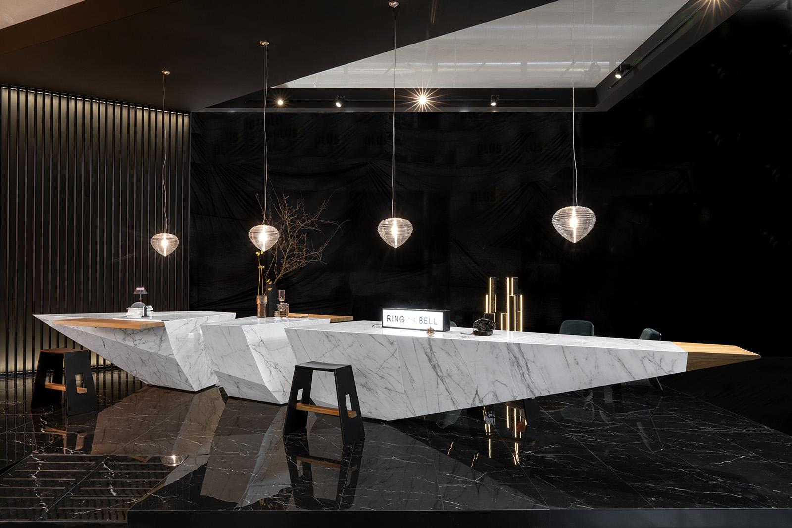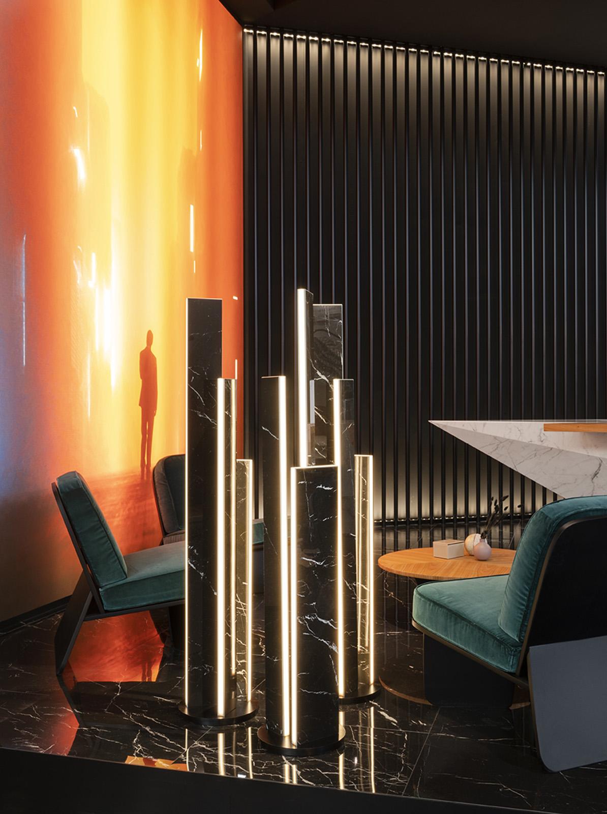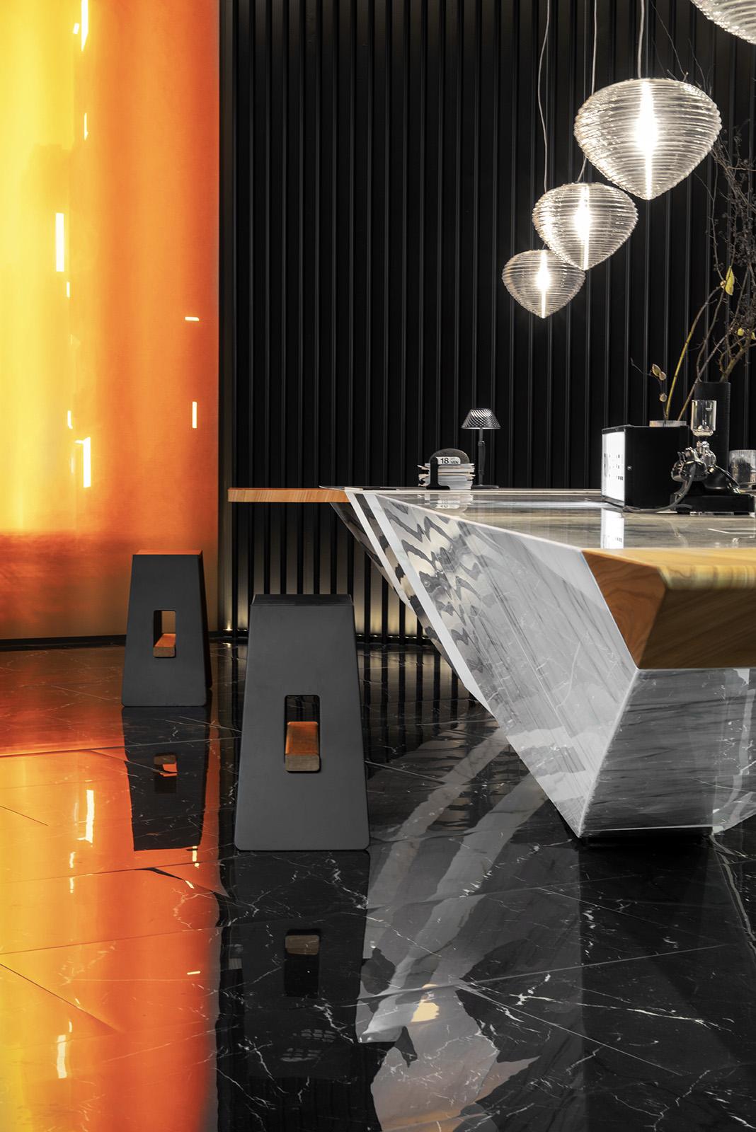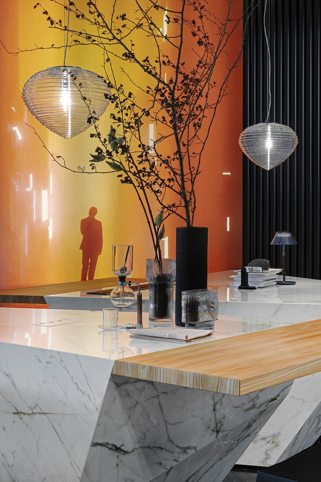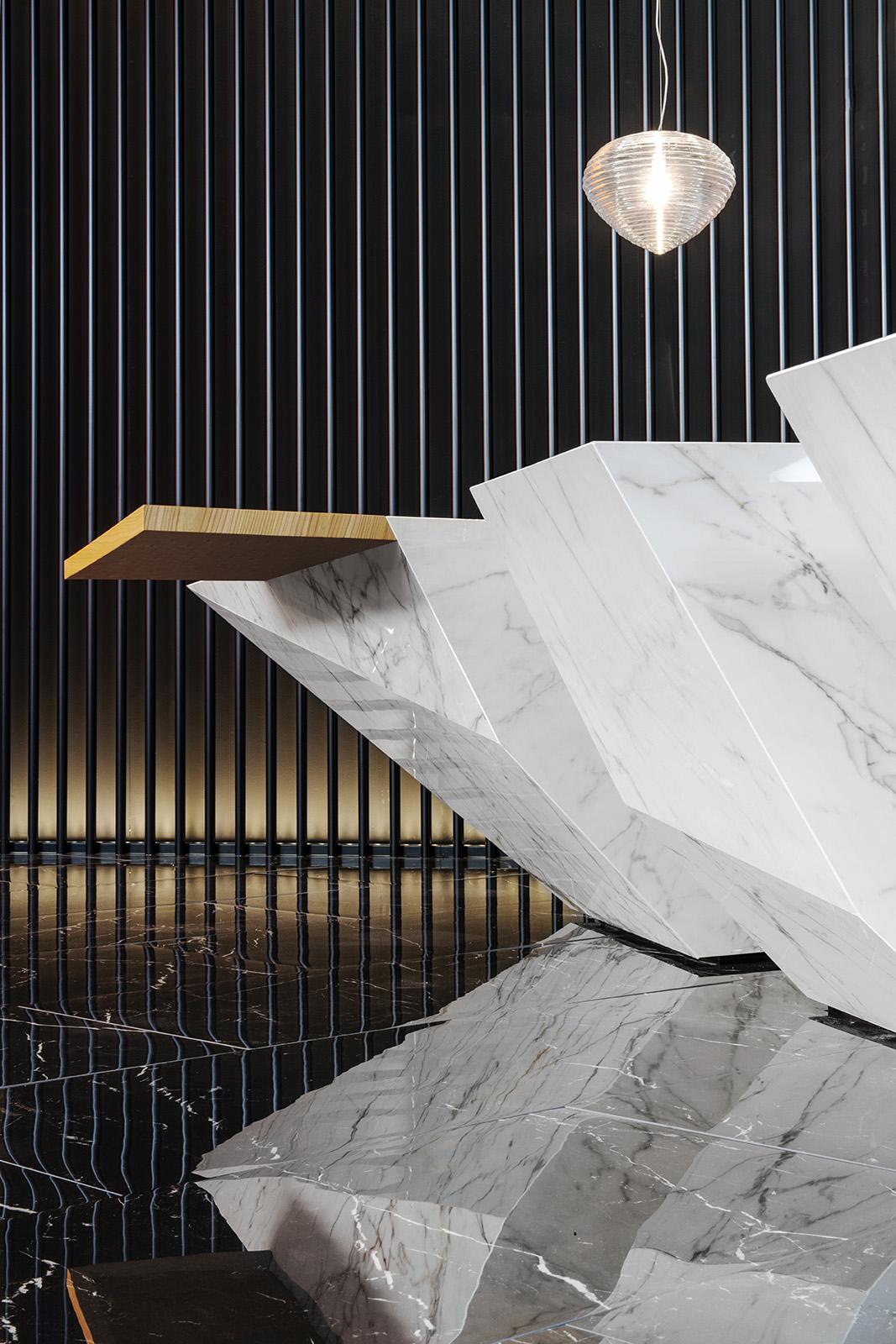 Signée par Marco Acerbis et habillée d'une surface continue dans les finitions Allmarble Elegant Black et Grande Marble Look Golden White, l'installation exprime un concept spatial qui invite à la réflexion sur la vocation publique et privée des réceptions hôtelières