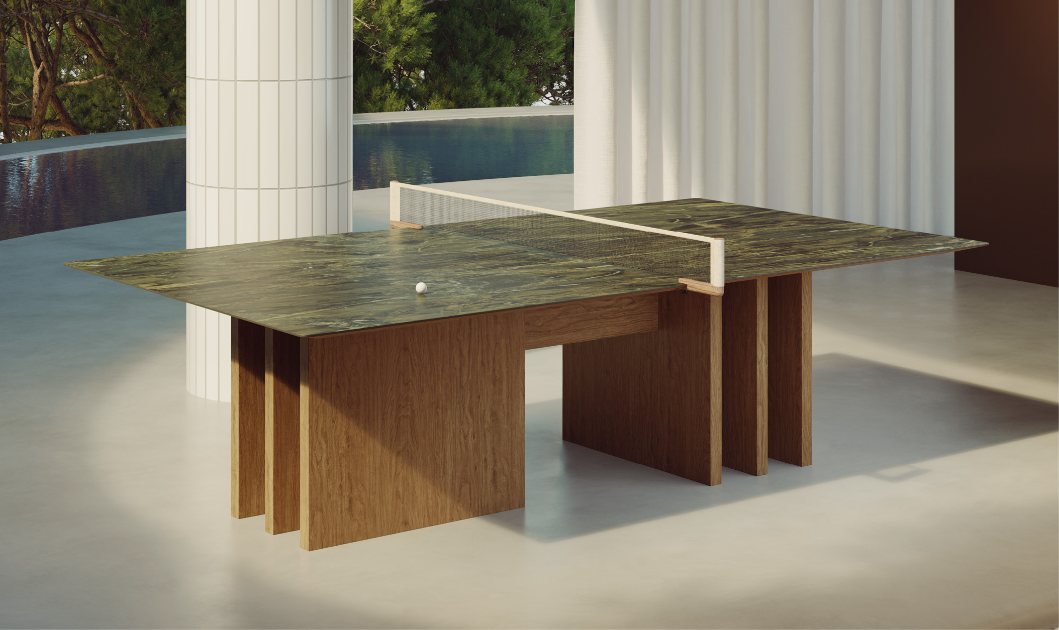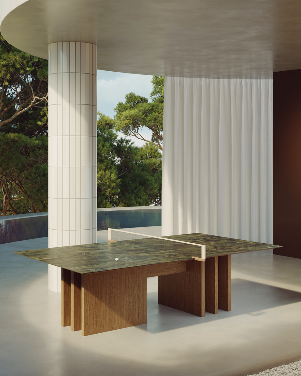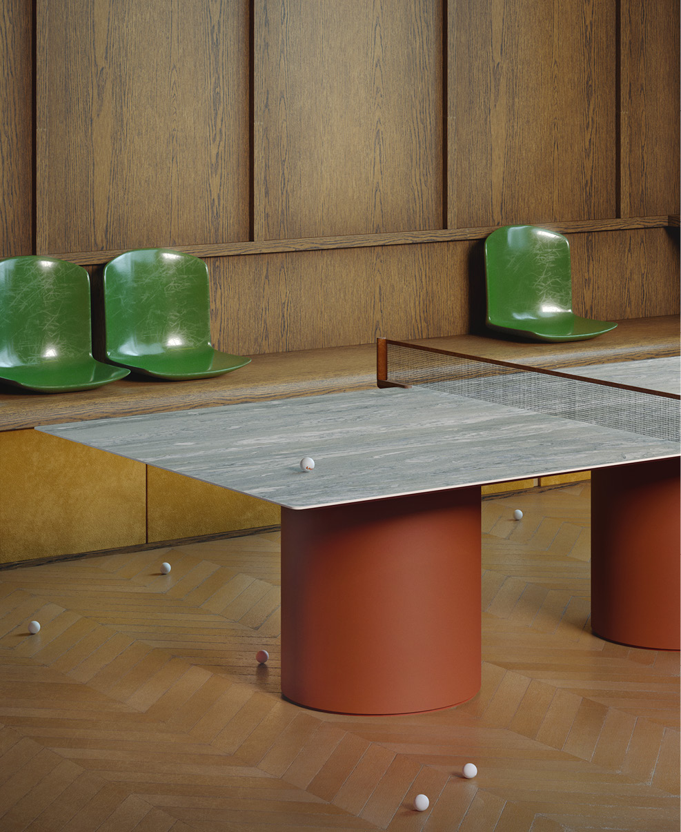 Partitina se veut à tous les égards un élément du quotidien, pour ne pas dire un élément central du design d’intérieur. Le choix s’est donc porté sur des surfaces ornementales pour le revêtement du plateau, dont Marble Look de la collection The Top en Verde Cipollino, Giallo Siena, Verde Aver et Verde Borgogna. Pour des environnements hôteliers, Saint Laurent et Calacatta à l’aspect plus classique ou Travertino à l’aspect plus neutre sont également disponibles. « Le choix des couleurs et des collections de dalles grand format Marazzi The Top s’est fondé, d’une part, sur l’association esthétique et chromatique avec les bases des tables et, d’autre part, sur la possibilité d’un bon rebond de la balle : il nous fallait une surface complètement lisse ». Par ailleurs, grâce aux propriétés antibactériennes de la technologie Premium Puro Marazzi Antibacterial, qui élimine 99 % des bactéries et des agents pathogènes des surfaces, les plateaux de table sont hygiéniques et sûrs pour la préparation et la consommation d’aliments.