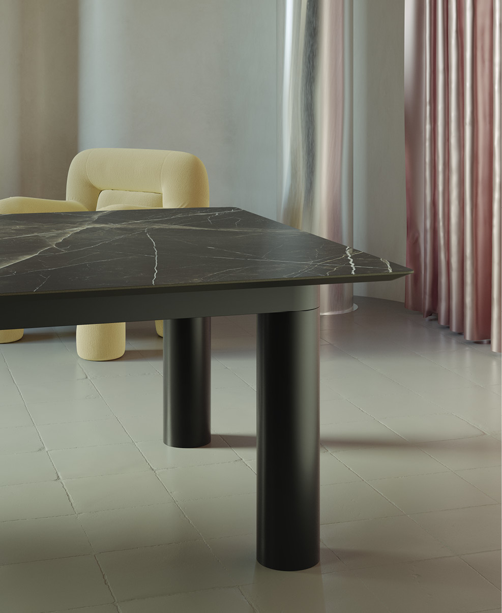 Les pieds des tables présentent 5 variantes : Partitina 0-1 a des pieds ronds et monolithiques, Partitina 0-2 quatre pieds semi-circulaires, Partitina 0-3 quatre supports aux angles, revêtus de poudre pour une utilisation en extérieur, Partitina 0-4 offre une base plus complexe avec des éléments en bois de cèdre ou en teck, de sorte qu’elle peut également être utilisée à l’extérieur et enfin, Partitina 0-5, présente un rideau, dont le tissu est personnalisable, qui dissimule la partie porteuse, évocation des rideaux sous l’évier des cuisines de nos grands-mères. Car divertissement et ironie sont la clé de voûte du projet. Partitina 0-6, une création pour Lava caractérisée par l’équilibre et la délicatesse, conçue par Gio Tirotto. La table se distingue par la structure sculpturale de ses pieds, qui se frôlent au centre dans un entrelacement sinueux et solide avant de se fondre dans le plateau.