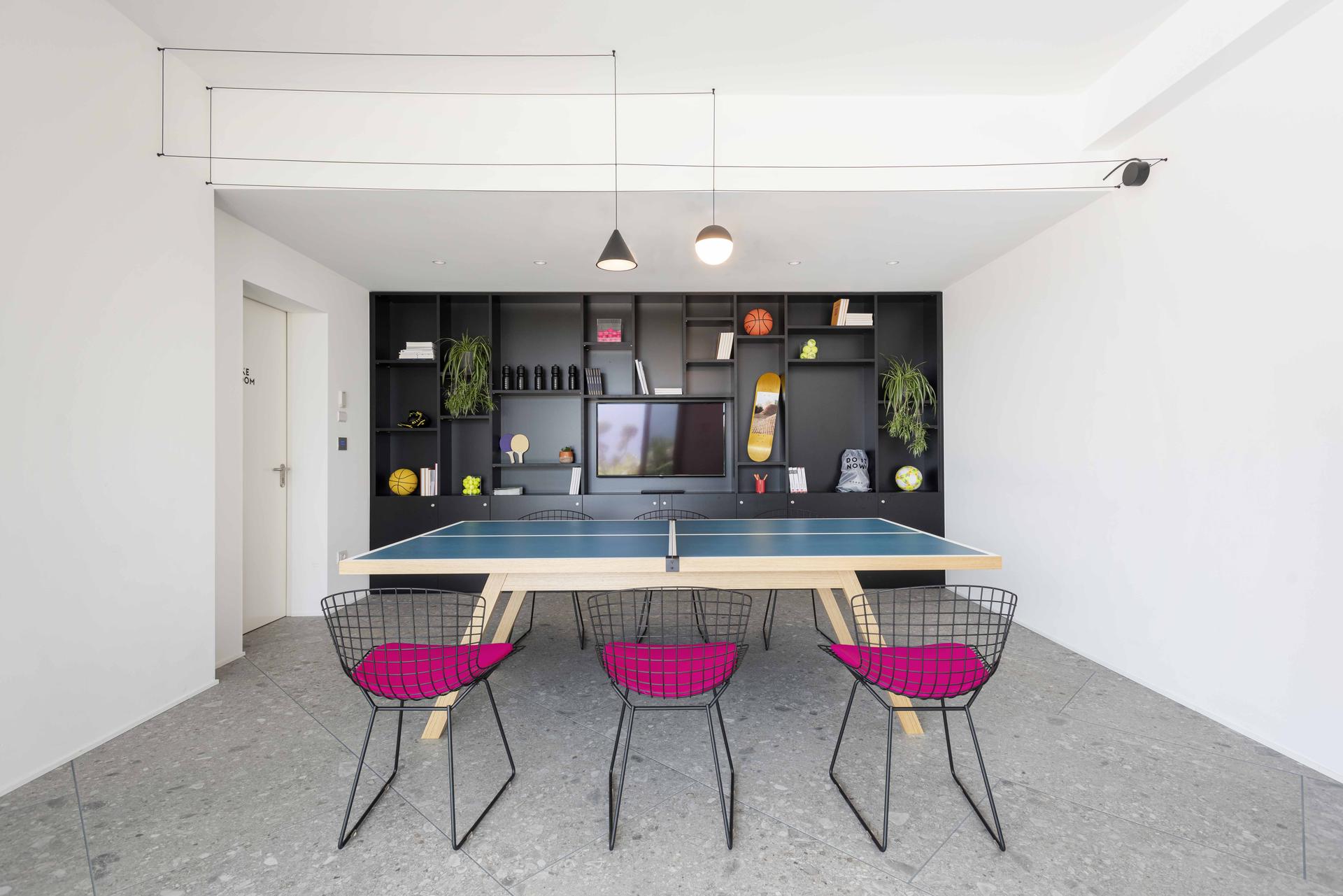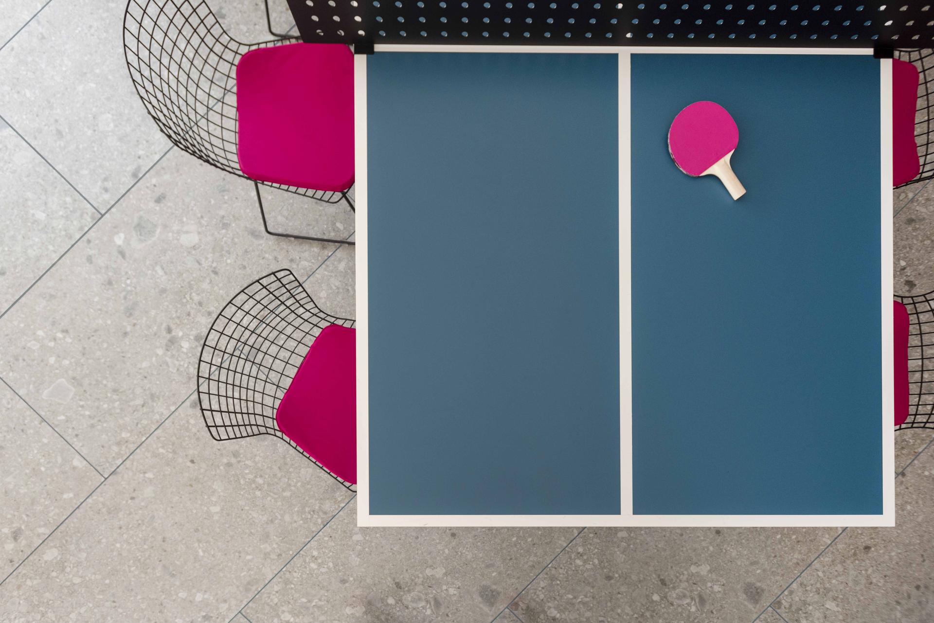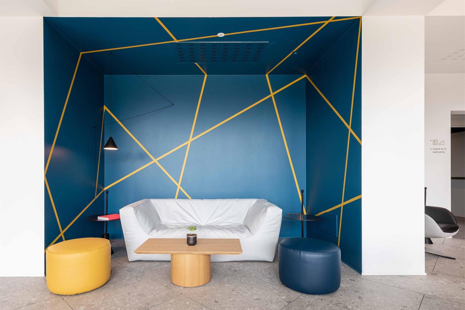 « Le thème du joint (de la ligne) est reproposé sur plusieurs éléments du projet. Le sport (et le jeu) crée souvent des trajectoires qui, dans ce cas, sont représentées par les lignes jaunes sur des murs bleus (comme les rebonds de la balle sur un court de tennis, de squash ou de Padel). Les joints deviennent ainsi partie intégrante du « jeu » et ils se colorent pour être reconnaissables (comme sur les terrains de sport, les lignes de délimitation et les couloirs sont toujours visibles pour des raisons évidentes). La pose décalée en diagonale génère du dynamisme en reprenant le concept initial. »