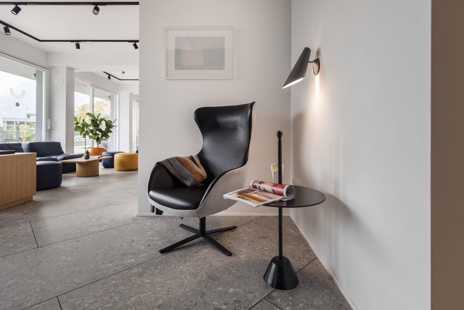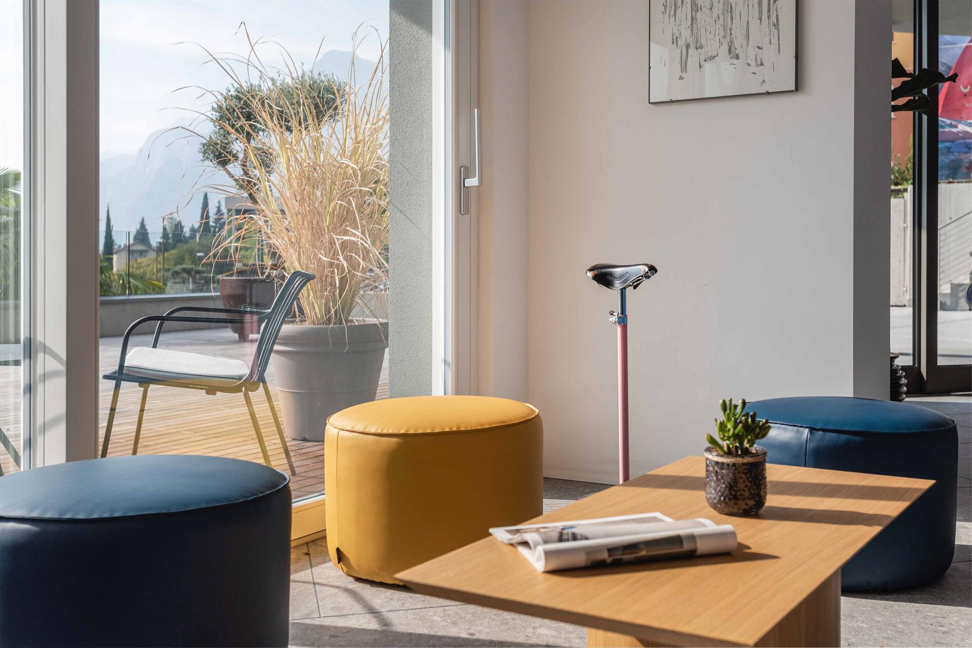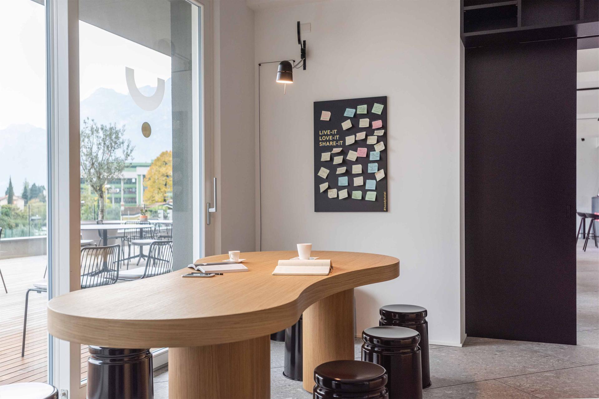 Hoody est un hôtel moderne, confortable et informel avec de vastes espaces extérieurs : les zones communes, amples et lumineuses, donnent sur une magnifique terrasse d'où les clients peuvent admirer le parc et le Château d'Arco. Les pièces sont spacieuses et communicantes, utilisables de diverses façons grâce à des meubles qui invitent au partage et à la détente. La table de la salle de réunion peut se transformer en table de ping-pong : le clin d'œil à l'activité physique et au bien-être est toujours là, mis en valeur par les couleurs et par la décoration.