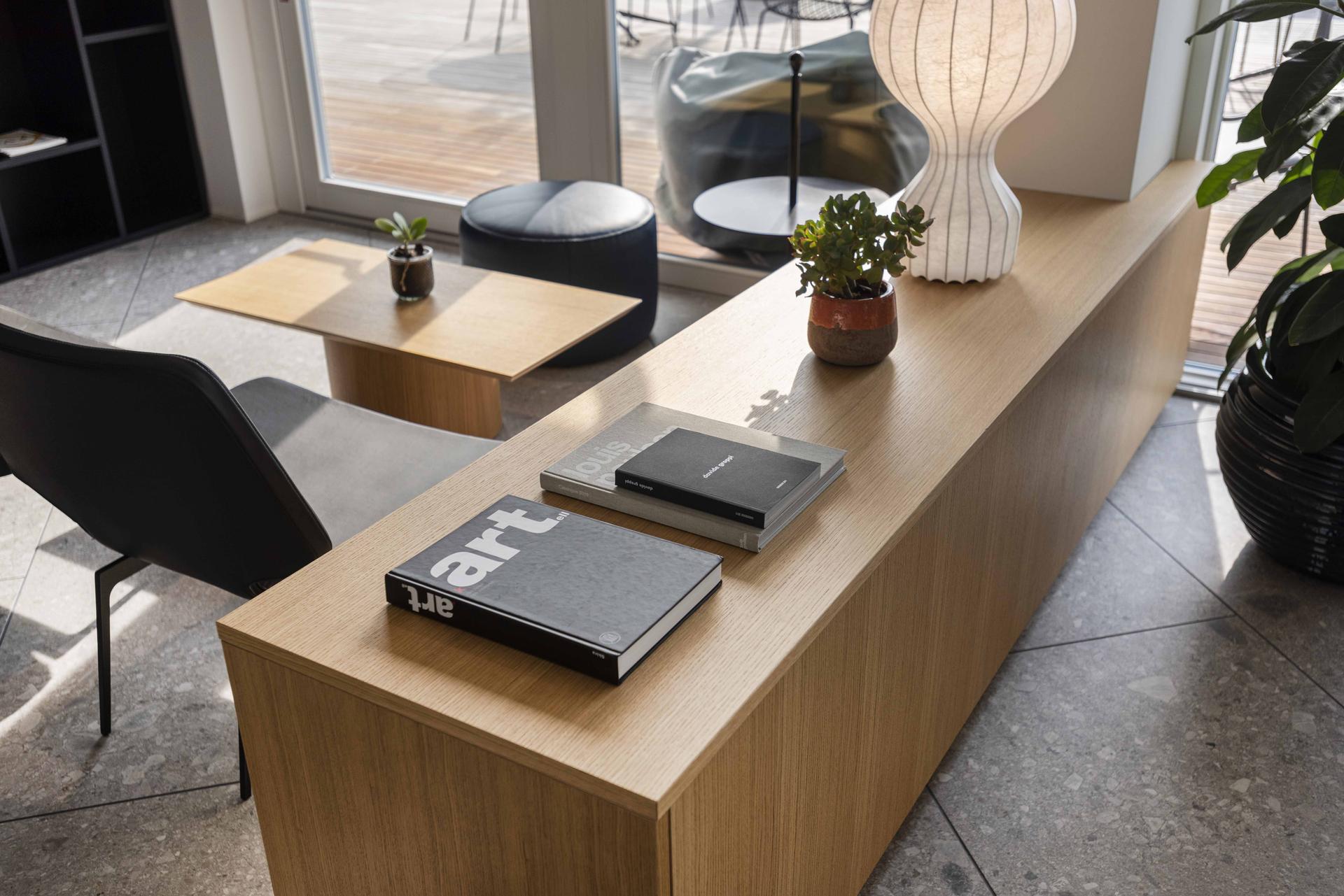 Pour le revêtement de sol en grès, nous avons sélectionné un format 75×150 développé en diagonale pour exalter le dynamisme des espaces intérieurs :