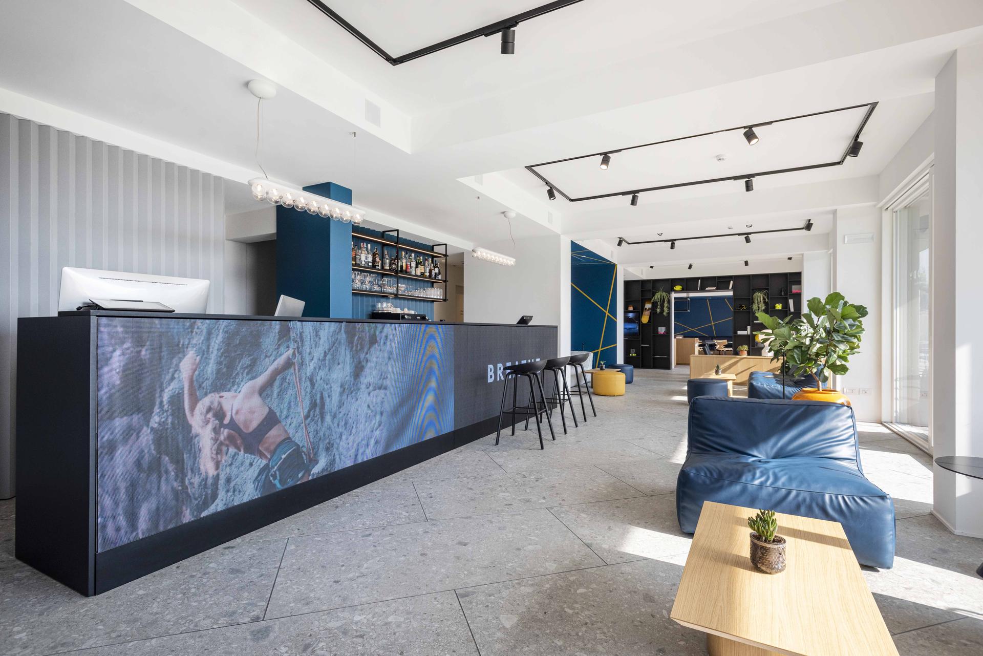 Un hôtel frais et moderne grâce à l'utilisation originale des couleurs fortes (jaune et bleu principalement) et aux ameublements insolites. Tous les détails du projet ont fait l'objet d'une analyse minutieuse et cohérente avec le concept de base.