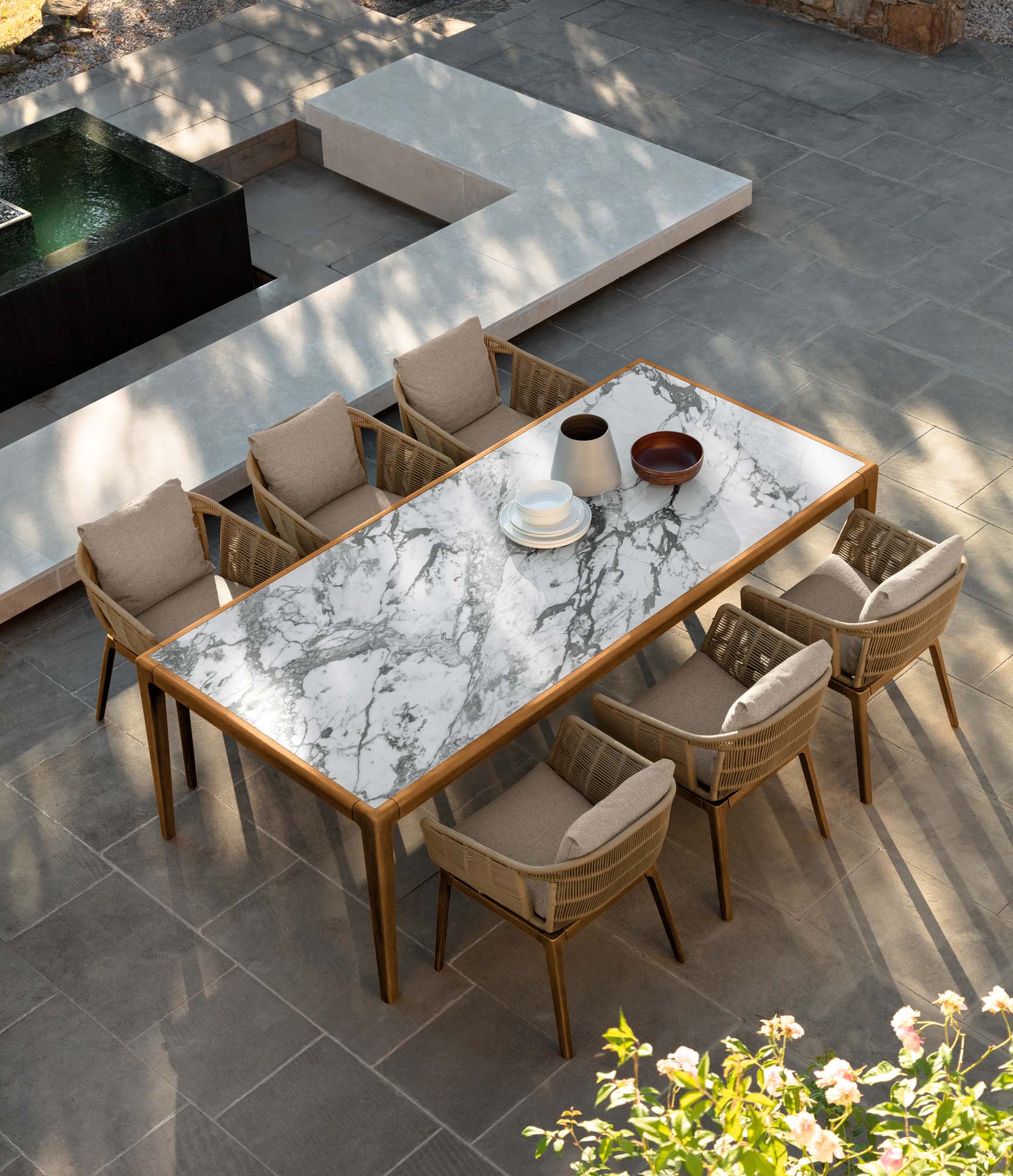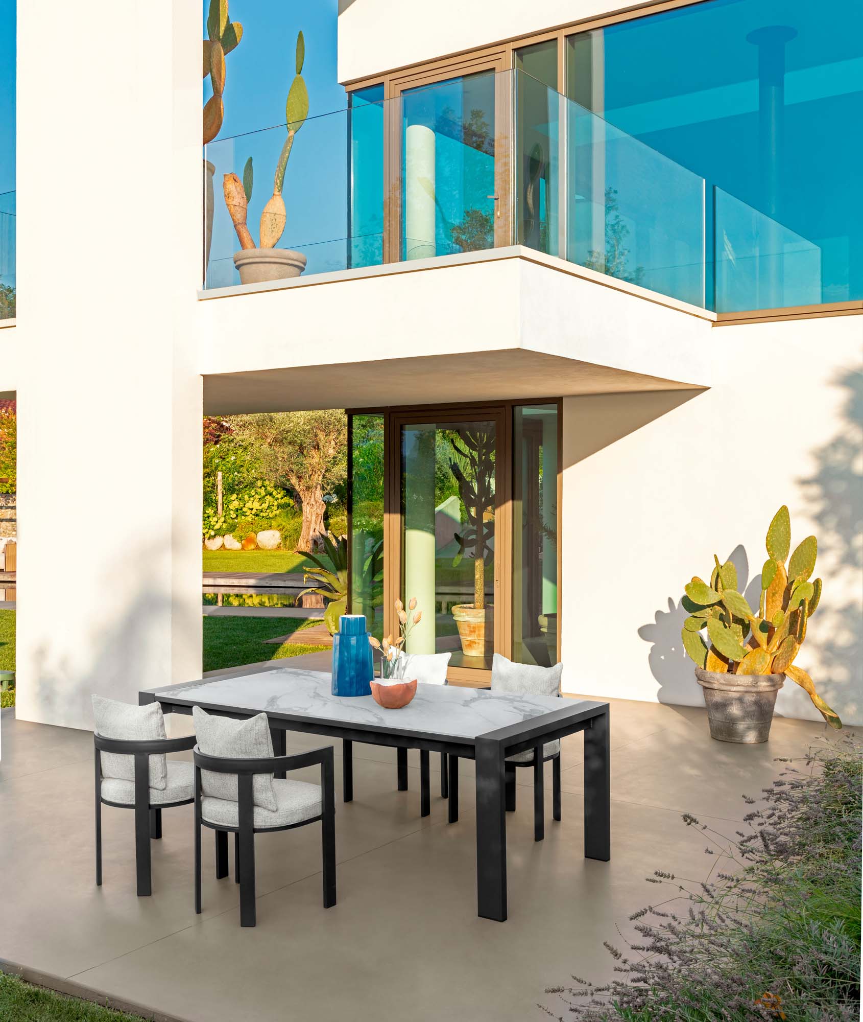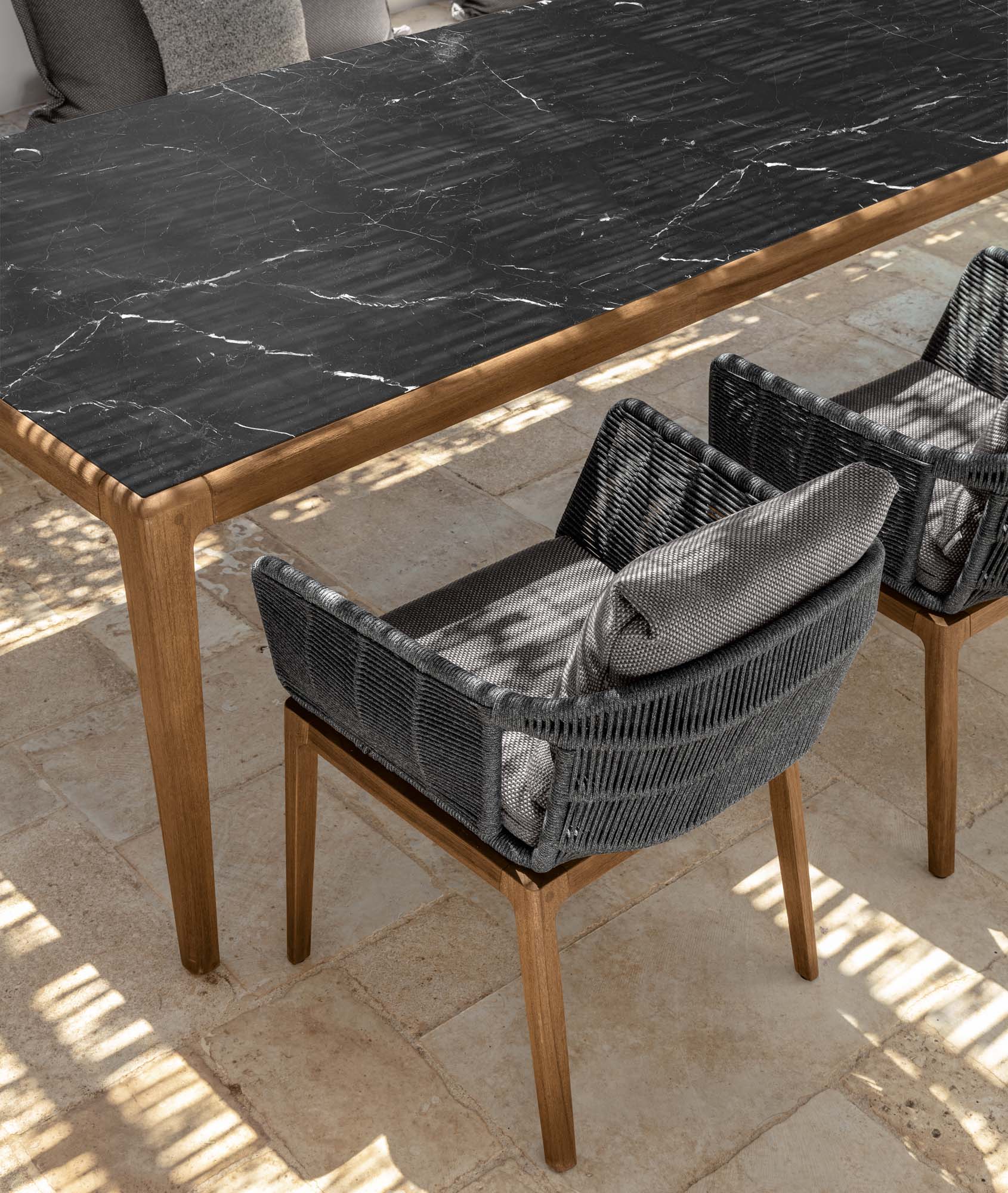 Probablement la table Cruise Teak de 320×120 cm, où le plateau de la finition The Top Marble Look Capraia ou Elegant Black offre un parfait contraste avec la structure en bois de teck fumé. C’est l’un des produits les plus élégants, qui met en valeur le savoir-faire de l’entreprise en termes d’artisanat et de souci du détail. Une pièce où la dalle en grès a indéniablement un rôle de premier plan.