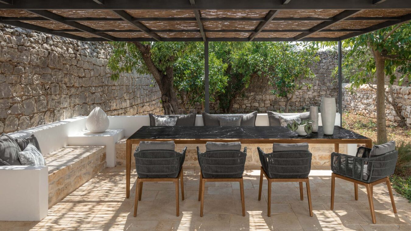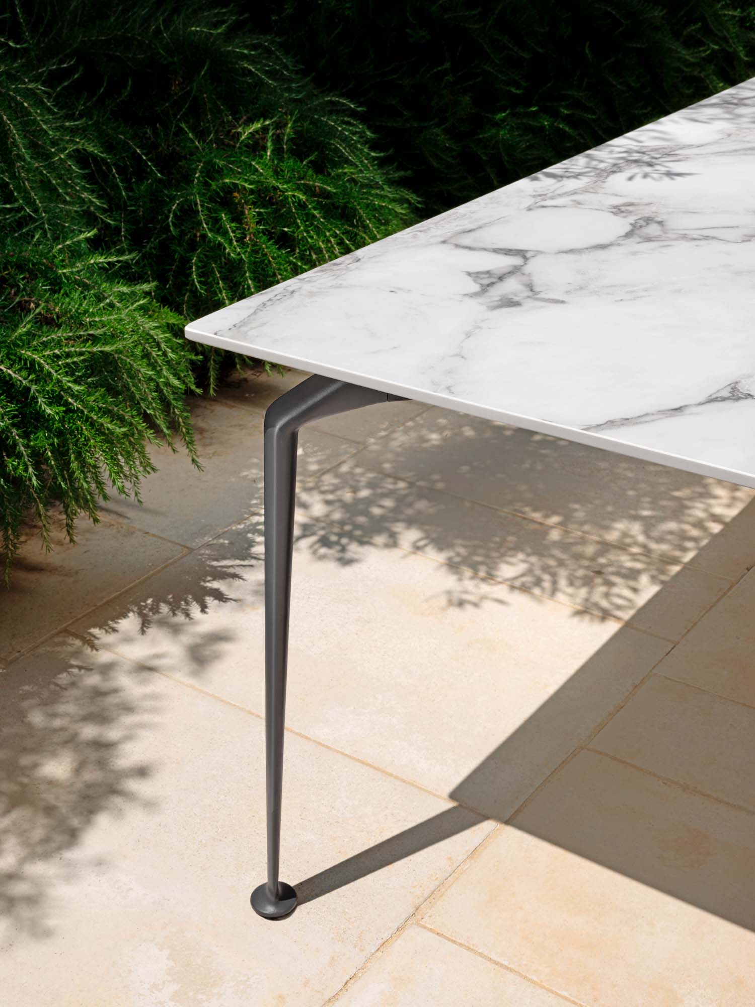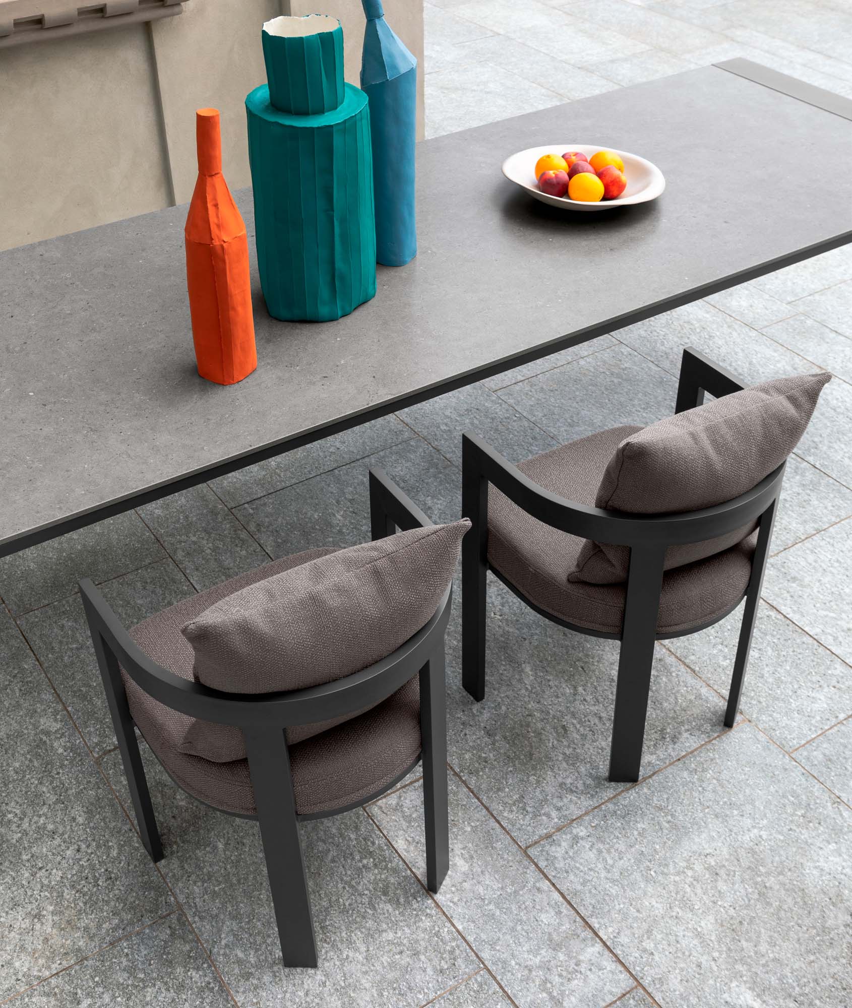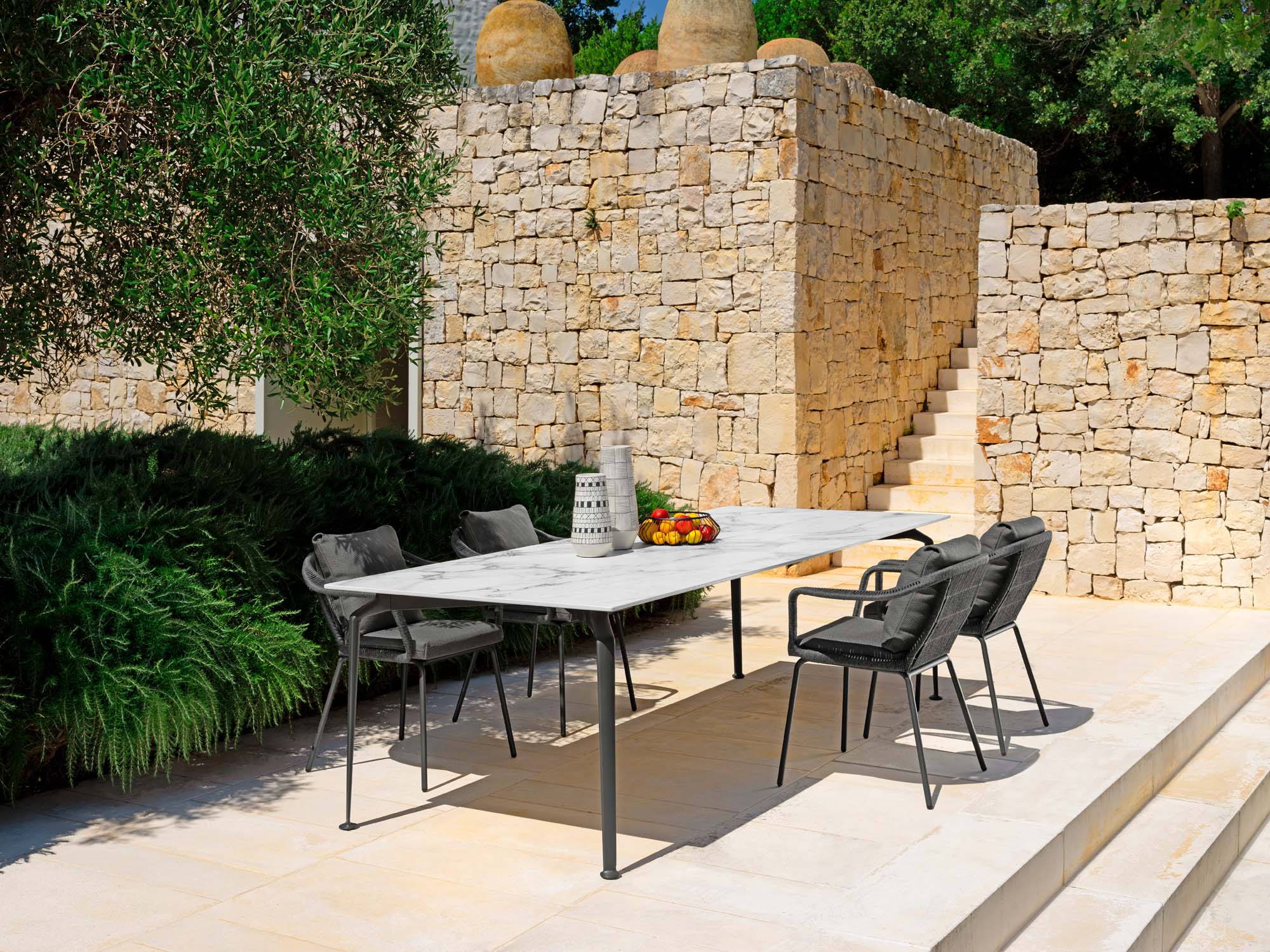 Probablement la table Cruise Teak de 320×120 cm, où le plateau de la finition The Top Marble Look Capraia ou Elegant Black offre un parfait contraste avec la structure en bois de teck fumé. C’est l’un des produits les plus élégants, qui met en valeur le savoir-faire de l’entreprise en termes d’artisanat et de souci du détail. Une pièce où la dalle en grès a indéniablement un rôle de premier plan.