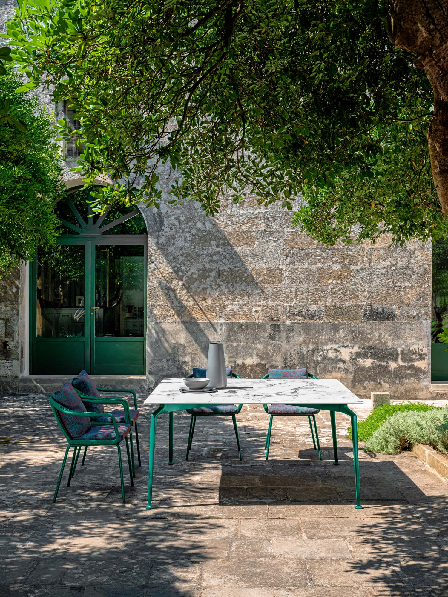 Résistance aux agents atmosphériques et durabilité sont deux impératifs. C’est pourquoi une grande partie de notre production est axée sur des matériaux facilement recyclables. Outre les bois comme le teck certifié FSC et le bois Accoya, une essence résineuse à croissance rapide traitée par un procédé non toxique, nous utilisons l’aluminium, polyvalent et recyclable à l’infini, l’acier, doté d’une très grande résistance à la corrosion et le béton, travaillé de façon artisanale. Pour les plateaux de nos tables, le choix se porte sur des matières premières respectueuses de l’environnement, qui non seulement résistent à la pluie et aux amplitudes thermiques, mais sont également faciles à entretenir. Le grès cérame, qui, grâce à sa polyvalence, offre une large gamme de finitions et se retrouve dans 70% de nos collections, est incontournable. Viennent ensuite le VittEr, un stratifié compact produit sans formaldéhyde, la pierre naturelle et la pierre de lave, qui présente une finition extra brillante grâce au procédé de céramisation du verre recyclé et fondu.
