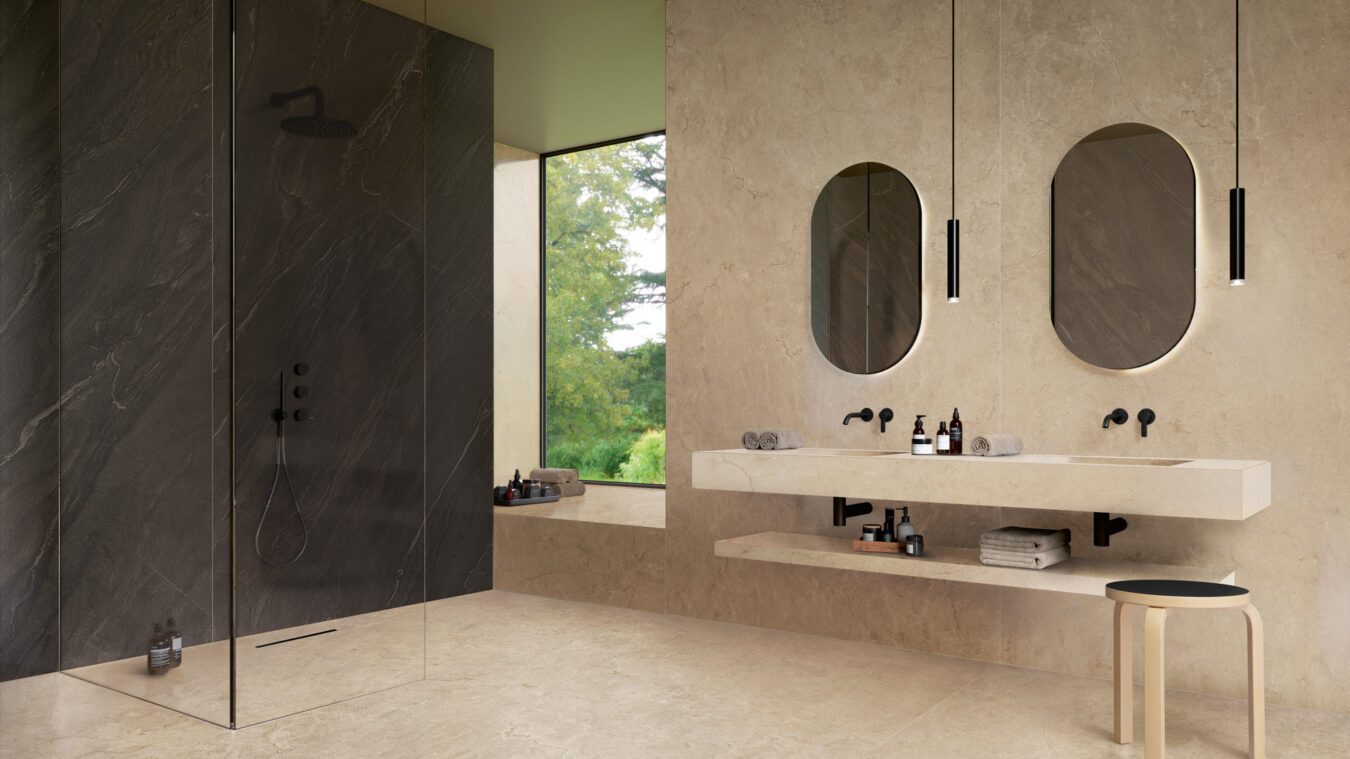 Géométries et volumes amplement revêtus, où apprécier les contrastes de couleurs et les nuances de veinages parcourant les précieuses variétés de pierre et de marbre : les scénographies évocatrices du bien-être se déploient dans les salles de bains privées. Le riche catalogue d’effets marbre et pierre de The Top Marble Look et Stone Look permet de créer des cadres luxueux qui sortent de l’ordinaire. Les différences de couleurs et textures des collections donnent libre cours à des associations ton sur ton ou des contrastes de matière, comme celles des grains compacts et uniformes du porphyre ou du calcaire et les grandes géométries du granit et du quartz translucides de Marble Look Patagonia. Les grandes dalles permettent également de jouer avec la pose en soulignant le mouvement des veines, ou encore, avec certaines collections, d’utiliser la pose en livre ouvert pour créer un effet de reflet sur le mur.