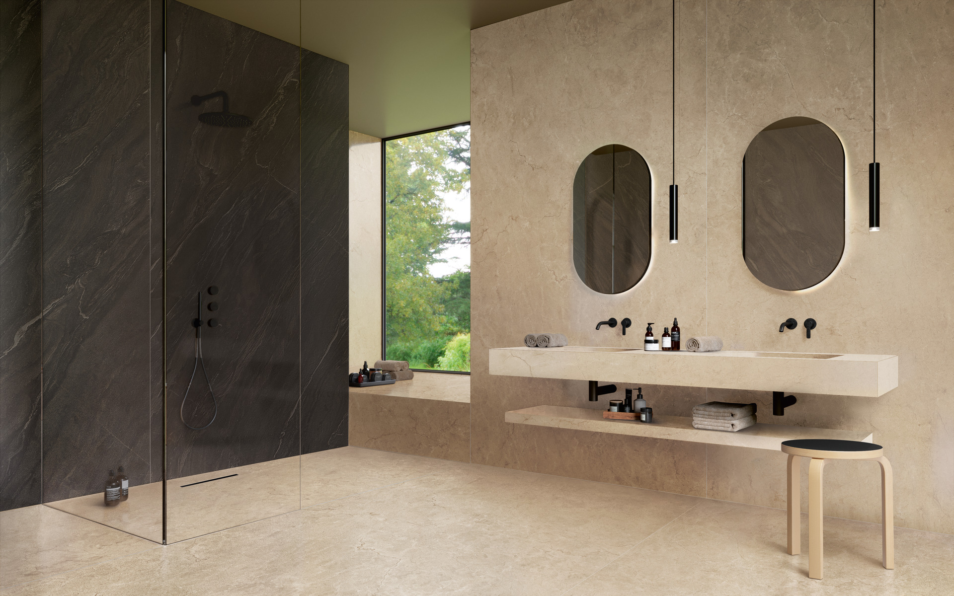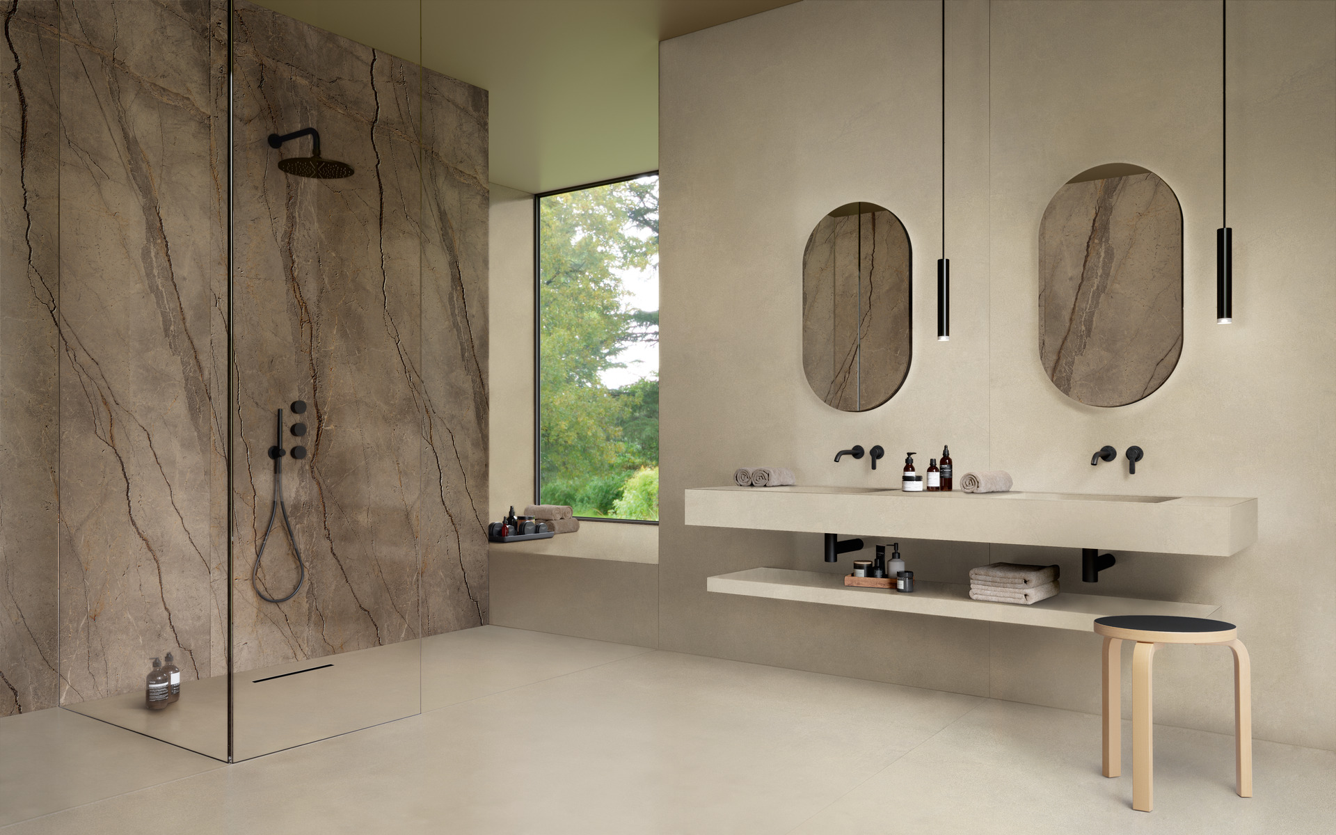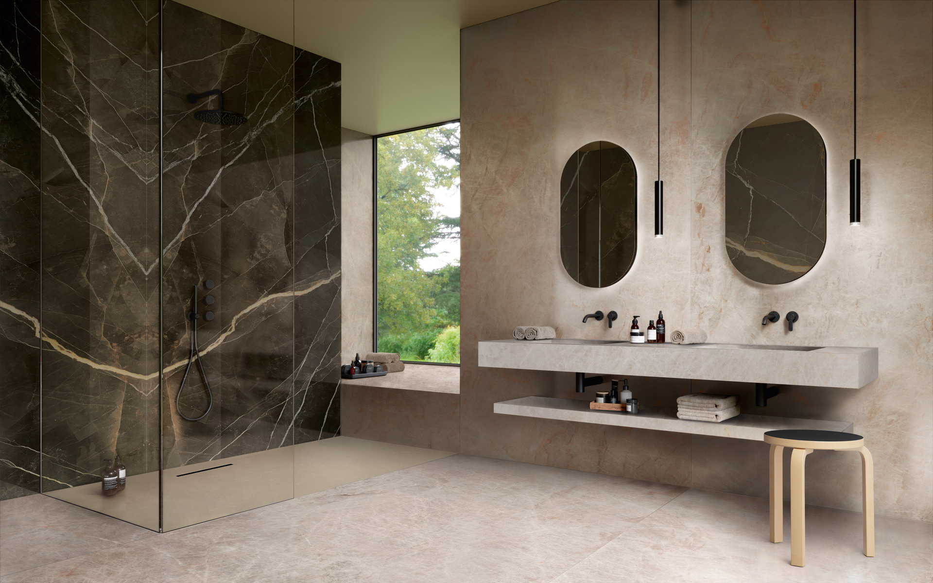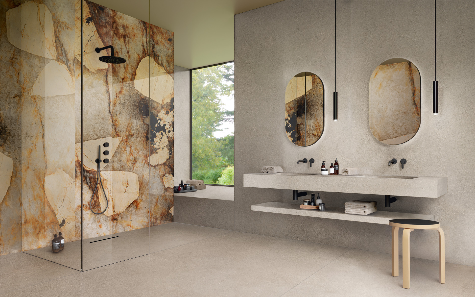 La salle de bains est un lieu de bien-être où exprimer son propre style. C’est aussi un cadre d’expérimentation au niveau de la conception, notamment grâce aux performances du grès cérame dans les dalles grand format The Top allant jusqu’à 162×324 cm et une décoration extrêmement soignée dans la définition de l’impression comme dans la matérialité des textures au toucher. L’affranchissement des contraintes techniques (production, dimensions, mécanique, durabilité et entretien), d’une part, la possibilité de revêtir de dalles de grand format les murs et les sols mais aussi les éléments de mobilier comme les plans, les étagères et les lavabos, de l’autre, donnent à la salle de bains les caractéristiques d’un centre de spa.