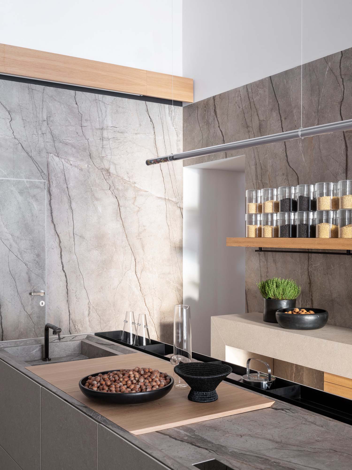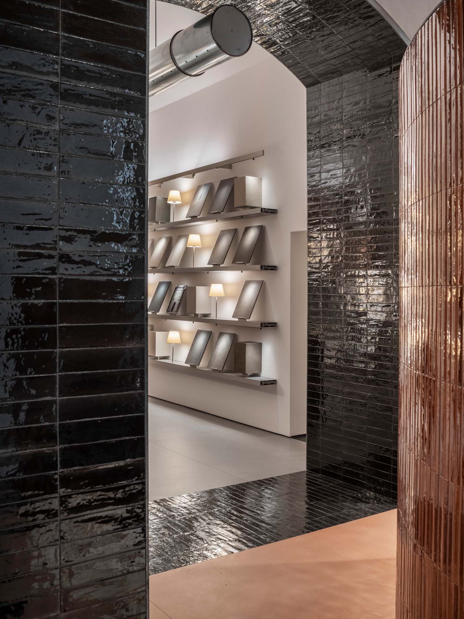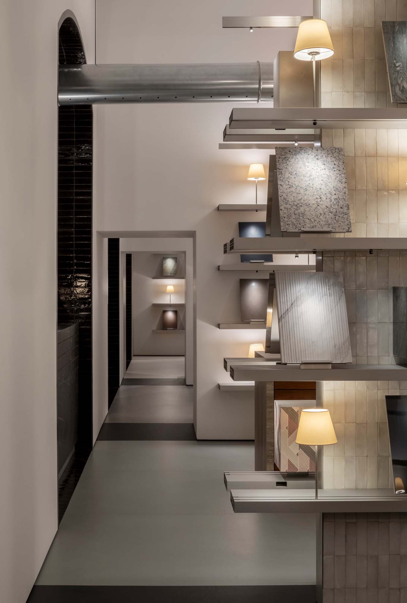 Une succession de salles thématiques met en valeur la préciosité des matériaux Marazzi, qui, exposés dans des espaces dynamiques et interconnectés, dialoguent avec l’architecture pour créer un flux visuel qui invite les visiteurs à explorer chaque détail.