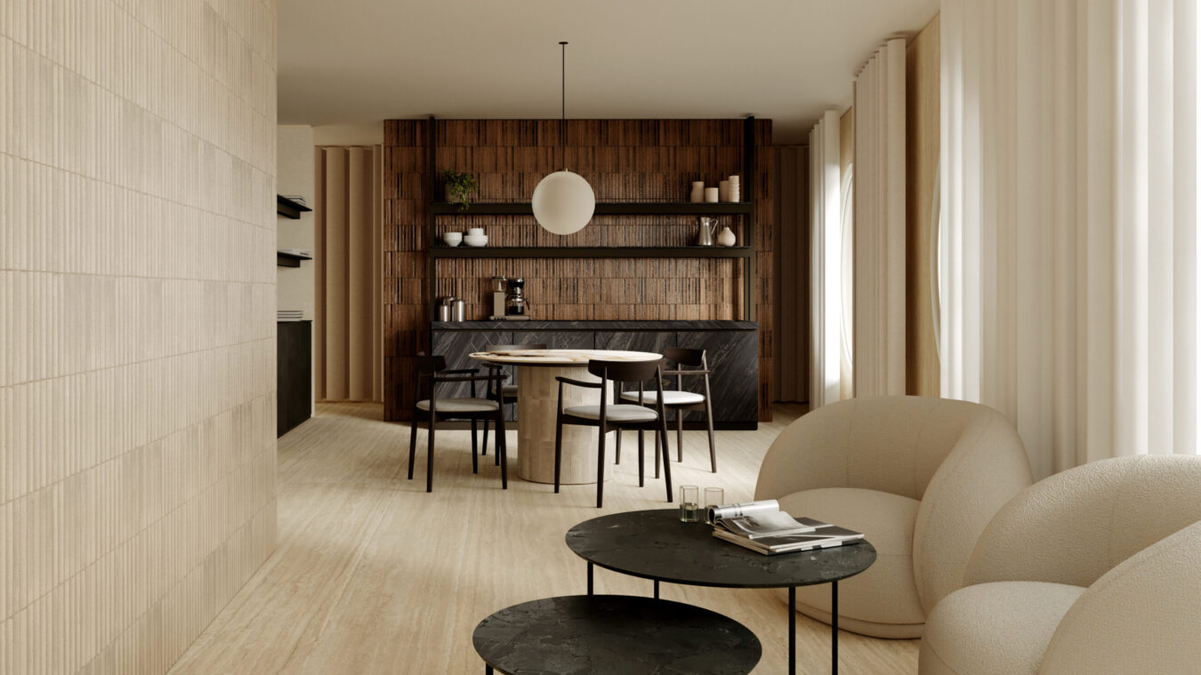 Les grandes plaques en grès effet pierre Travertino Classico et Berici Beige créent un fond aux teintes neutres et tactiles, enrichies par la technologie 3D Ink, qui donne profondeur et caractère aux surfaces. Les espaces sont conçus pour offrir une expérience d’hospitalité fluide et sophistiquée. Les meubles de la zone de vie, réalisés avec les plaques en grès cérame The Top Stone Look Bahia Black et Marble Look Patagonia, sont associés aux nouvelles nuances du petit format Crogiolo Lume.