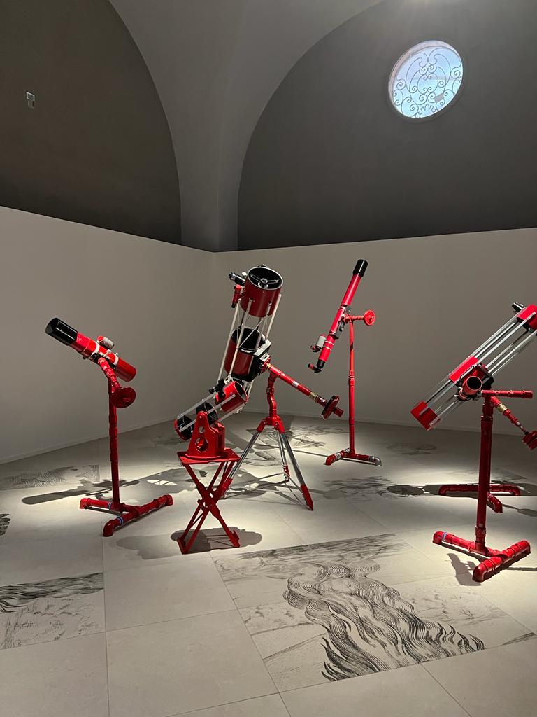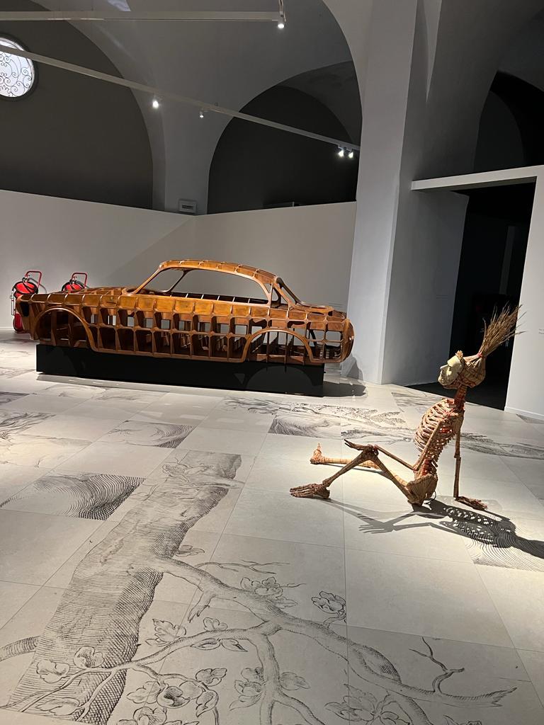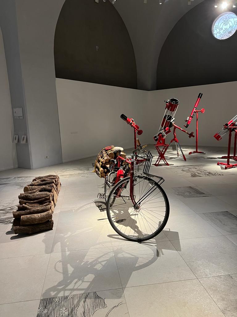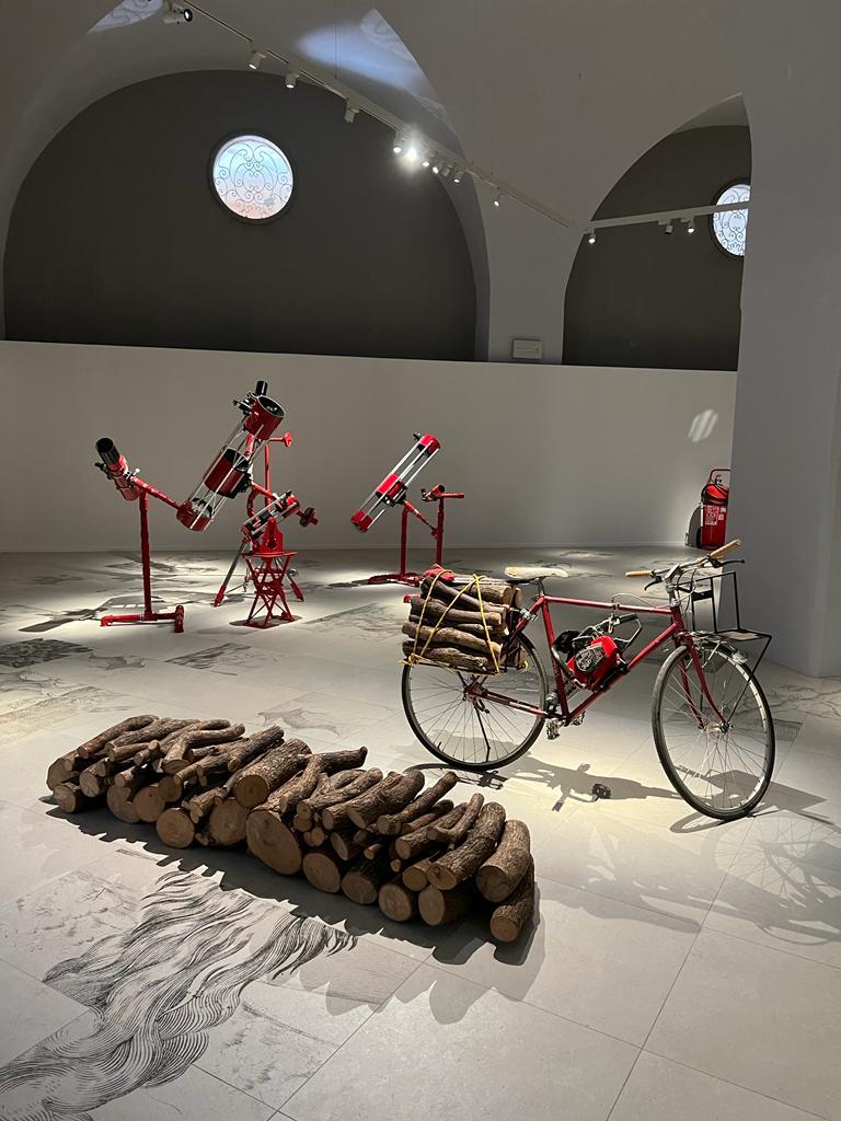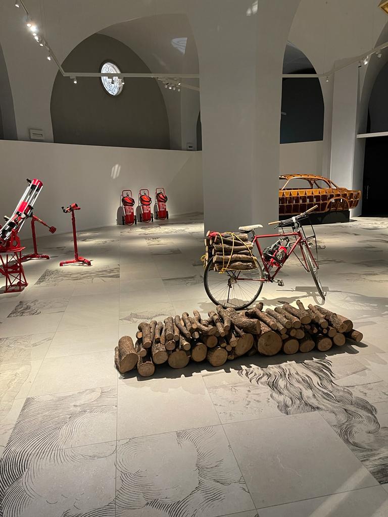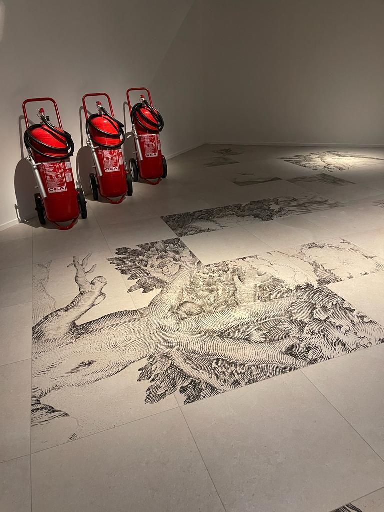 L'installation dialogue également avec des illustrations sélectionnées dans les pages des inestimables volumes de la Bibliothèque Estense et avec d'autres ouvrages de l'artiste. De sorte à inviter le visiteur à explorer l'incroyable scénographie. « Le sol est un labyrinthe qui mêle des fragments de xylographies des XVIIIe et XIXe siècles, agrandis à l'extrême, un collage métamorphique d'arbres, d'incendies et de nuages de fumée. Le ciel et la terre se transmuent en un immense feu, qui semble brûler et se consumer sous nos yeux, avec des images désormais familières, hélas, qui véhiculent l'idée d'une planète en état d'urgence et du changement climatique. L'objectif du projet est de créer une contextualisation historique de la situation actuelle. […] C'est un voyage dans le temps à travers nos responsabilités. »