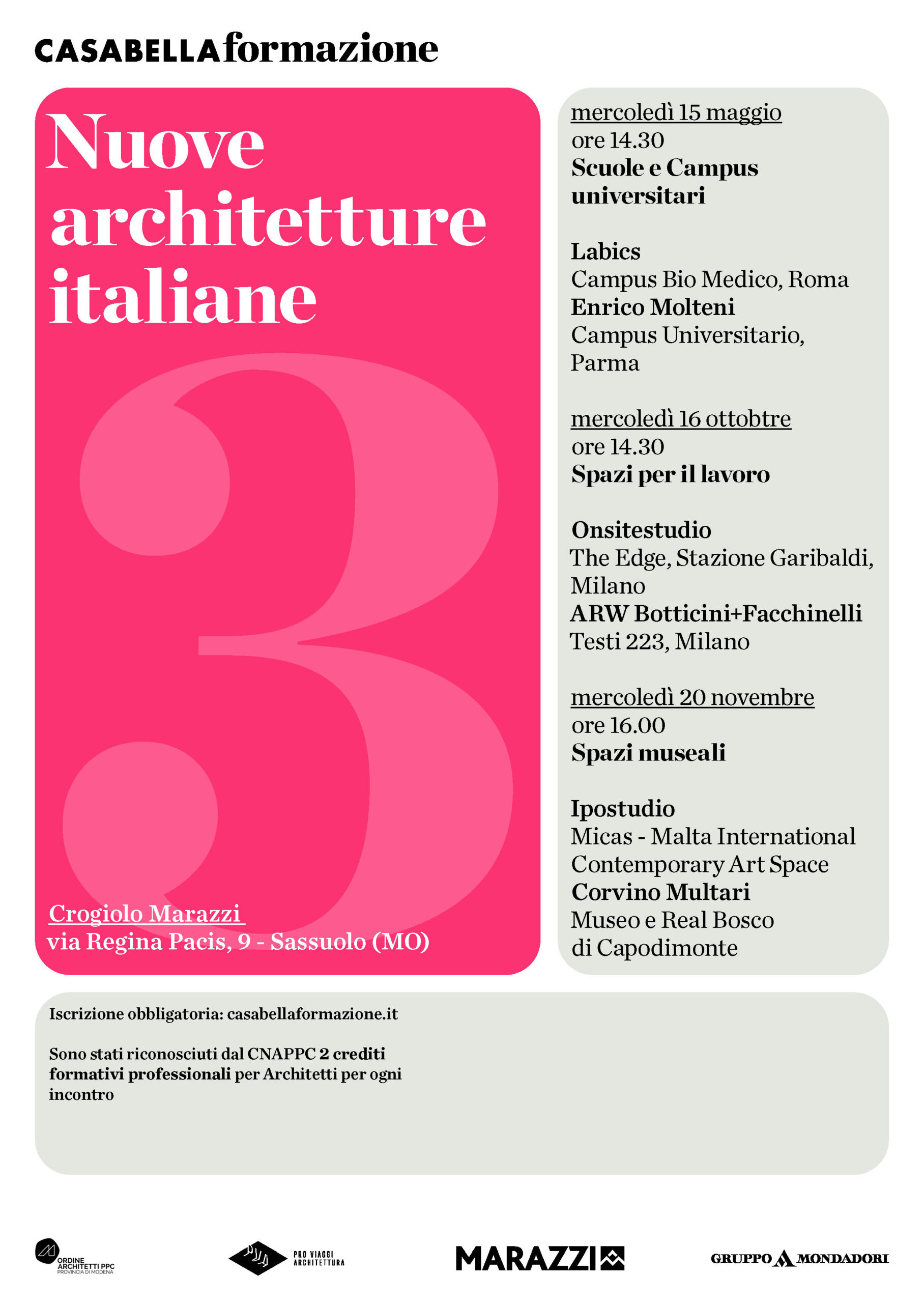 Les rencontres organisées par Marazzi en collaboration avec Casabella Formazione offrent aux professionnels du projet une occasion unique d’explorer les nouvelles frontières des architectures italiennes. À travers une série de rendez-vous motivants et formateurs, les participants pourront explorer les tendances émergentes de la scène architecturale italienne et examiner des projets innovants, des matériaux de pointe et des démarches de conception avancées.