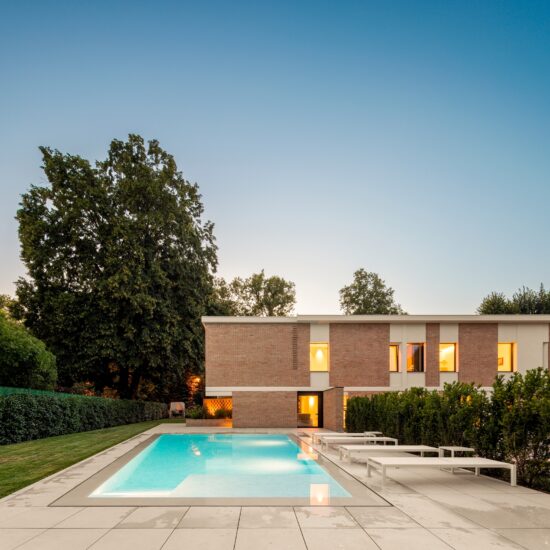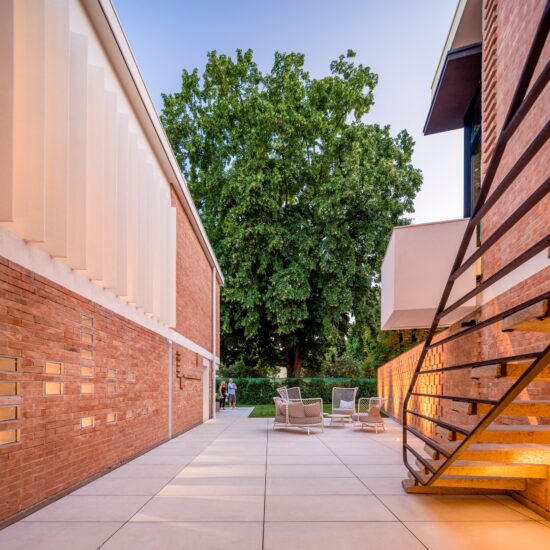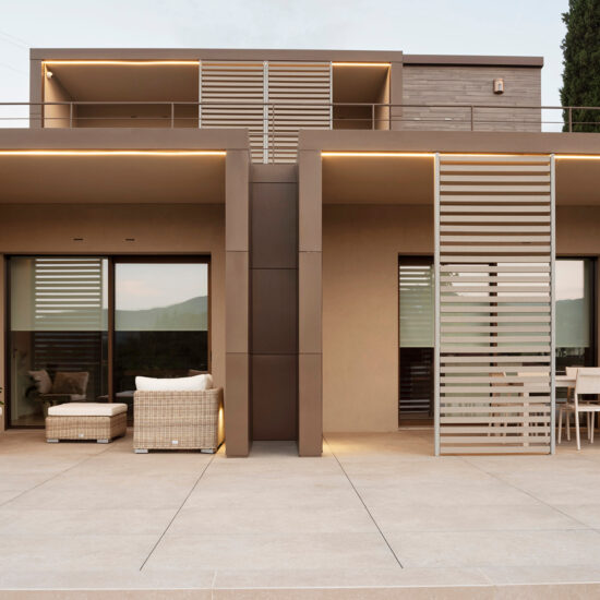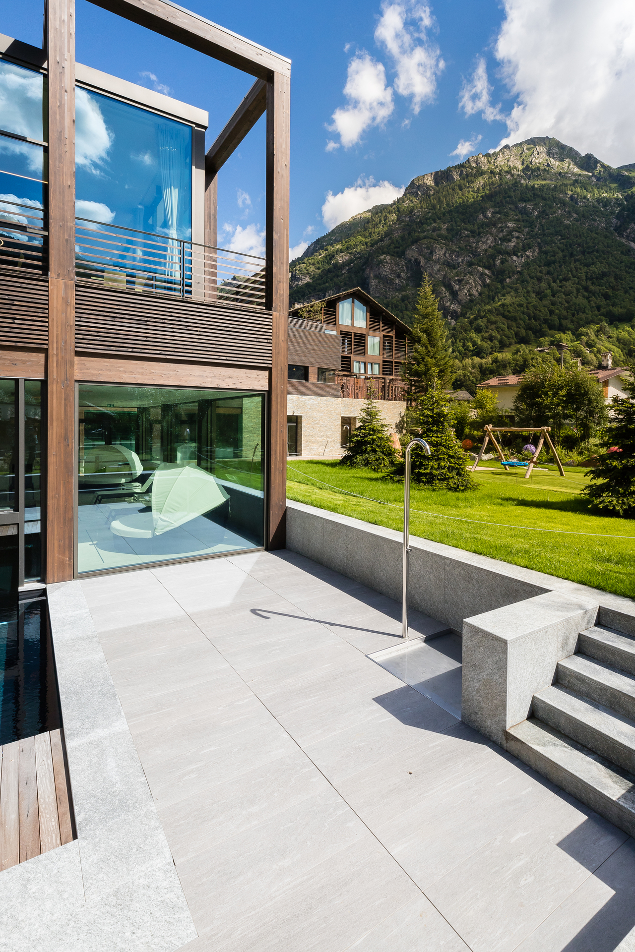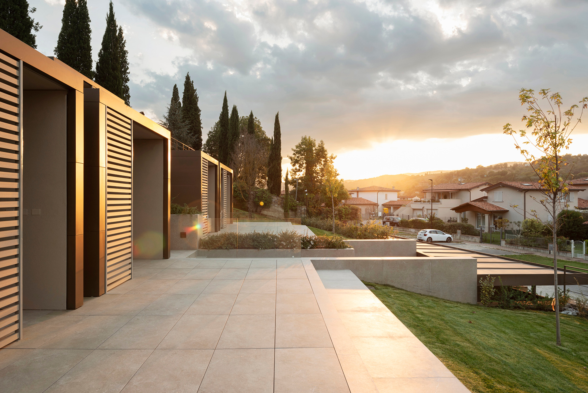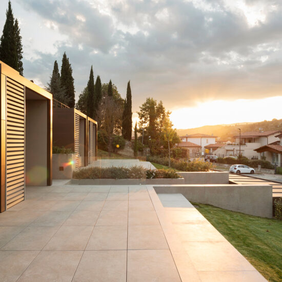 Le projet de Villa Levante, sur l’île d’Albarella (Rovigo, Italie), offre un autre exemple virtuose de l’utilisation du système flottant pour un sol en grès cérame. Dans ce cas, la collection Memento20 couleur Silver a été utilisée pour revêtir la terrasse, avec une imitation ciment très élégante obtenue notamment par un joint minimal entre les carreaux.