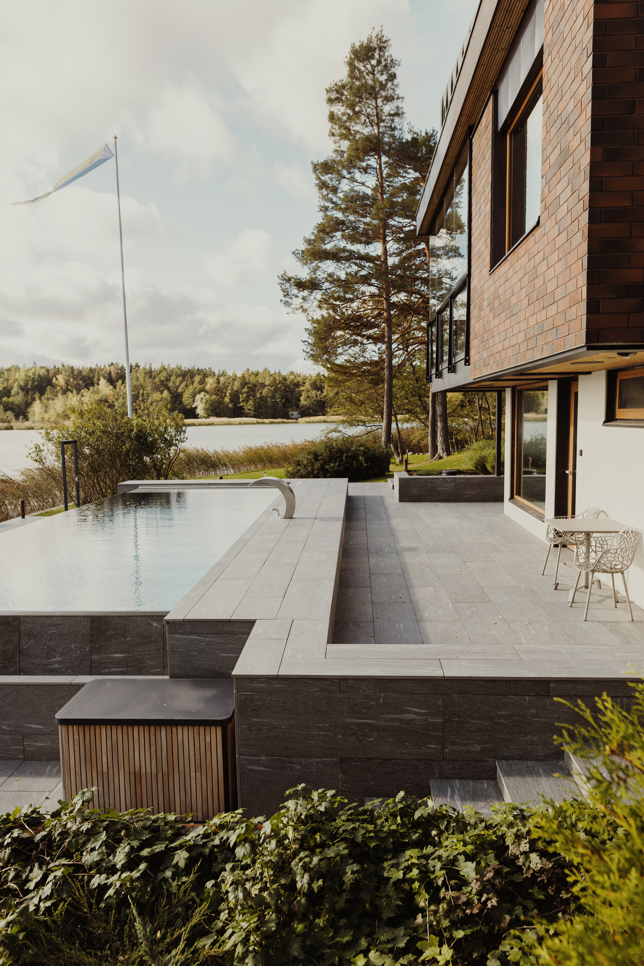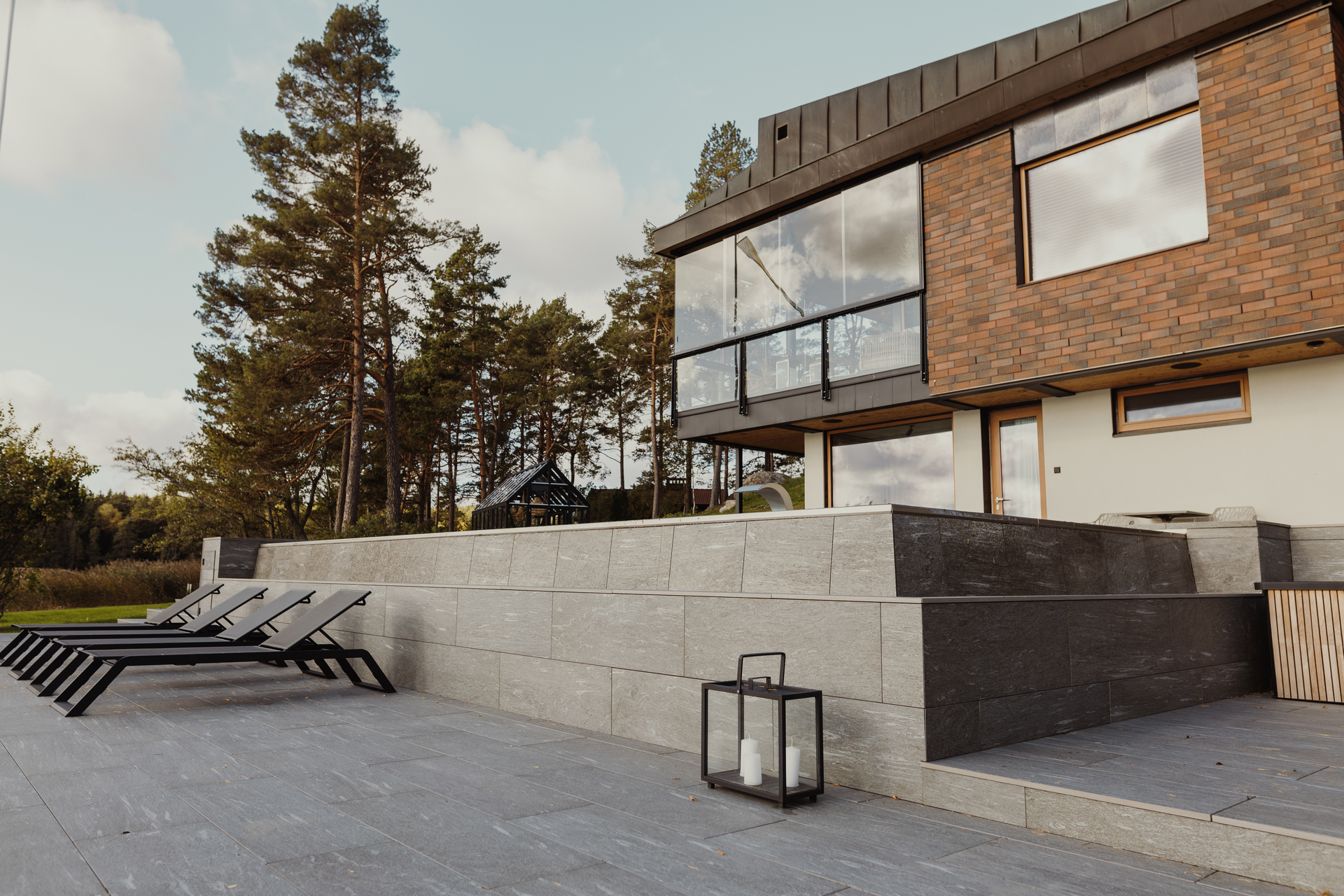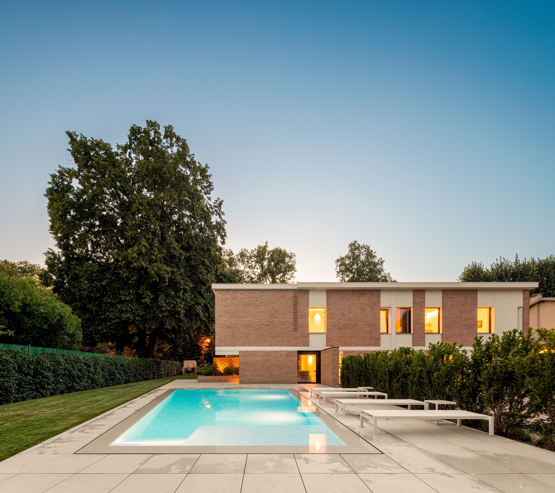 Le projet de Villa Levante, sur l’île d’Albarella (Rovigo, Italie), offre un autre exemple virtuose de l’utilisation du système flottant pour un sol en grès cérame. Dans ce cas, la collection Memento20 couleur Silver a été utilisée pour revêtir la terrasse, avec une imitation ciment très élégante obtenue notamment par un joint minimal entre les carreaux.