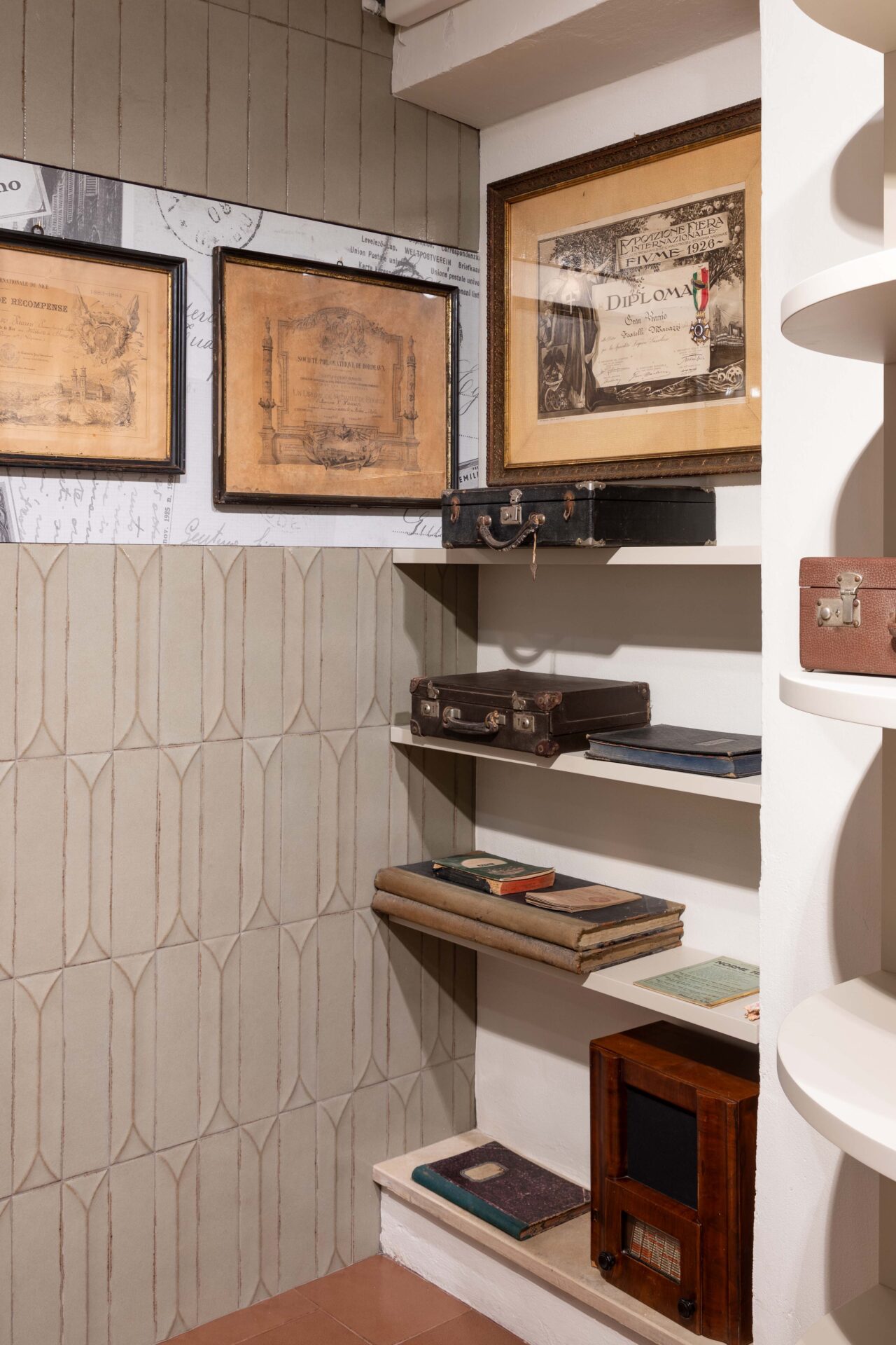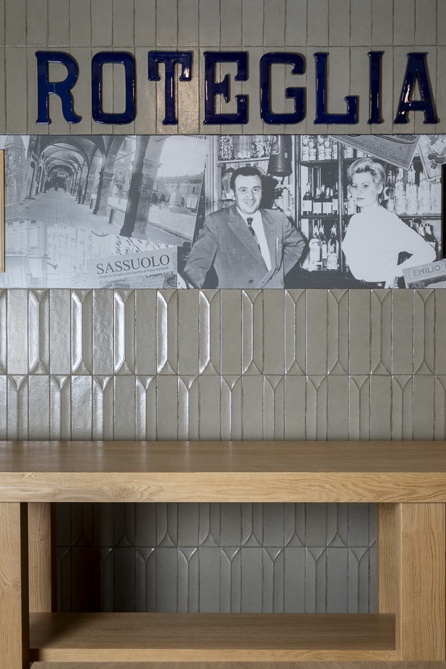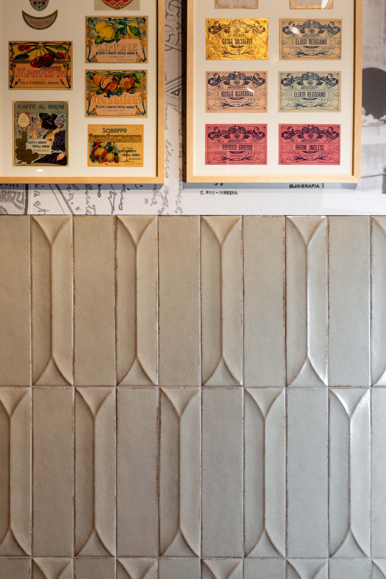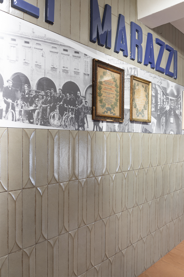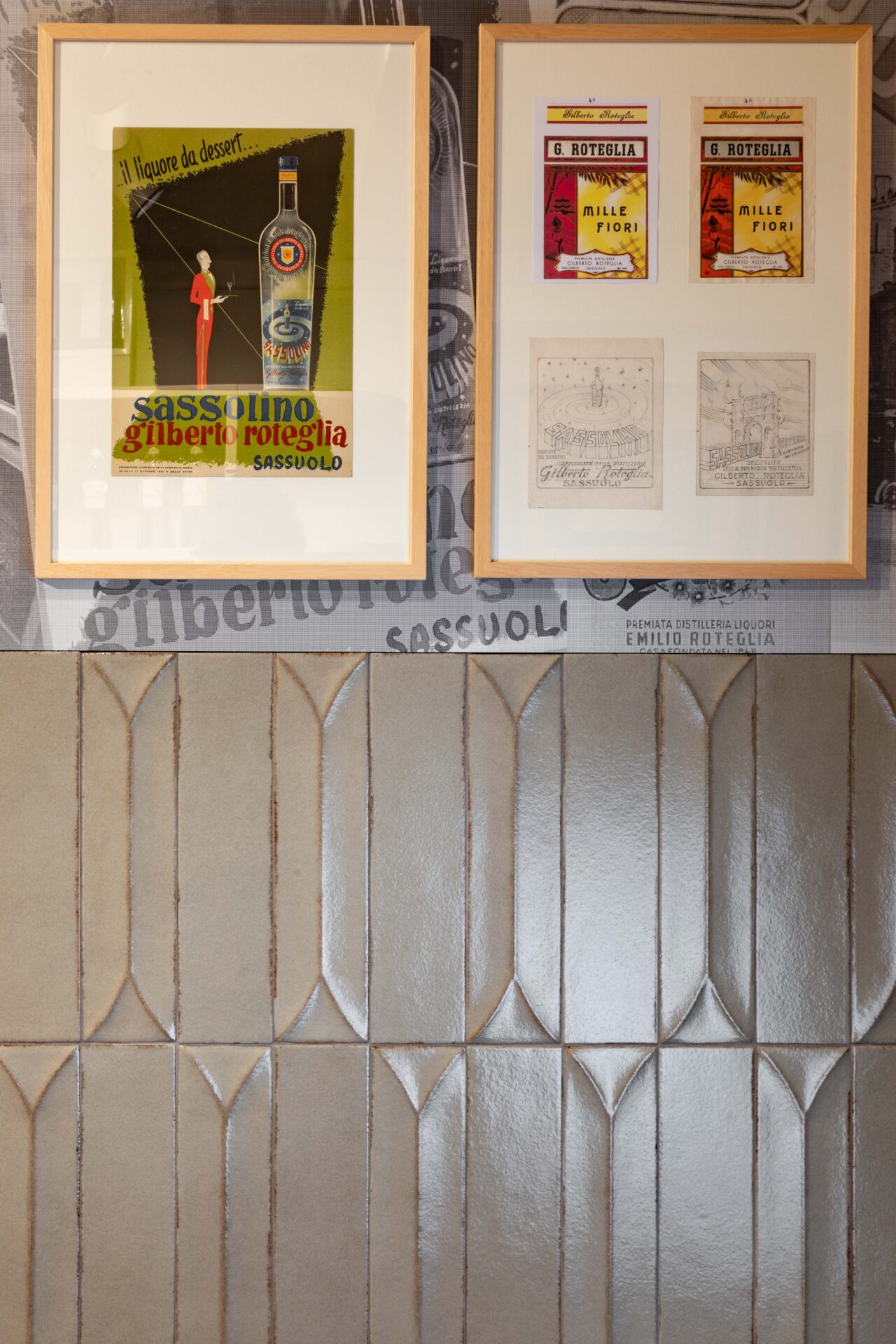 Les deux murs en grès Terramater couleur mousse célèbrent l’histoire de l’épicerie et le lien avec Marazzi : photos, cartes postales vintage de la Piazza Garibaldi et de l’épicerie gérée par la famille Roteglia, prix et reconnaissances pour la liqueur Sassolino obtenus par les Marazzi et les gestions précédentes de l’activité jusqu’aux étiquettes historiques des liqueurs et distillats produits par les Marazzi et les Roteglia et les suggestives lettres en céramique émaillée de couleur bleue qui composaient l’inscription Fratelli Marazzi sur les arcades de la place et servaient d’enseigne.