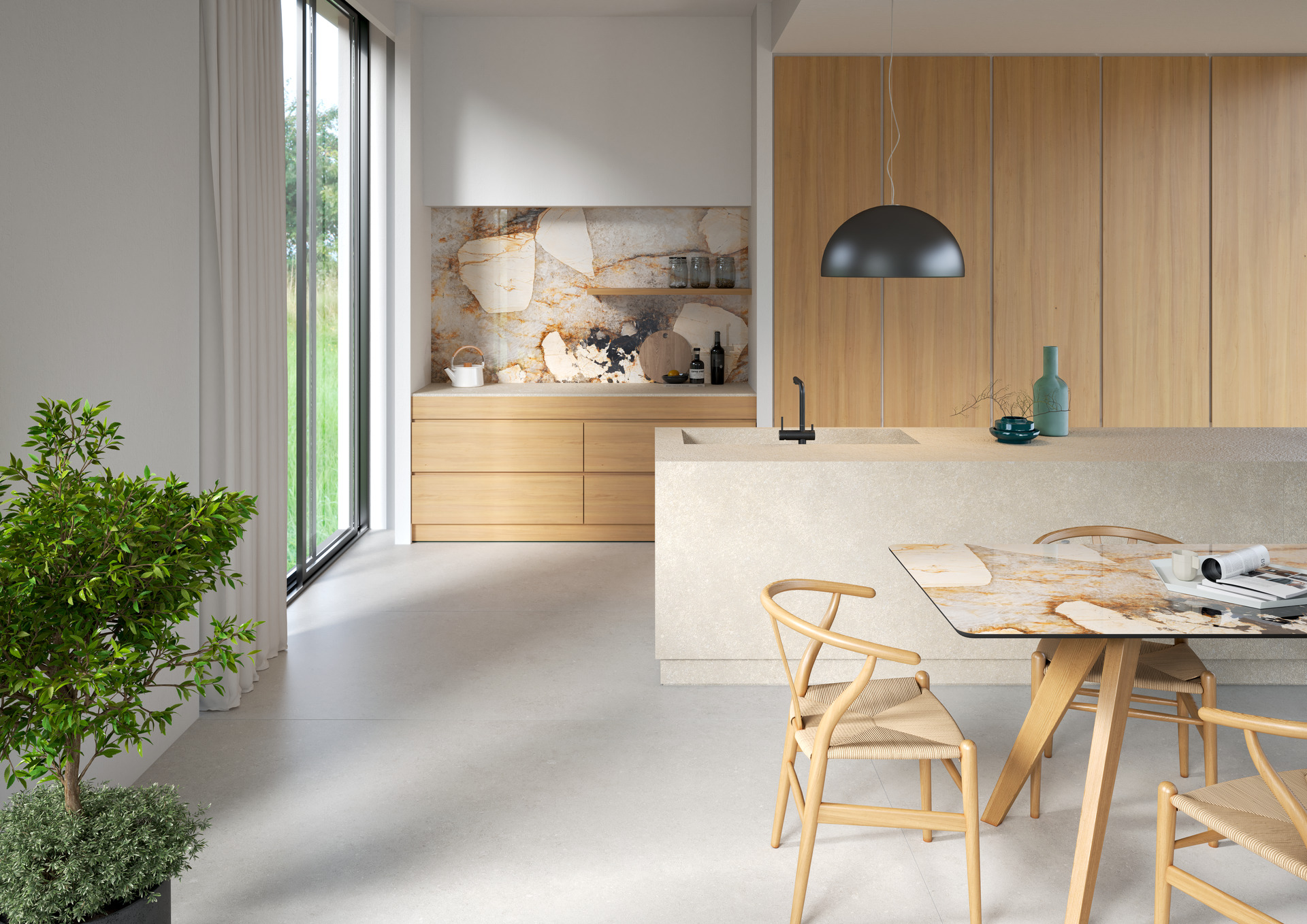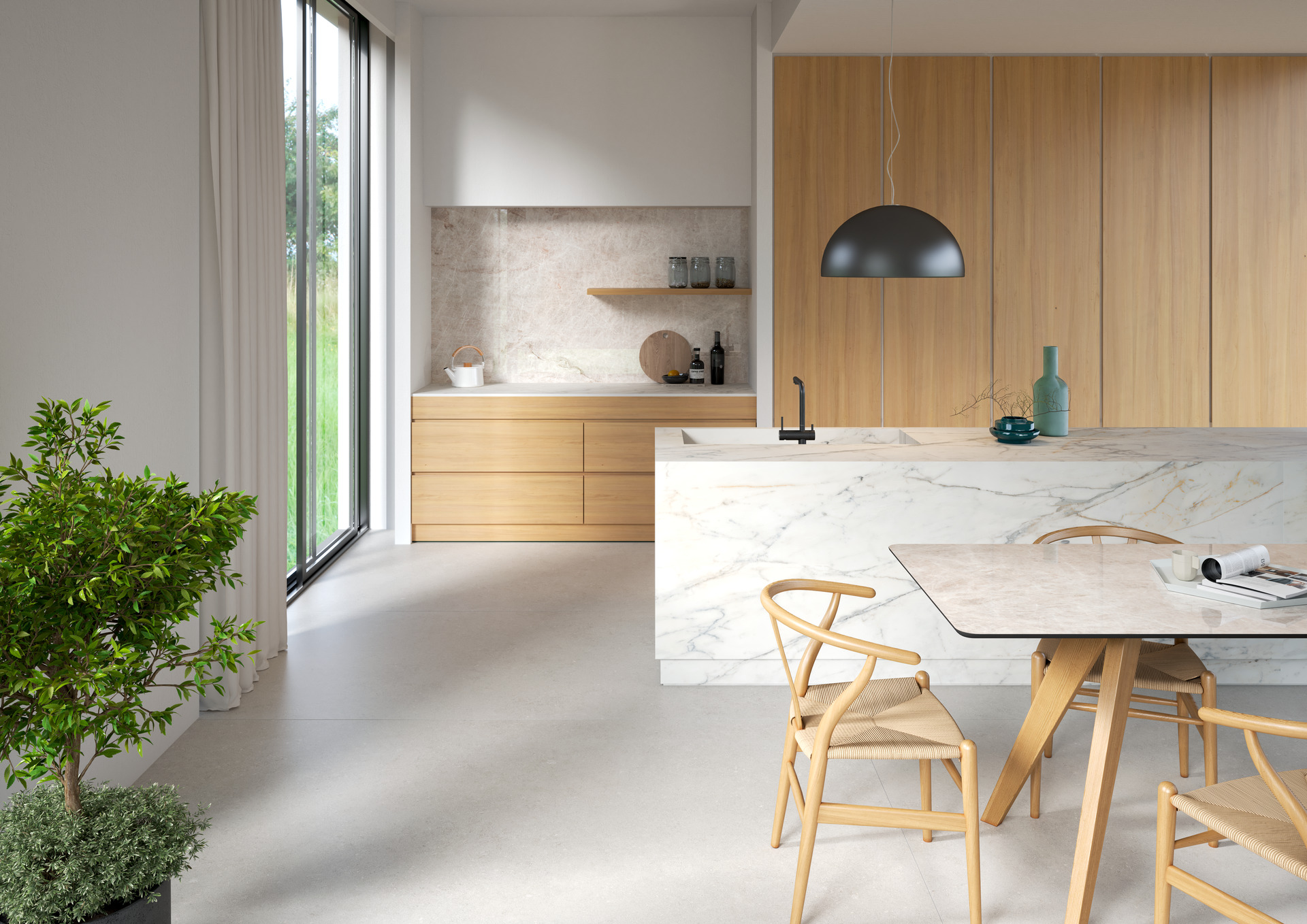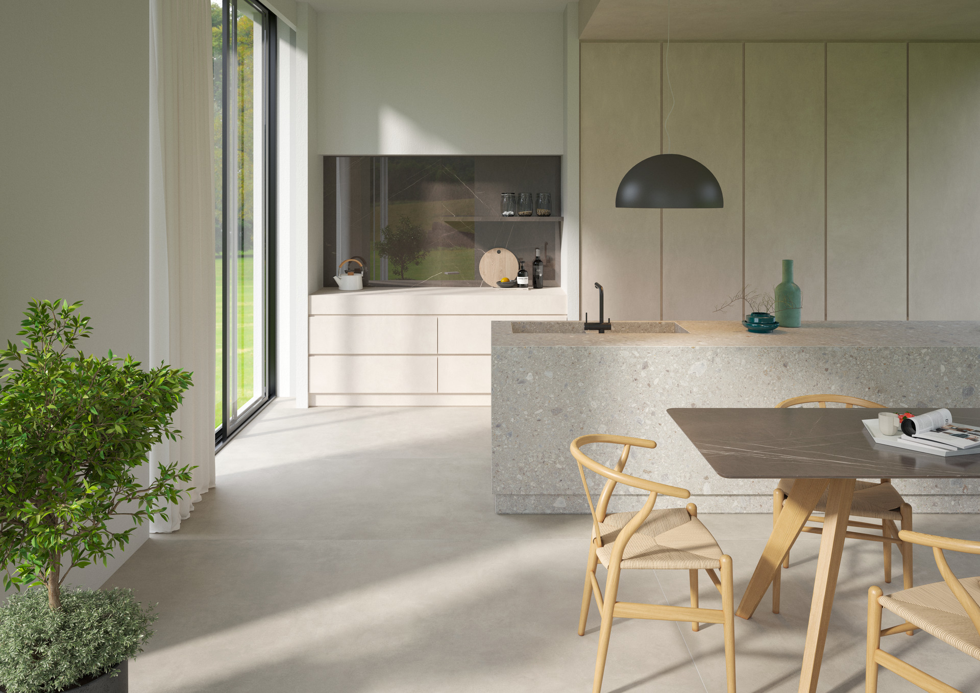 Des intérieurs dont les cuisines dynamiques et ouvertes s’intègrent à l’espace de vie du séjour : une tendance née dans les appartements urbains en raison du manque de mètres carrés. Ces espaces multifonctionnels expriment le besoin d’un mode d’habiter fluide, entre public et privé, entre travail agile et vie quotidienne. Le choix des matériaux est axé sur la facilité de gestion et la polyvalence : le grès cérame garantit des surfaces sûres et résistantes, notamment au contact des aliments, grâce à la technologie Premium Puro Marazzi Antibacterial, à appliquer largement de la cuisine aux éléments du séjour.