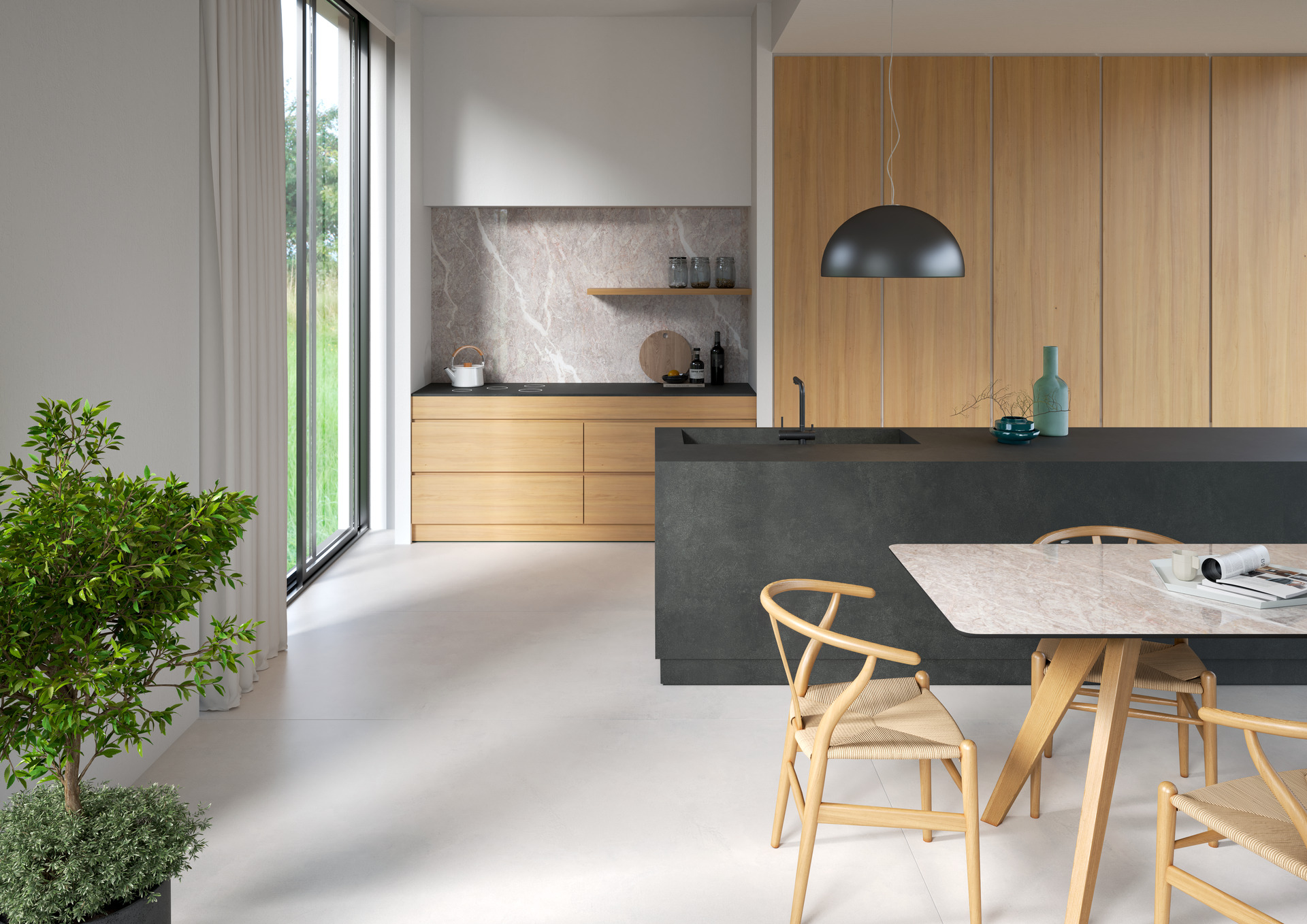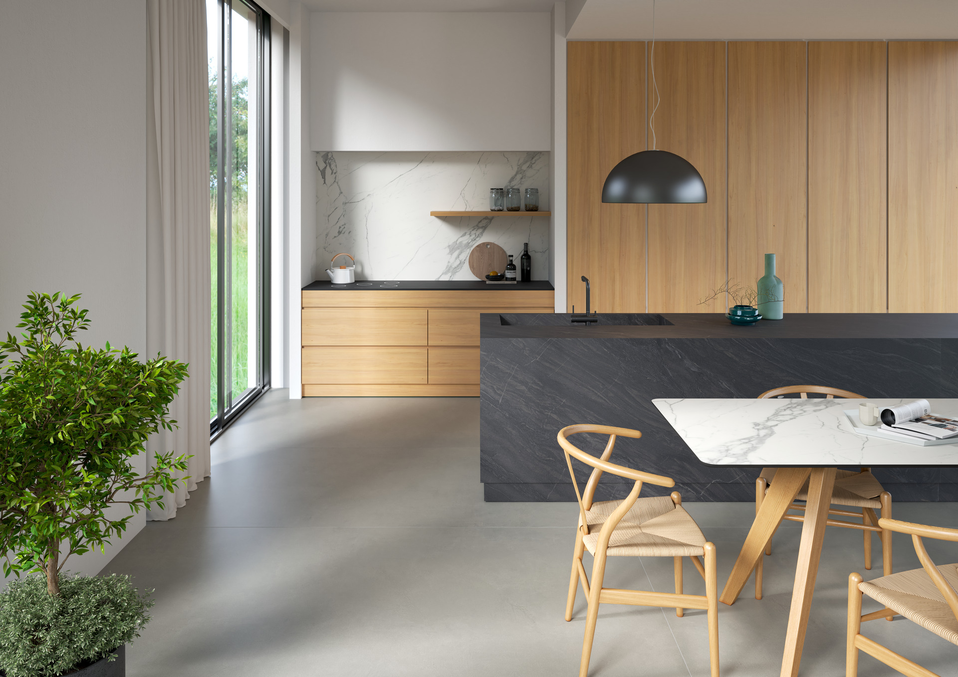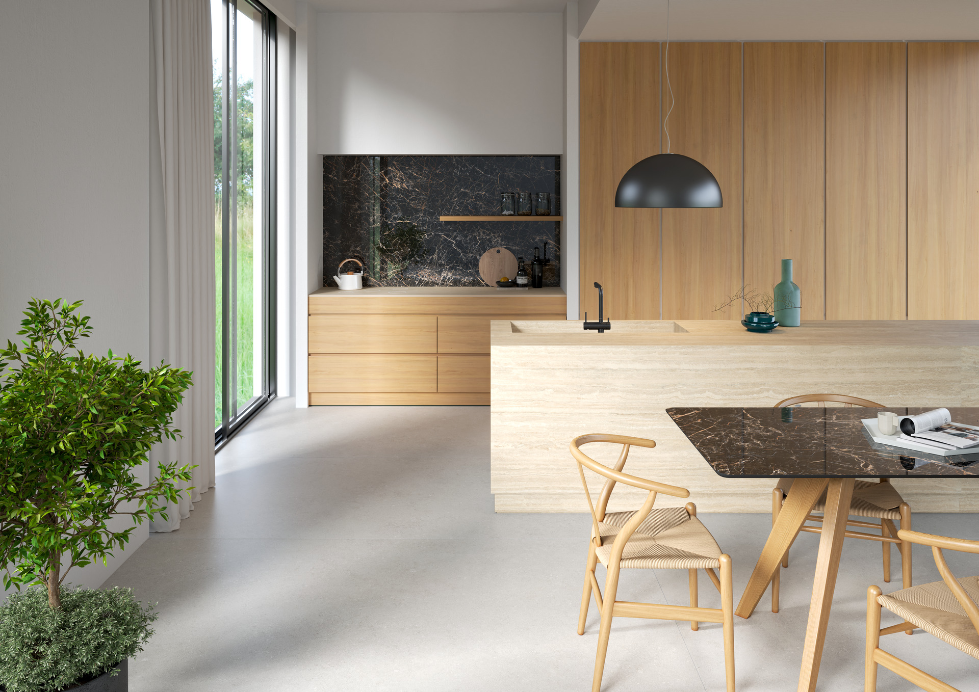 Les dalles grand format de Marazzi The Top soulignent l’importante présence décorative du grès cérame. Applicables des plans de travail aux crédences des zones de travail, des tables aux revêtements verticaux des meubles de rangement, les collections permettent de créer des solutions d’ameublement sur mesure aux multiples personnalités : par exemple, on peut associer l’étonnante fidélité des détails de Wood Look à la texture chaude et poreuse du travertin ou encore aux veines dessinées et ombrées des précieux marbres polychromes, créant ainsi des revêtements verticaux à l’aspect vibrant. Le choix d’effets marbre plus traditionnels, comme Statuario ou Calacatta, permet d’inscrire la tradition dans des cadres contemporains plus minimalistes.